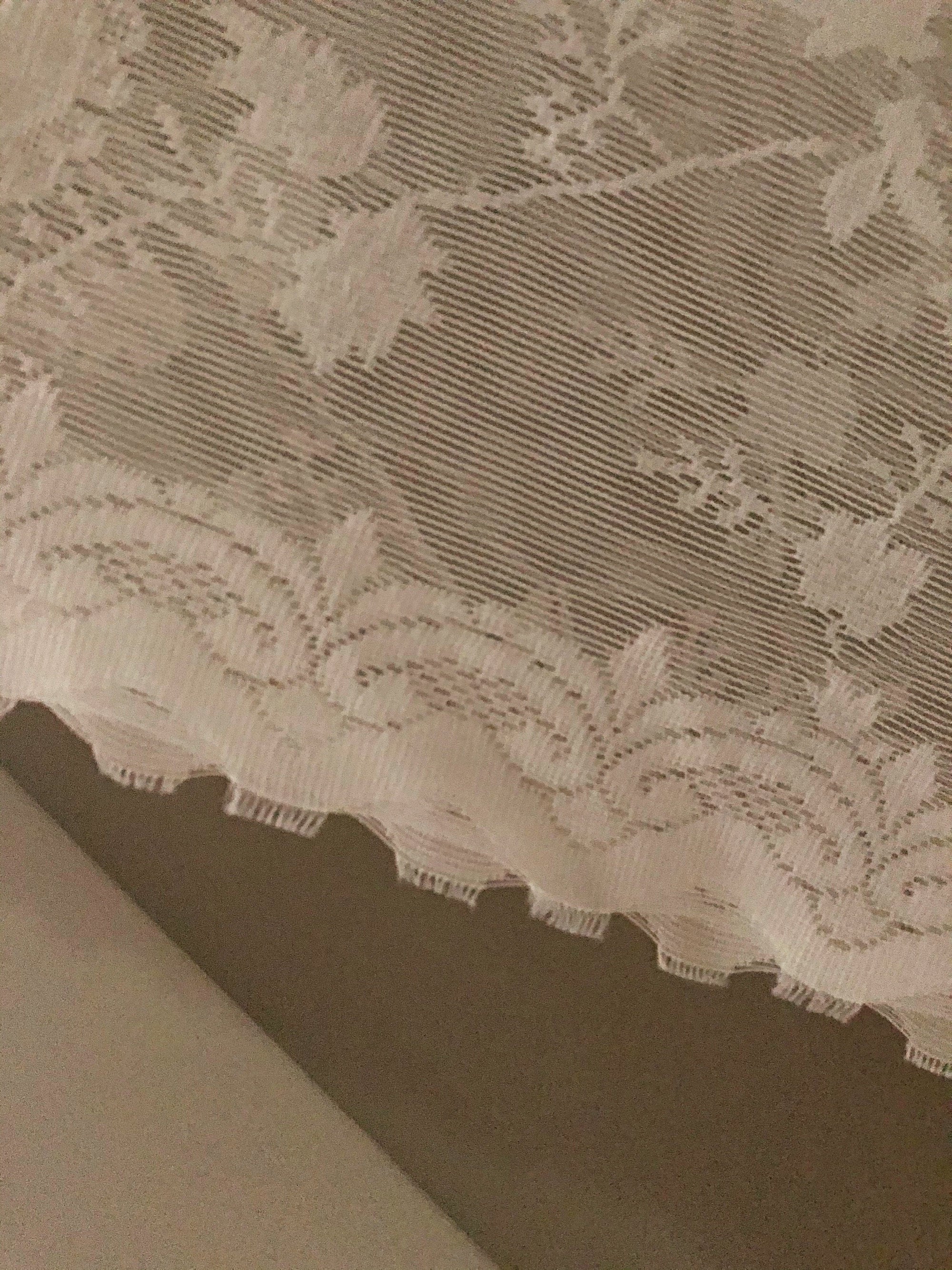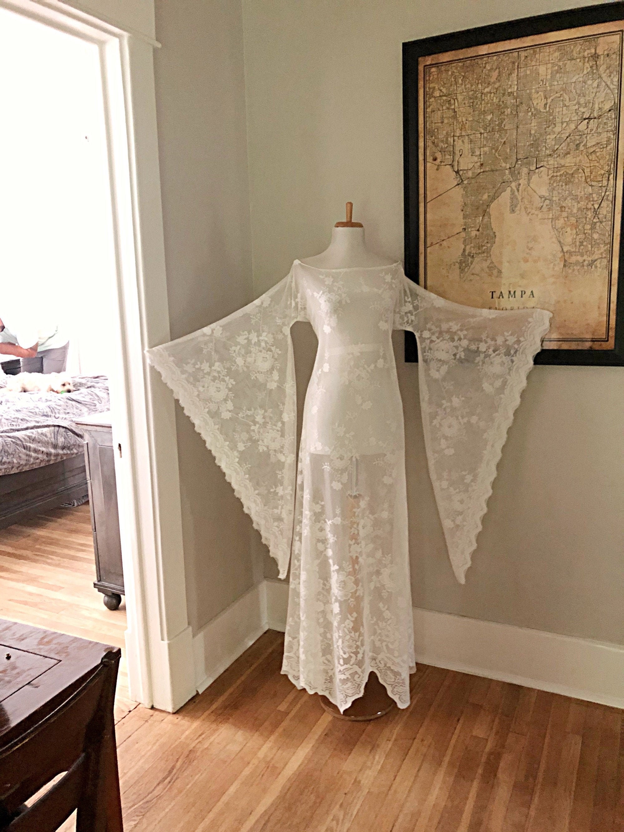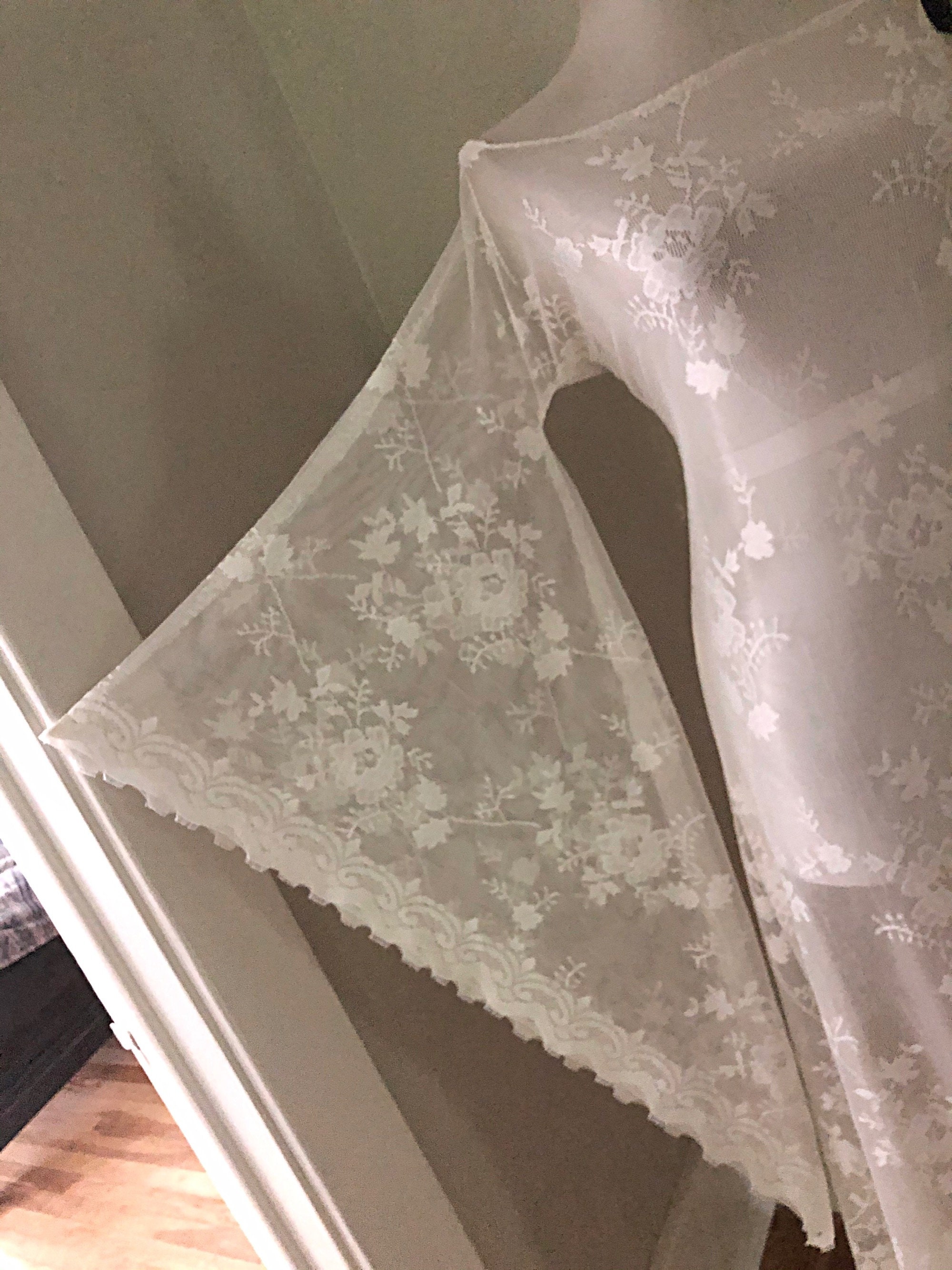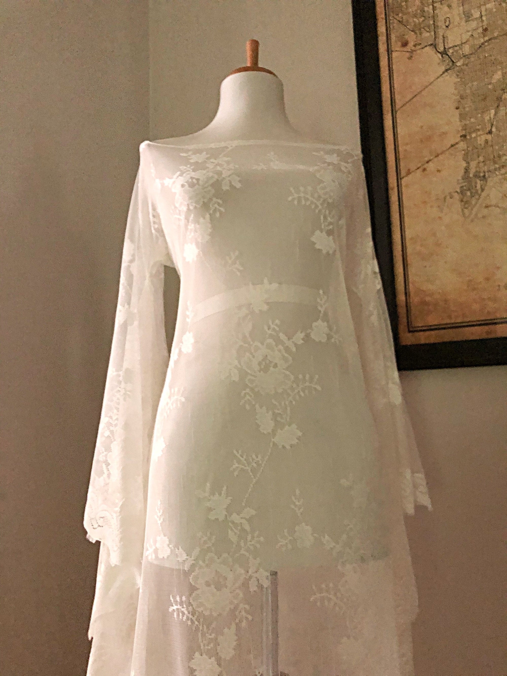 This dress is made with a cream or off-white cut-out sheer crochet lace that is most likely a cotton blend, nylon or polyester/poly-blend. This has an embroidered raised floral pattern. This would be perfect for a boho bride or a desert wedding. Also a great look at the summer music festivals. This dress is unlined with huge bell /angel sleeves, a feminine neckline (may be off the shoulder), sheer peek-a-boo crochet lace, and a sexy feminine cut. This goes over the head (no zipper). This has uncomplicated side seams that could easily be taken in if this is too big. The front and the back are the same.