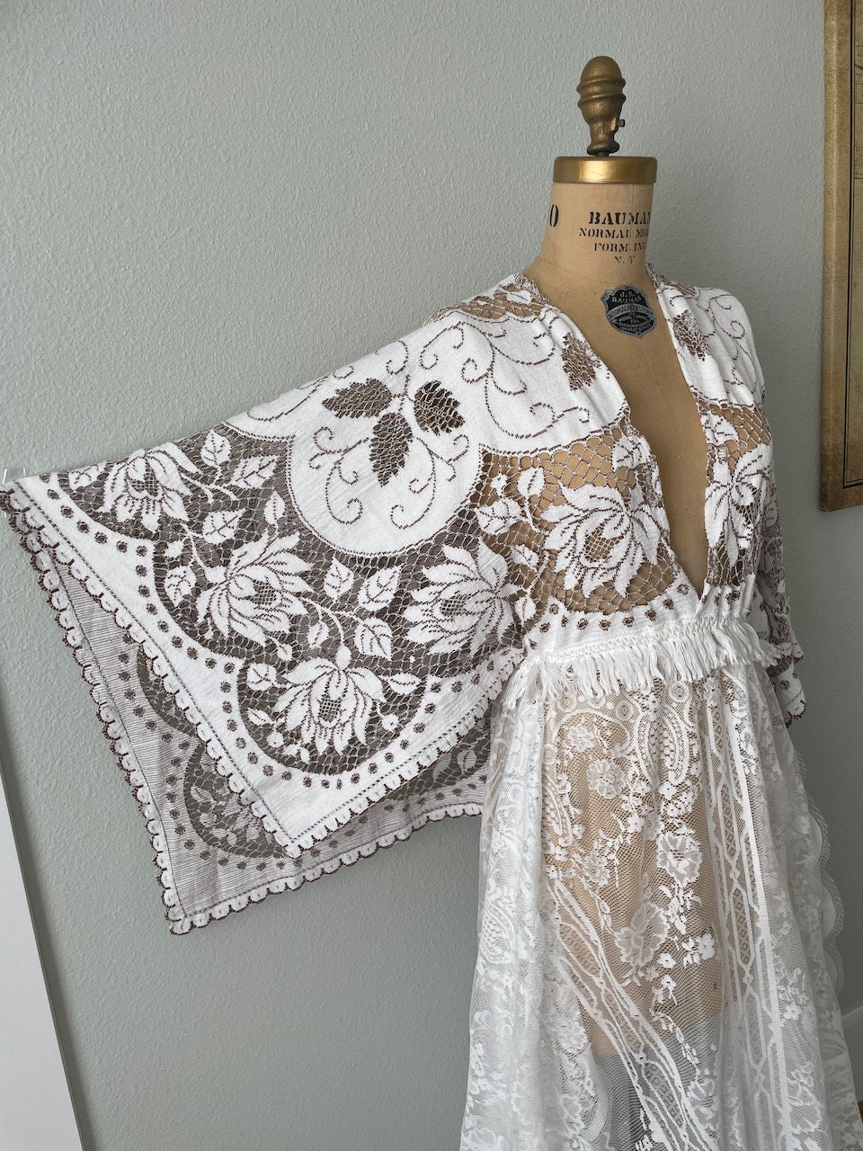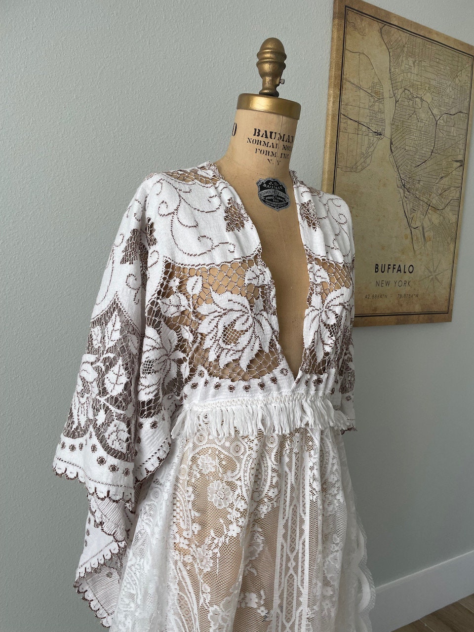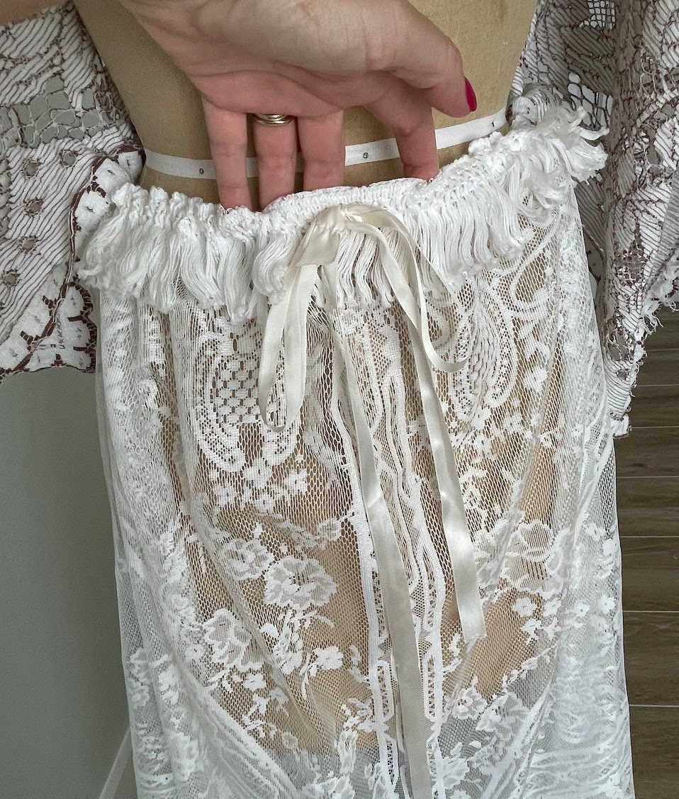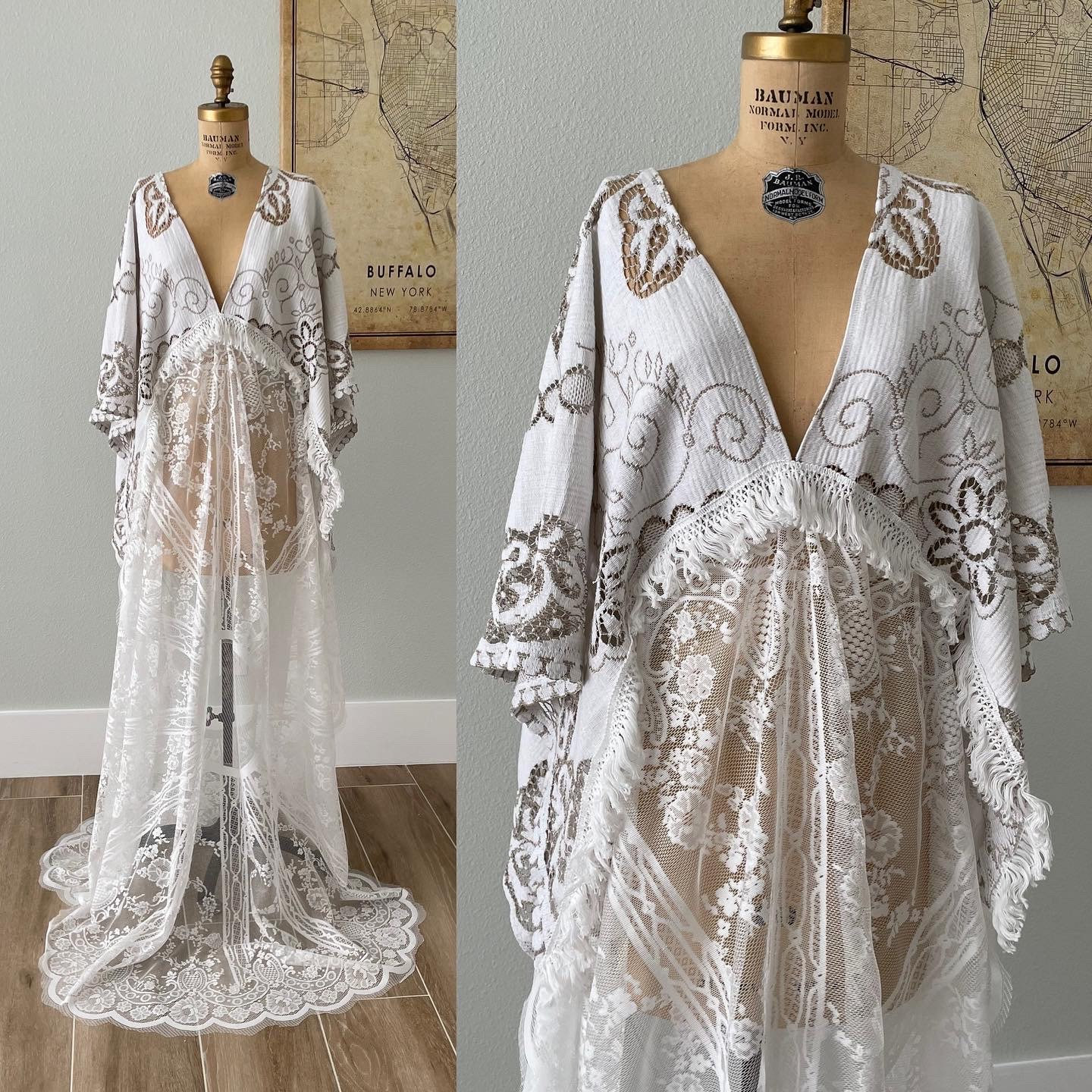 This boho deep v draped wedding photoshoot dress is made with two tone vintage cotton lace on top, and a sheer synthetic white lace for the skirt. The lace on top is vintage and no two pieces are the same. It will be two tone, beige and white or brown and white. This has a deep v plunging bodice, fringe and a sheer lace skirt. This style is popular for boho rustic weddings and maternity outdoor photoshoots. This bohemian draped gown will work for a bunch of different sizes and occasions. I made the waist adjustable.