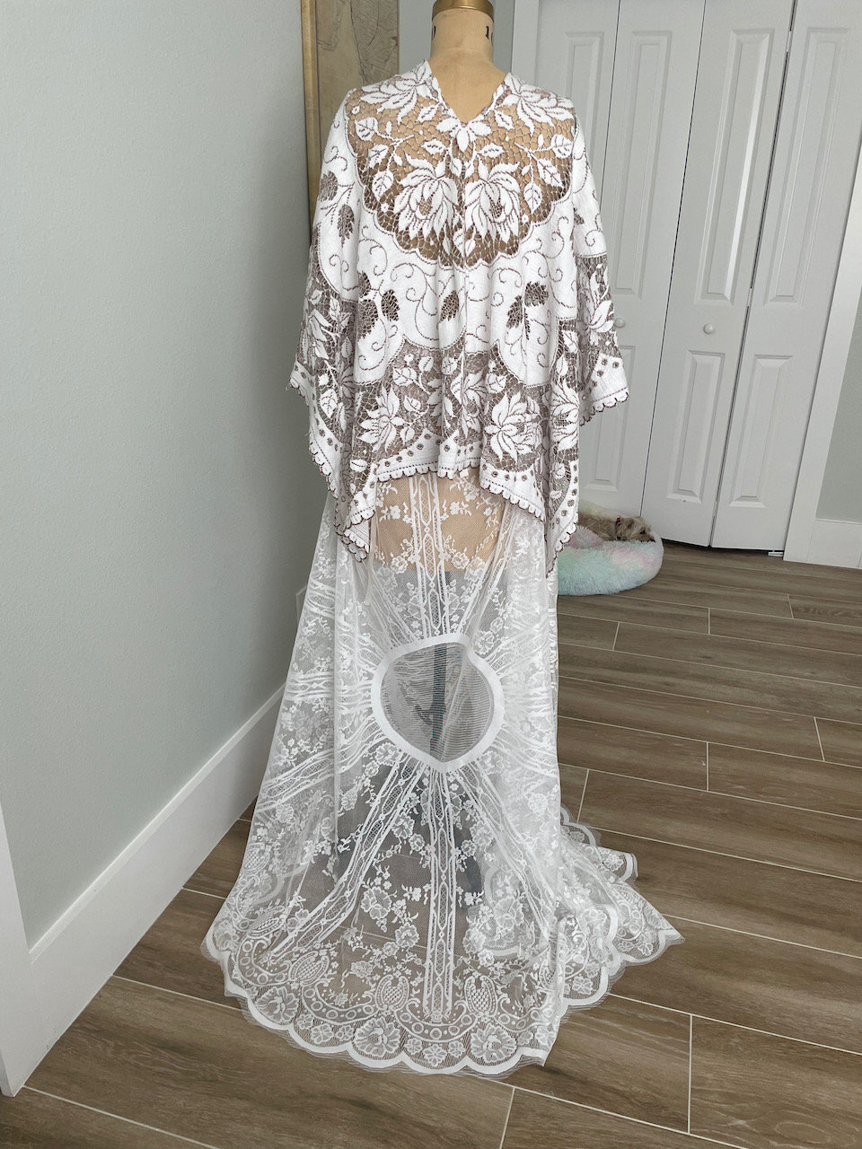 This dress is unlined with huge bell /angel wing sleeves that are long in back with fringe, a sexy plunging deep v neckline and back, and a draped skirt. There are a few variations in the photos, unless discussed ahead of time, I’ll use my best judgment based on the lace I am working with.