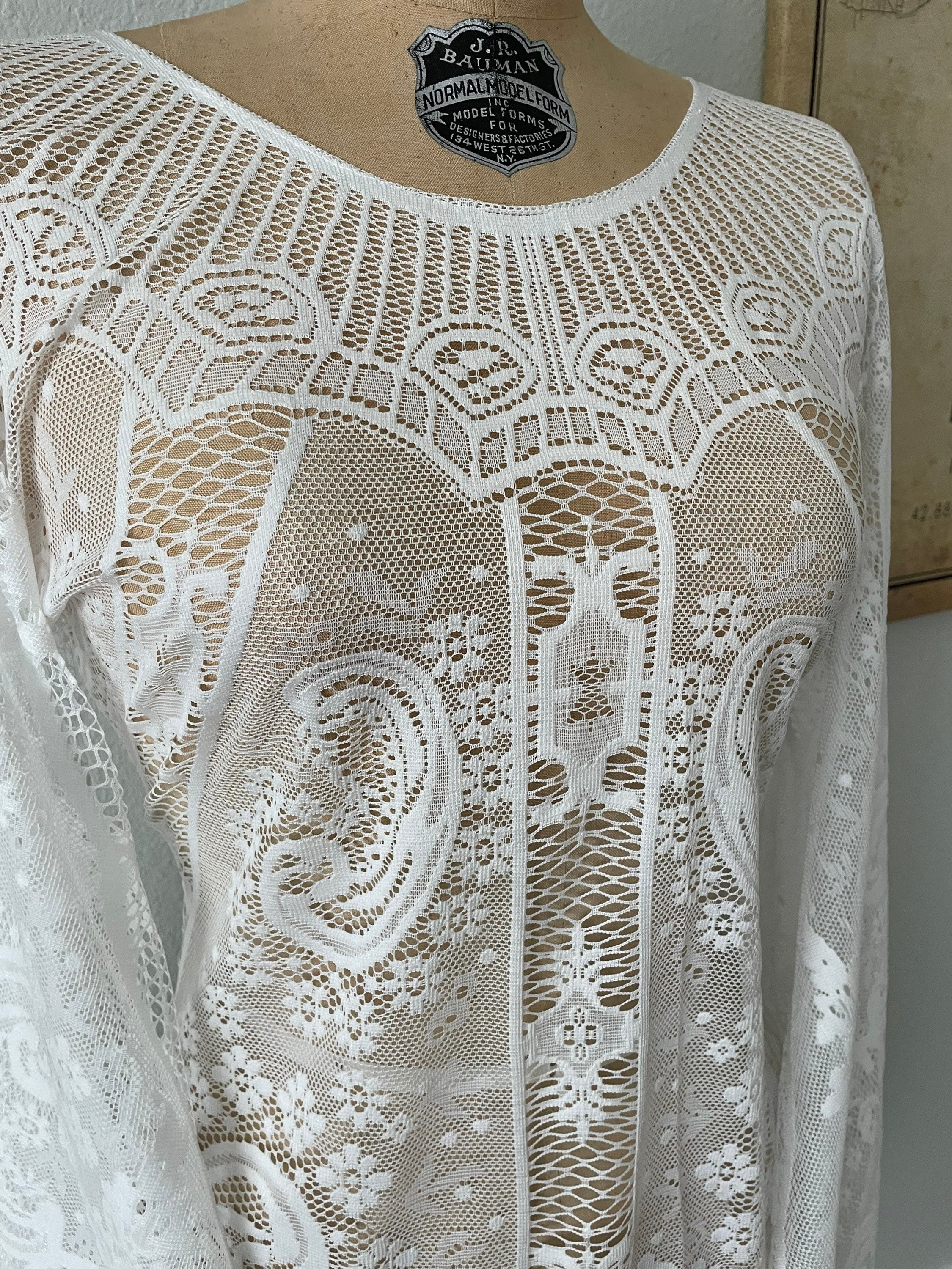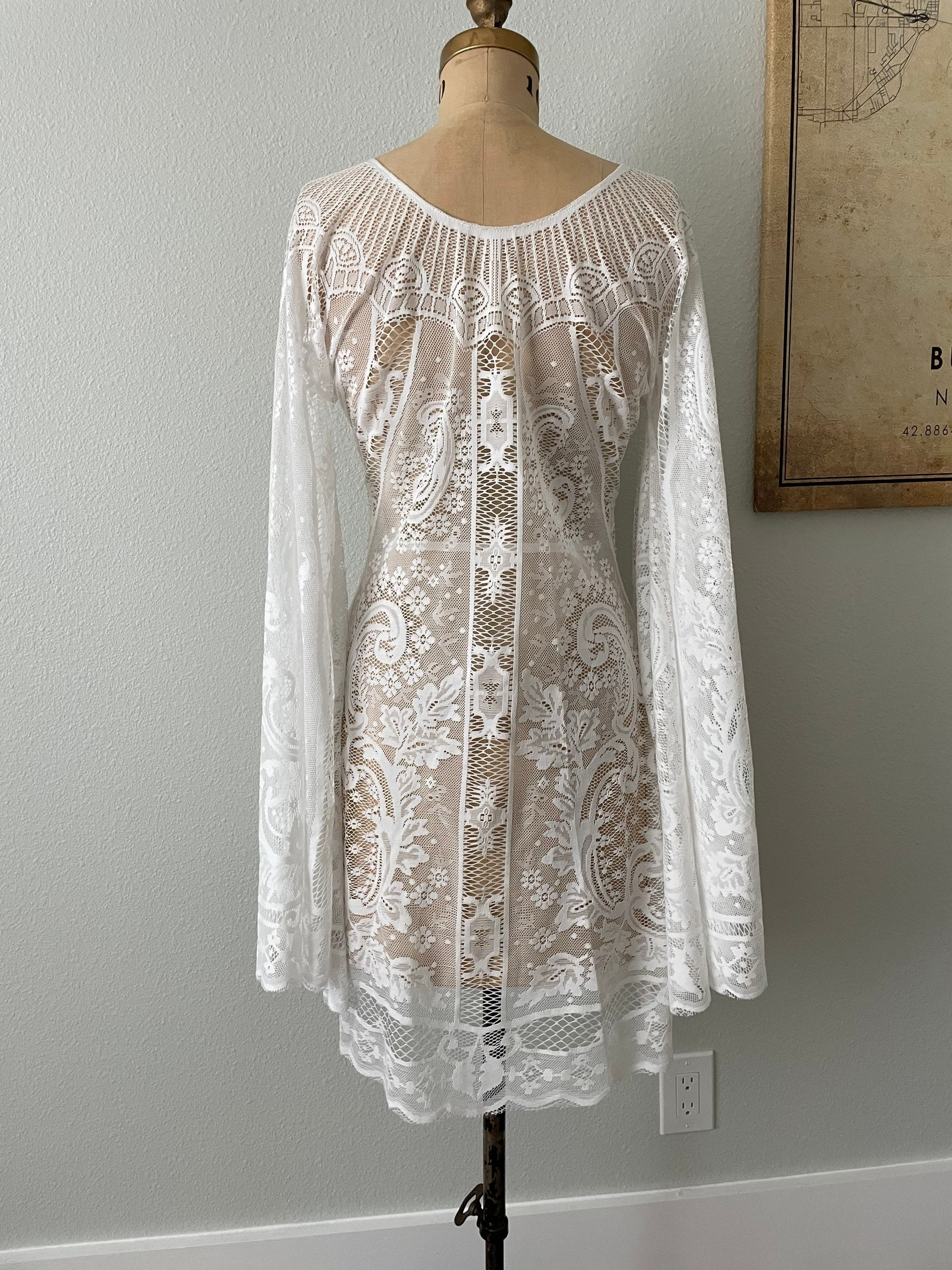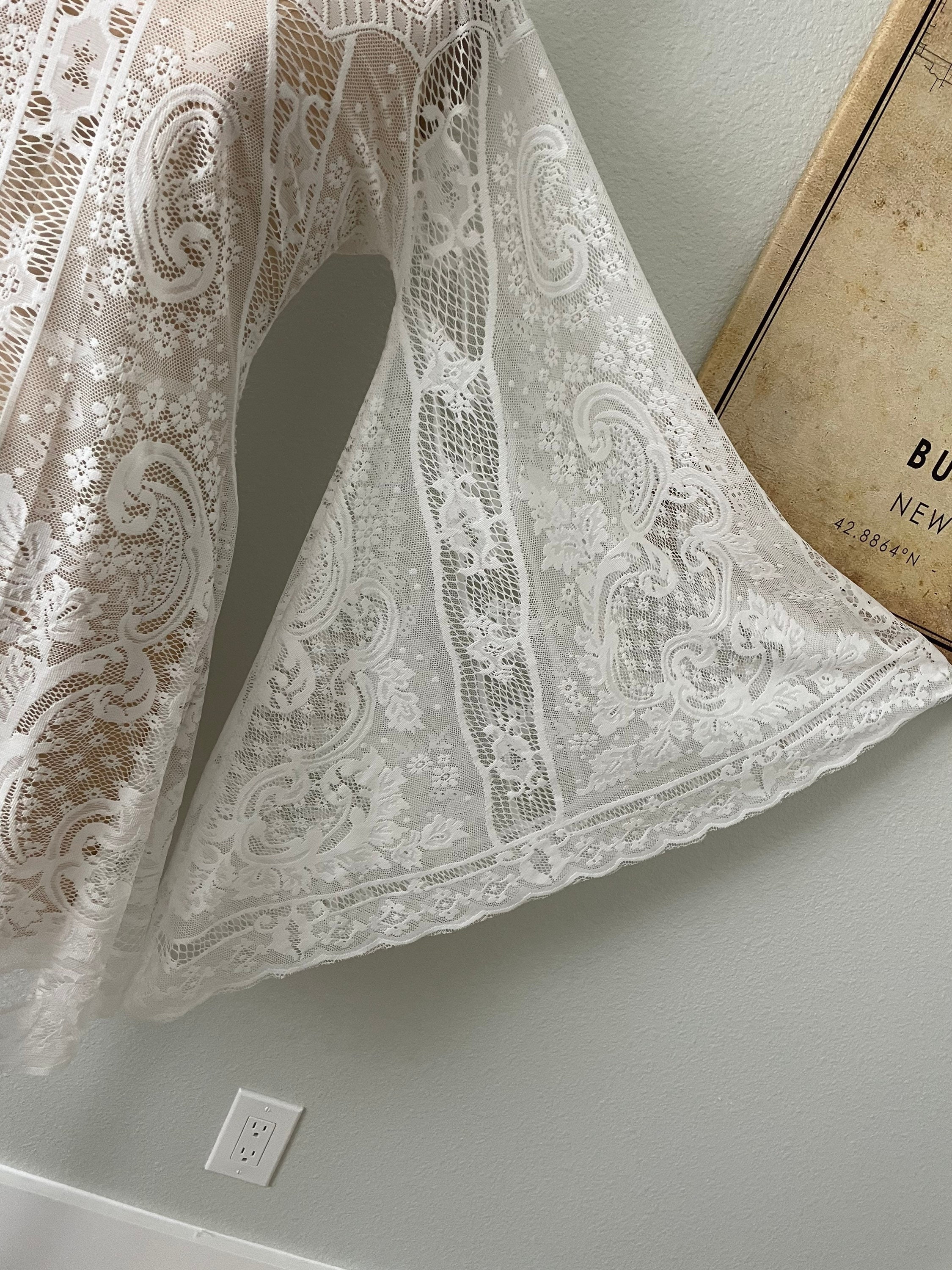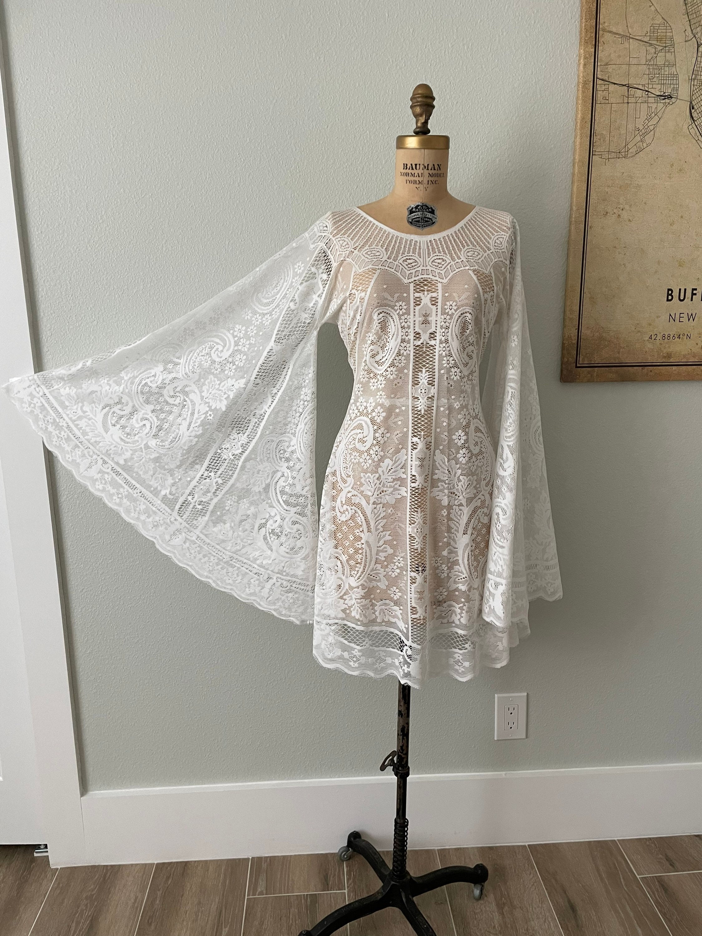 This unique and simple boho wedding, elopement or reception dress has long bell sleeves, and a feminine neckline. This bridal dress is made with white / off-white cotton blend or synthetic vintage lace. The dress is unlined, the front and back are the same and it goes over the head (no zipper). This has uncomplicated side seams that could easily be taken in if this is too big. * I offer alterations*