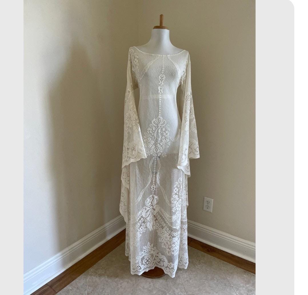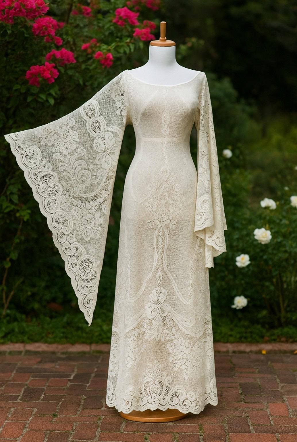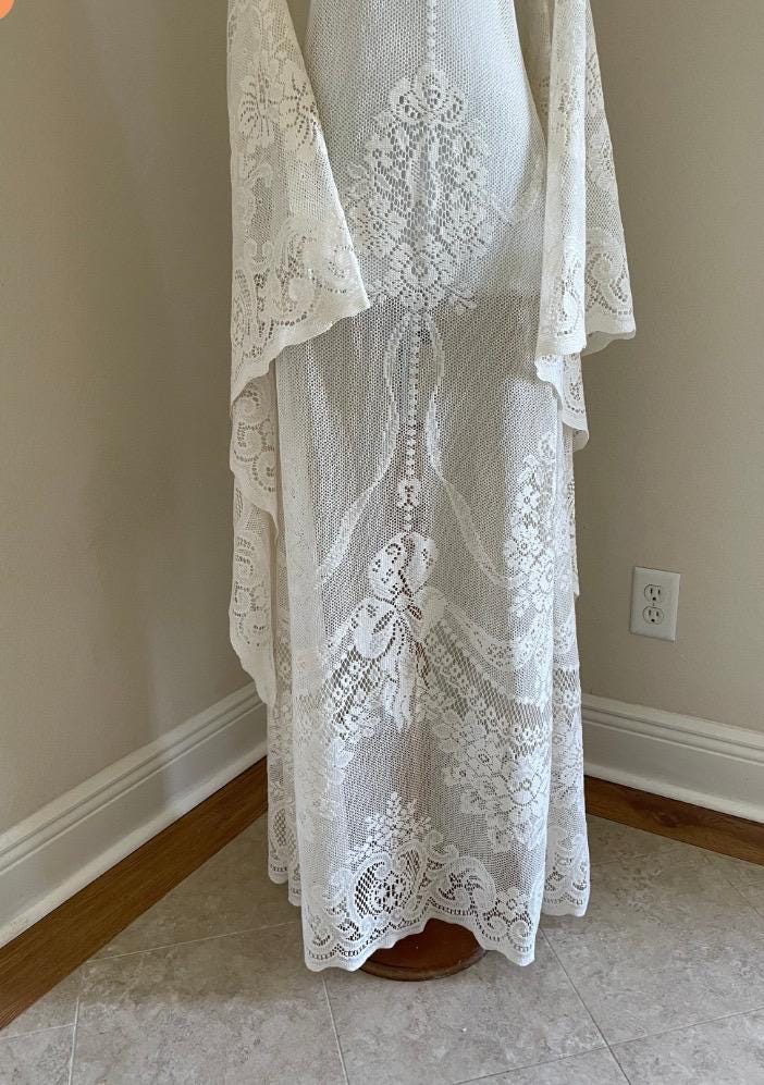 • Color: Cream (sheer) White also available • Fabric: Vintage cotton-blend lace (very limited supply) • Sleeves: Bell / angel sleeves • Back: Pull-on style (no zipper) • Unlined: typically worn with a strapless slip (not included)