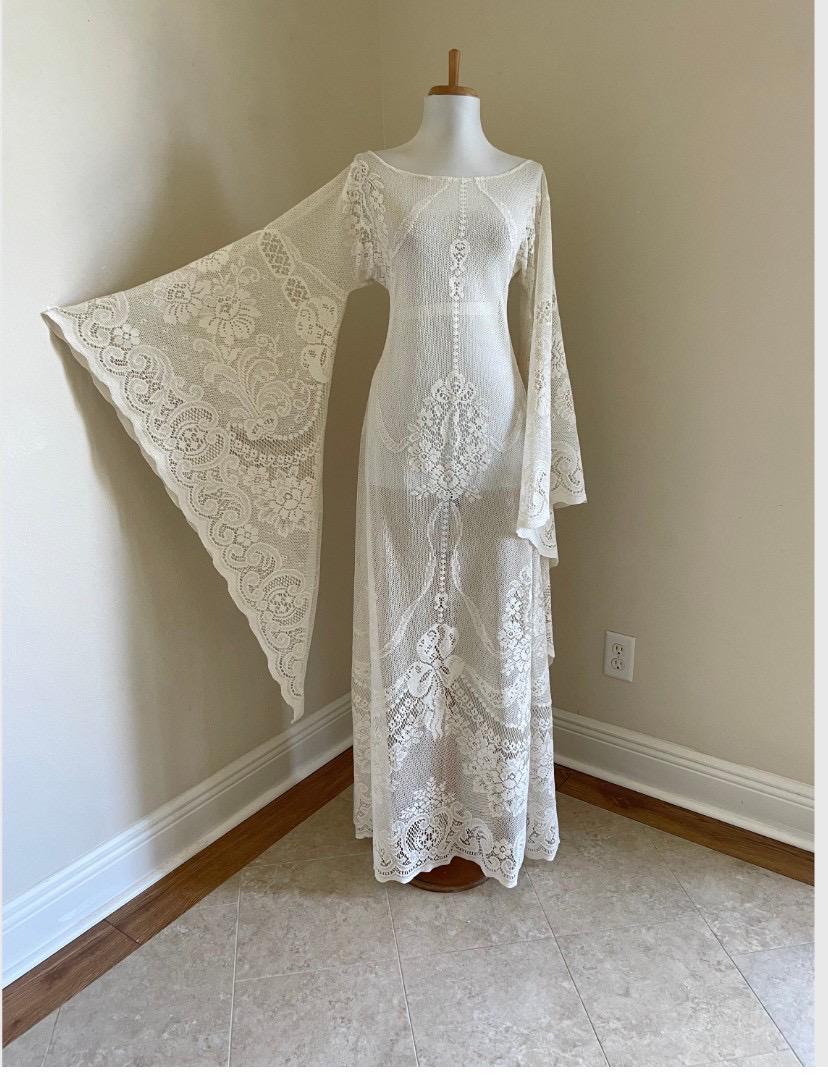 The gown features wide bell sleeves, a slip-on neckline, and a long maxi skirt that drapes beautifully. It’s unlined and meant to be layered over a strapless slip (not included). Inspired by the 1970s, this iconic dress is perfect for boho brides, outdoor ceremonies, or desert elopements.