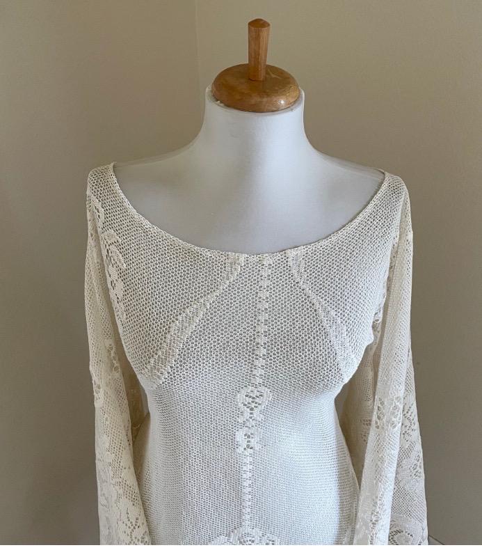 I made this romantic gown for Daisy Jones & The Six, and now I’m offering the same design to brides who want something truly one of a kind. It’s handmade by me using rare, vintage cotton-blend lace from the 1950s–60s. The fabric is soft, sheer, breathable, and features a bold open crochet pattern.