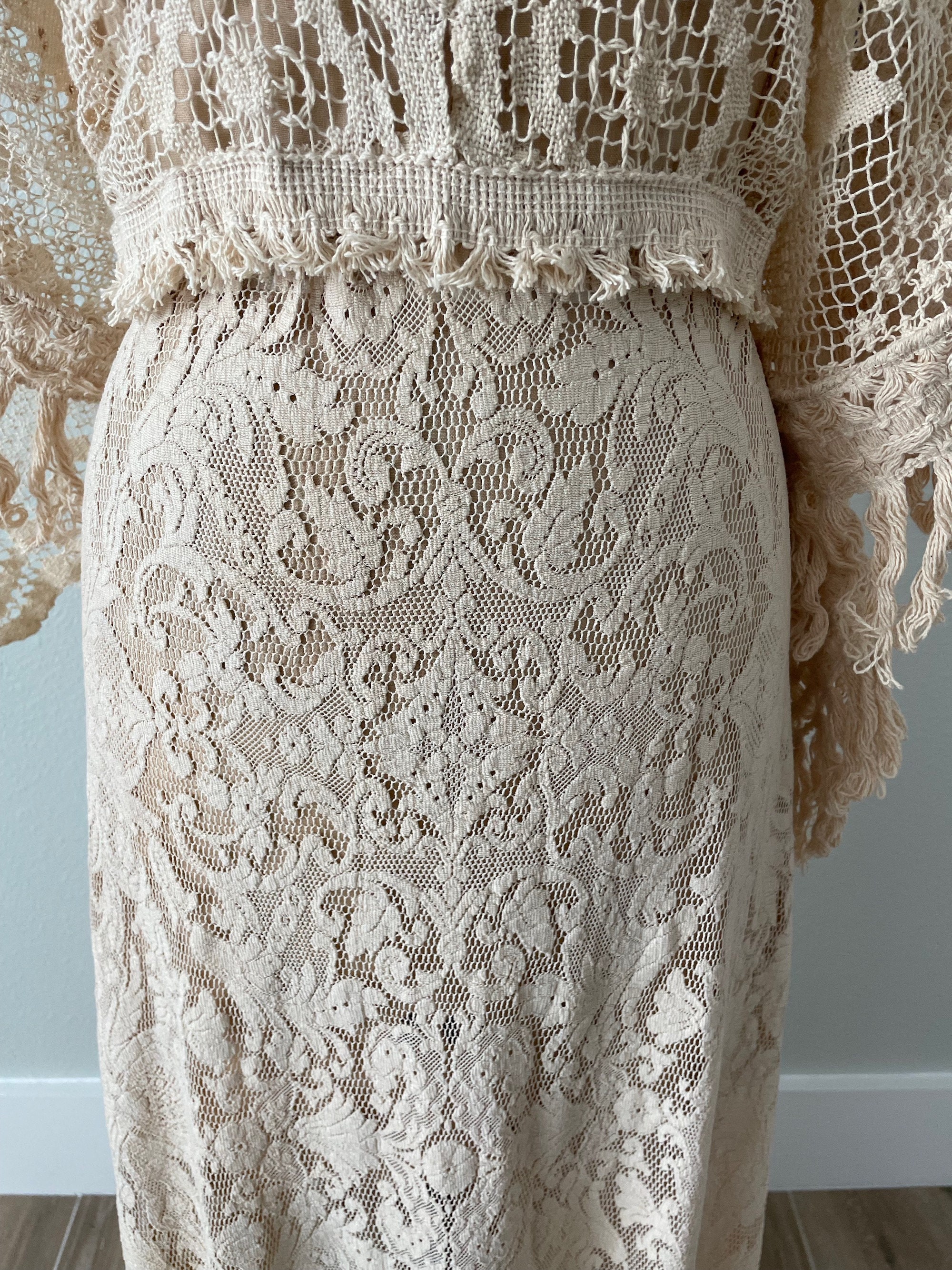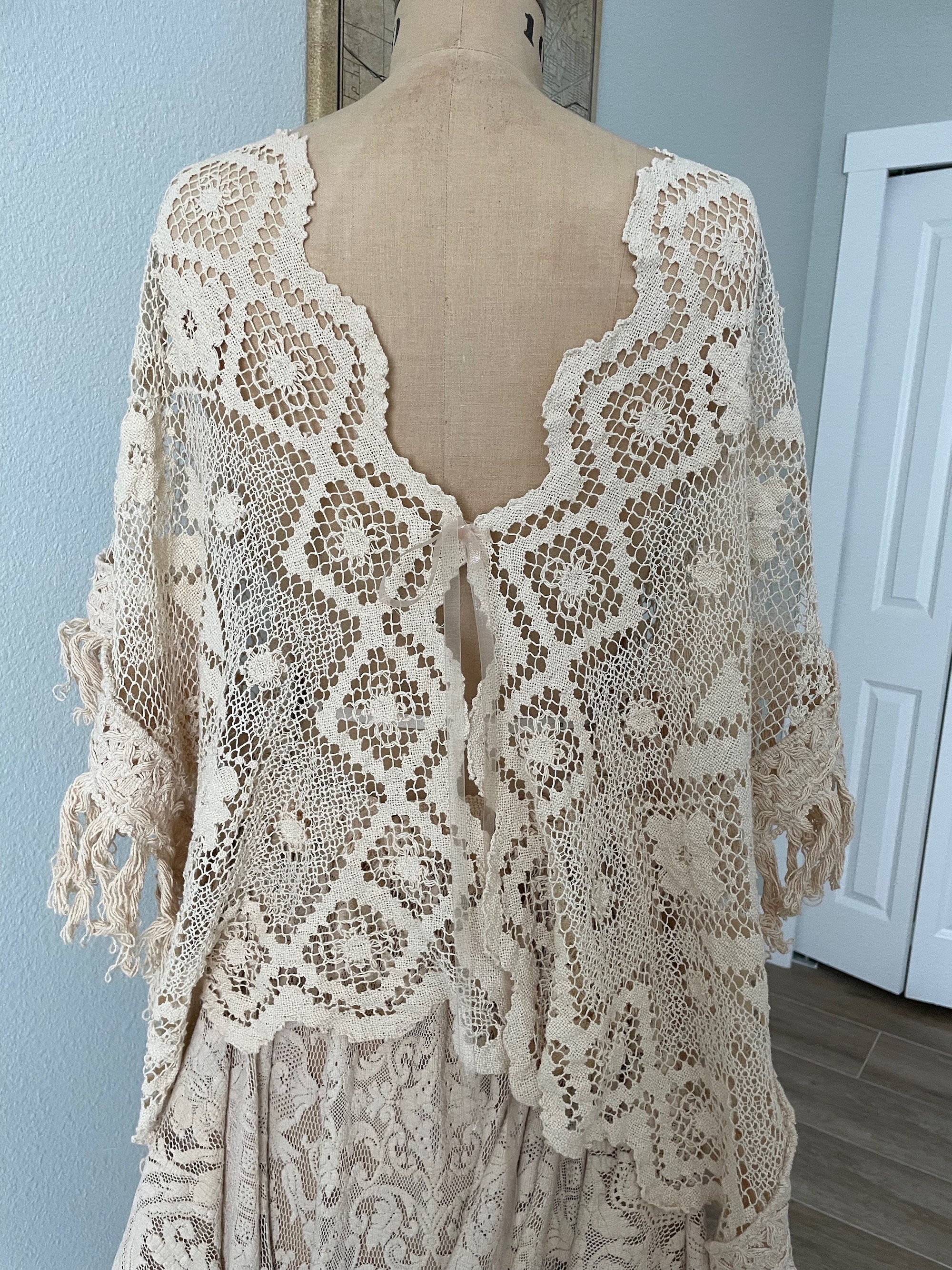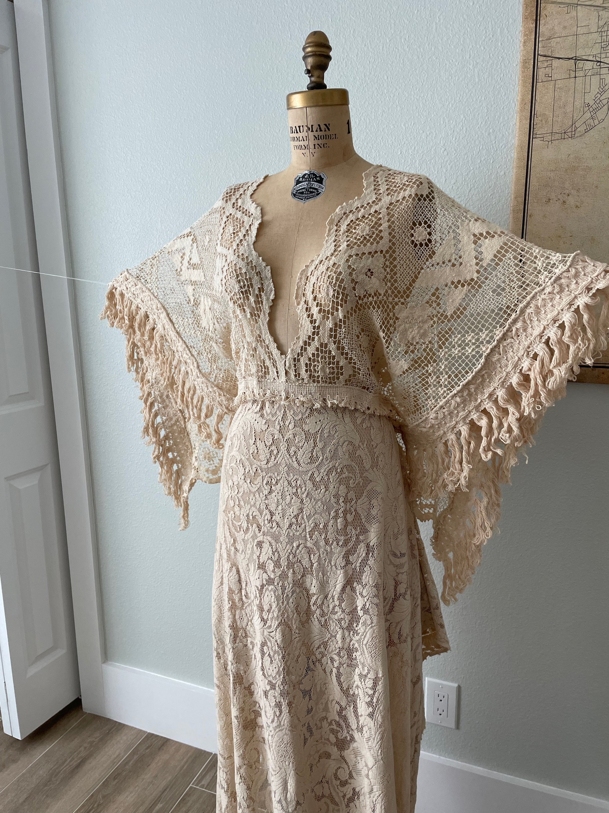 This bohemian wedding dress made of one if a kind sand colored antique lace. The lace will be similar to what is shown after the first dress sells and I remake it custom for you! This is the perfect option for engagement, elopement, wedding maternity, and non-maternity photoshoots. This is a boho long draped lace adjustable bridal gown with bell sleeves, fringe and open sides or a slight train depending on the lace I find. This dress is made with tan cut-out sheer lace and beige crochet and fringe tassel. This style will work for a bunch of different sizes and occasions. The back/waist is adjustable so it's perfect for maternity photos!