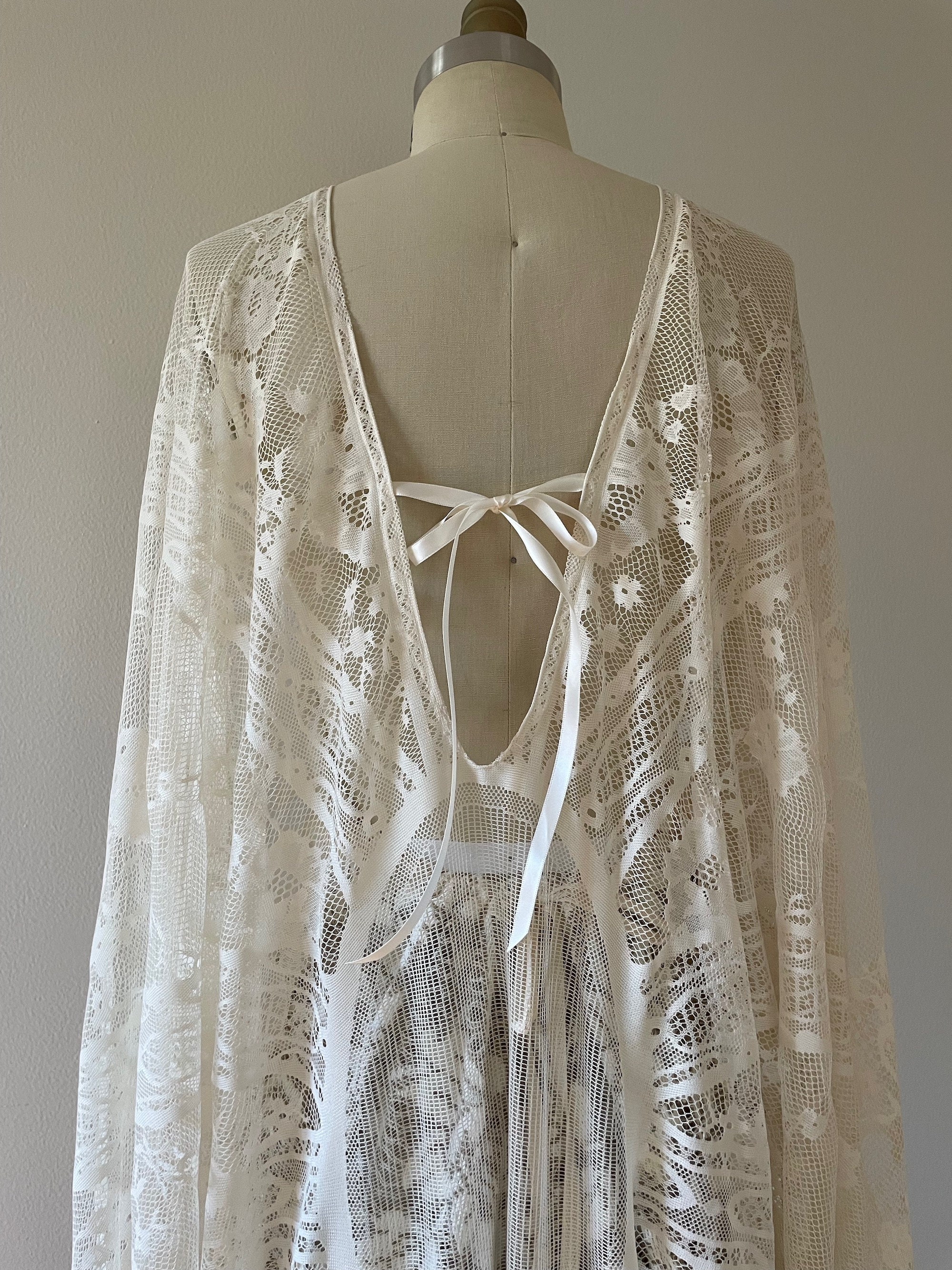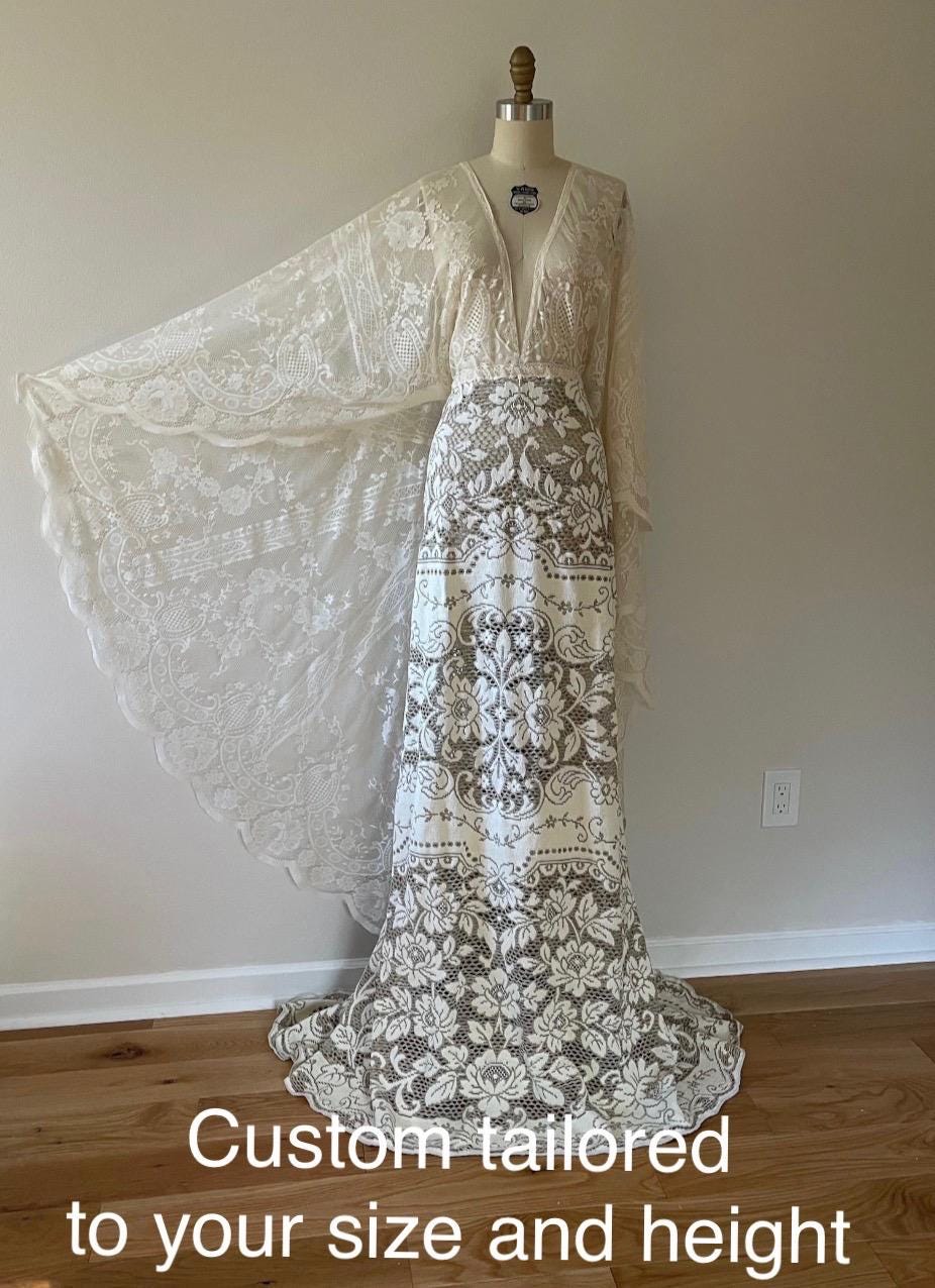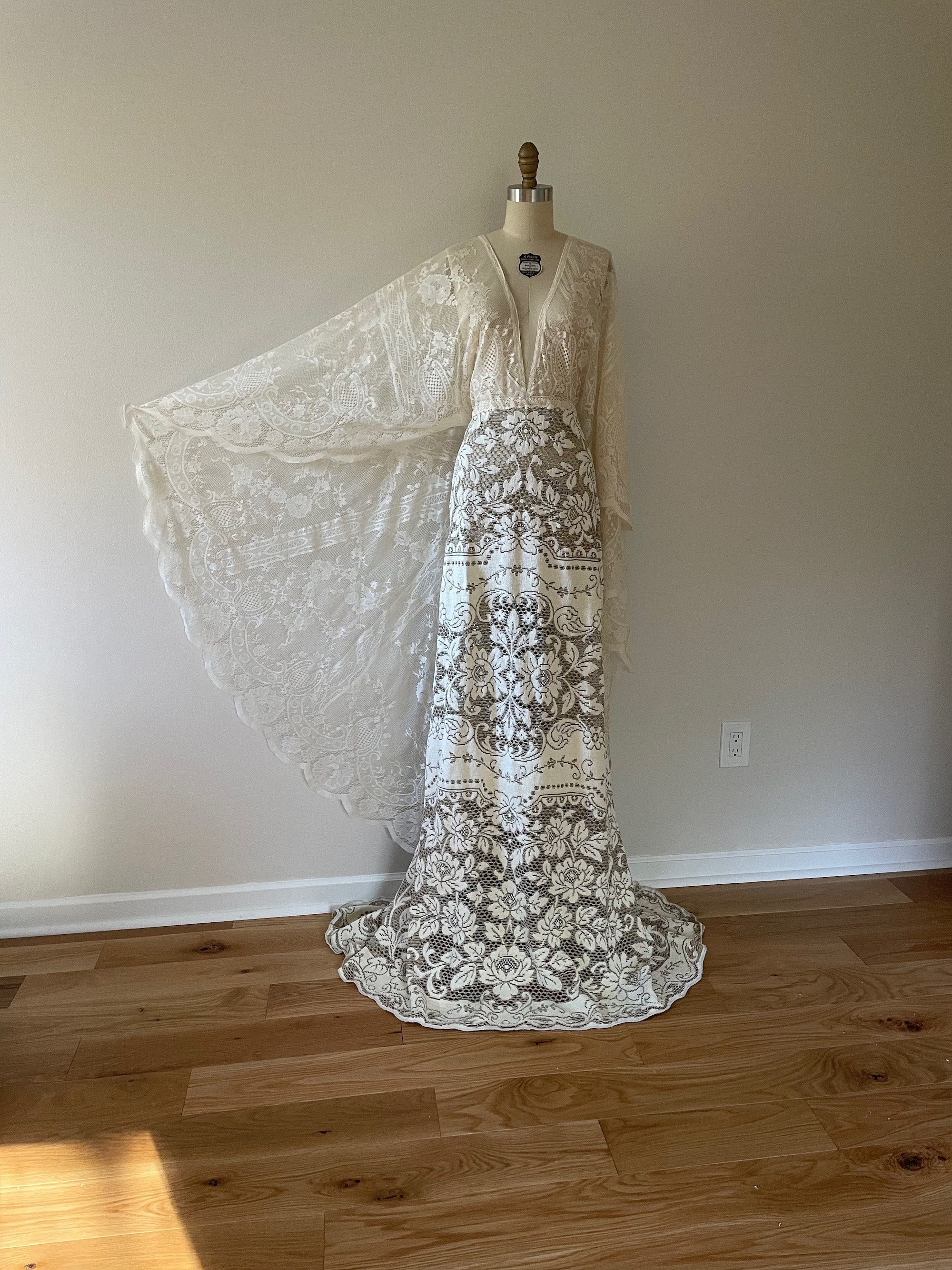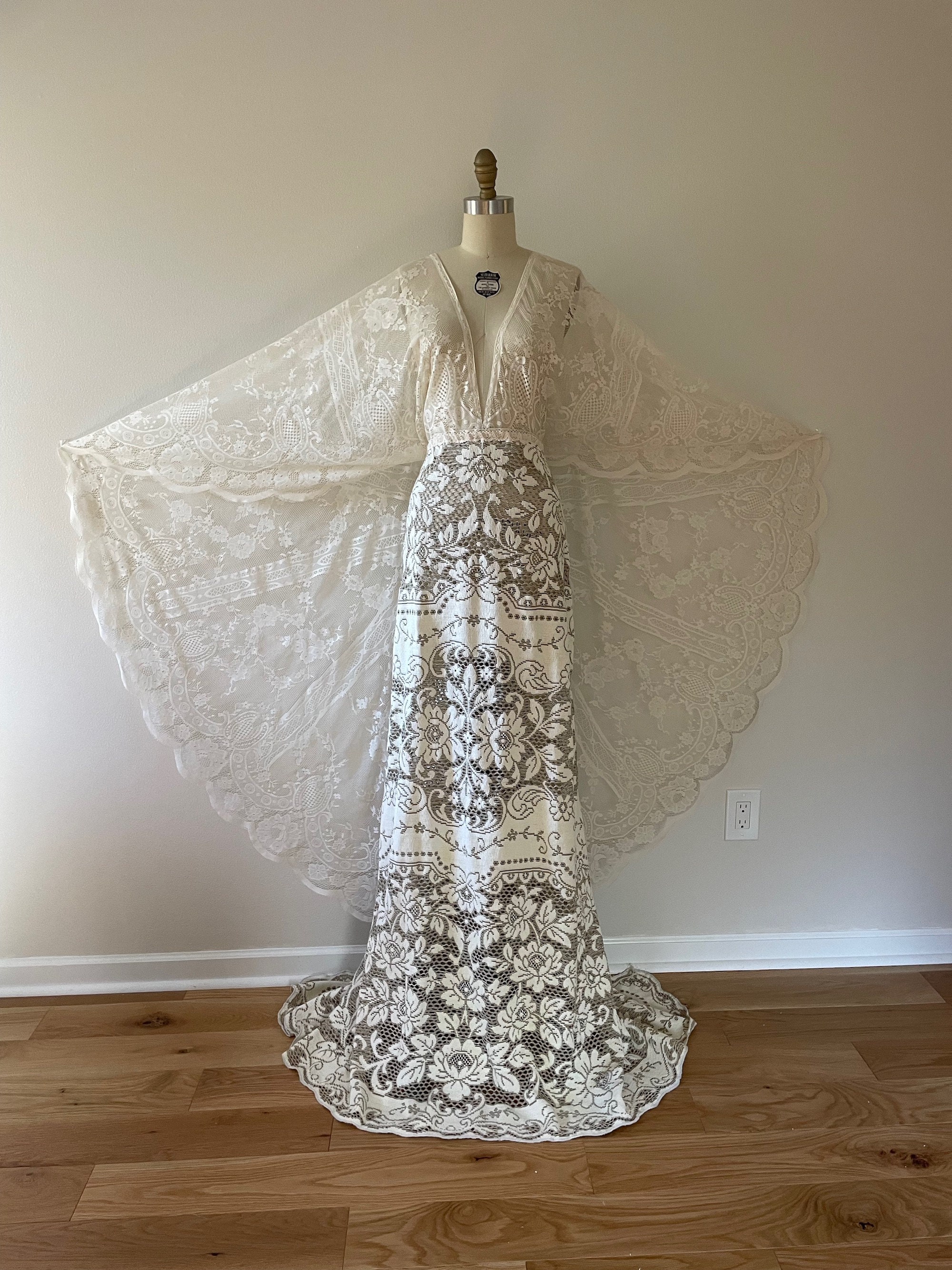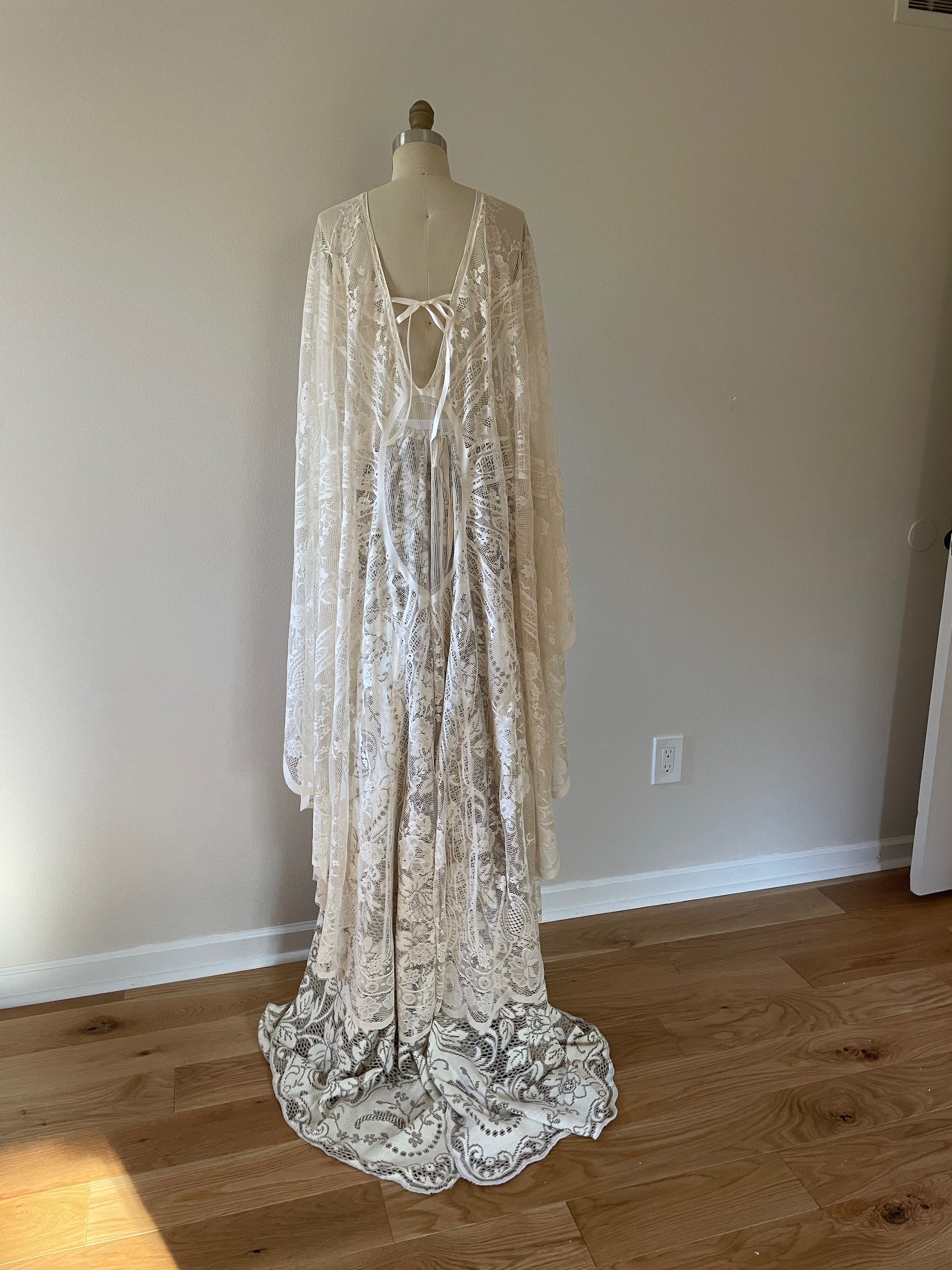 Personalized Tailoring for Your Best Fit To ensure this gown looks as beautiful as possible on your unique silhouette, I provide a personalized tailoring experience. While the dress features a versatile drawstring waist and a freestyle cape-style top that fits Small through 2X, I will personally assist you with home measurements after purchase. Once I have your details, I tailor the gown specifically to your height and size for a high-end, comfortable fit without loosing adjustability. Because of this custom process, this style works beautifully for various stages of maternity or as a standard bridal gown. Design Highlights • Cape-Style Top: Dramatic, flowing sleeves that offer incredible elegance and motion for professional photography. • Versatile & Adjustable: The internal drawstring waist and tie-back bodice allow the gown to adapt to your shape, making it a flexible choice for changing bodies. • Hand-Selected Vintage Lace: I source high-quality lace that perfectly matches the soft tones and delicate textures shown in our photos. • Sheer & Layerable: This unlined gown is perfect for creative layering over a slip or bodysuit, allowing your personal style to shine through. The Beauty of Vintage Each gown is handcrafted using delicate, authentic vintage lace. Because these materials have a history, you may find tiny character marks or minor time-honored flaws. I expertly position the lace to hide these features, ensuring they only add to the dress’s rare, artisan charm.