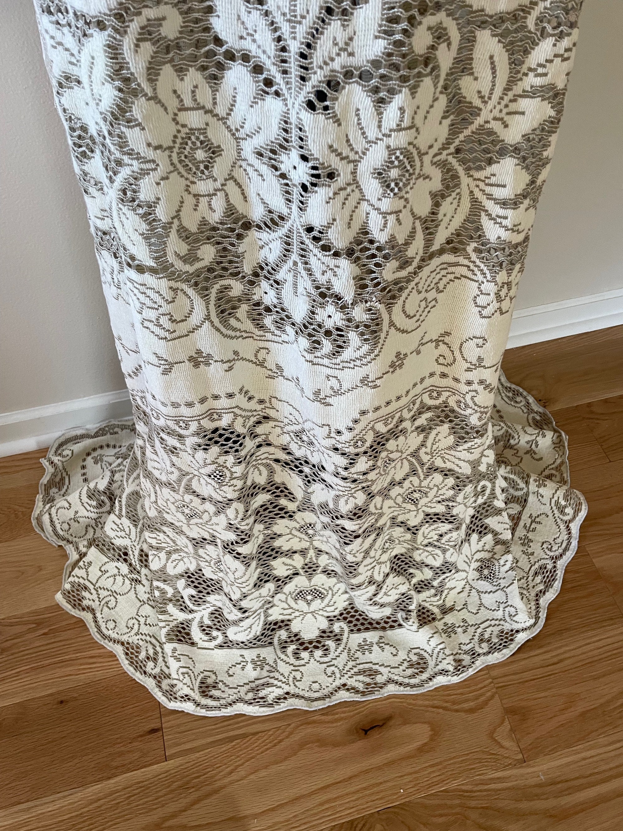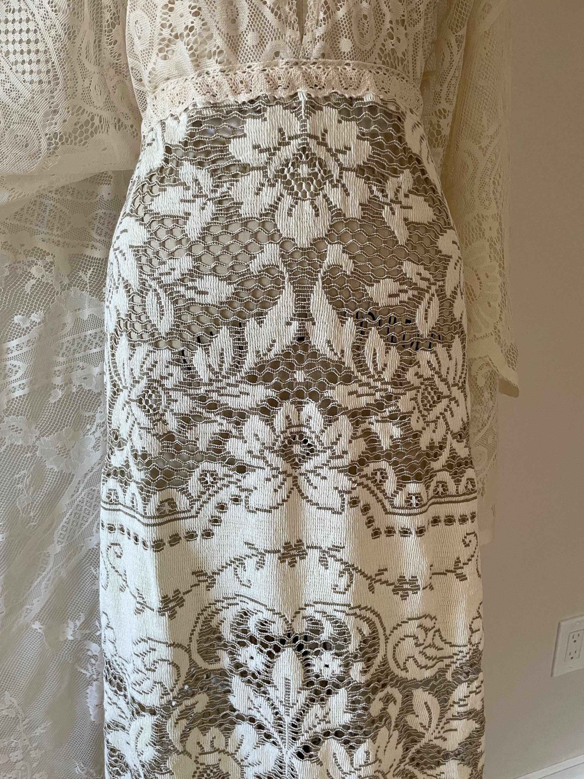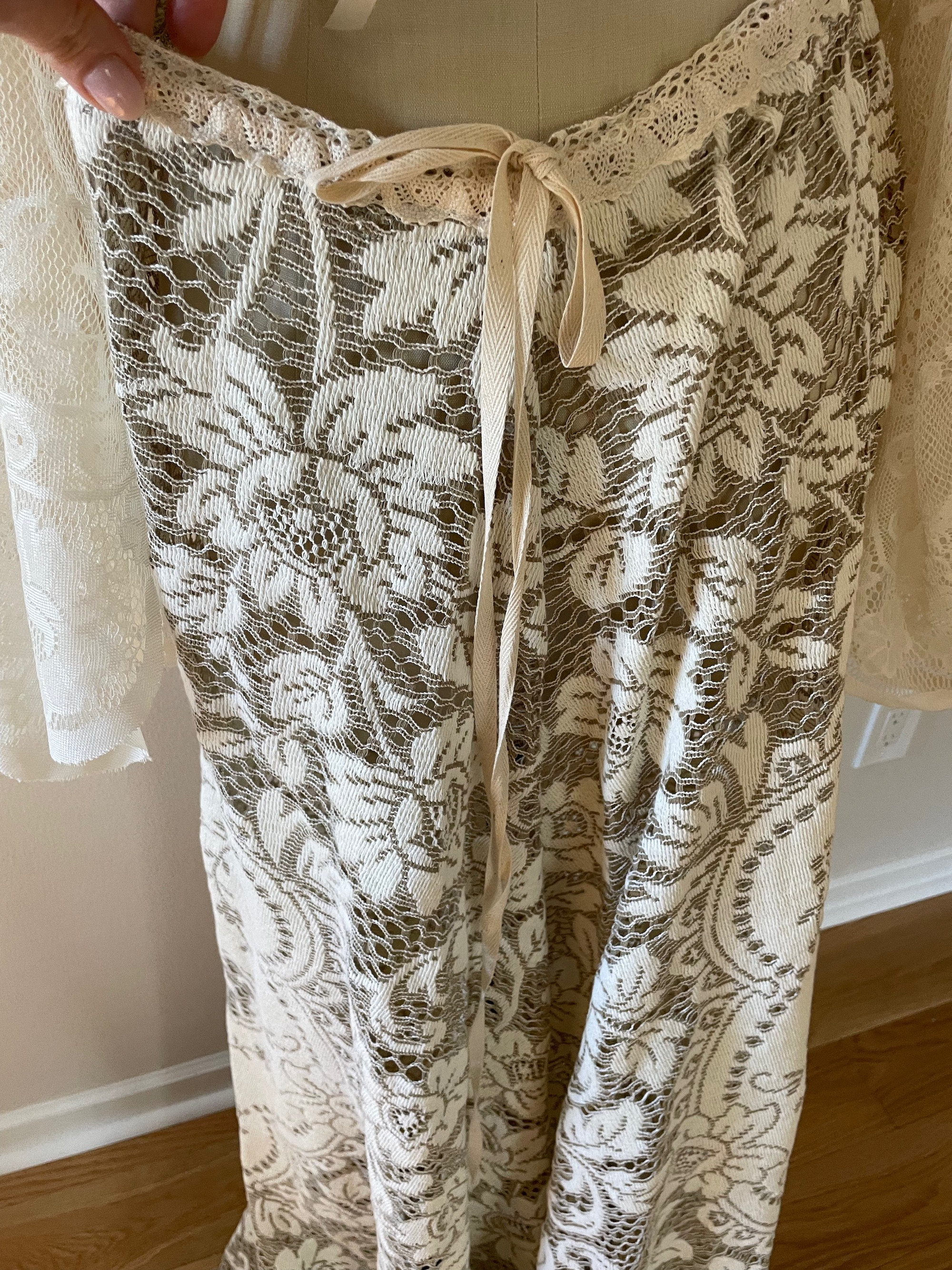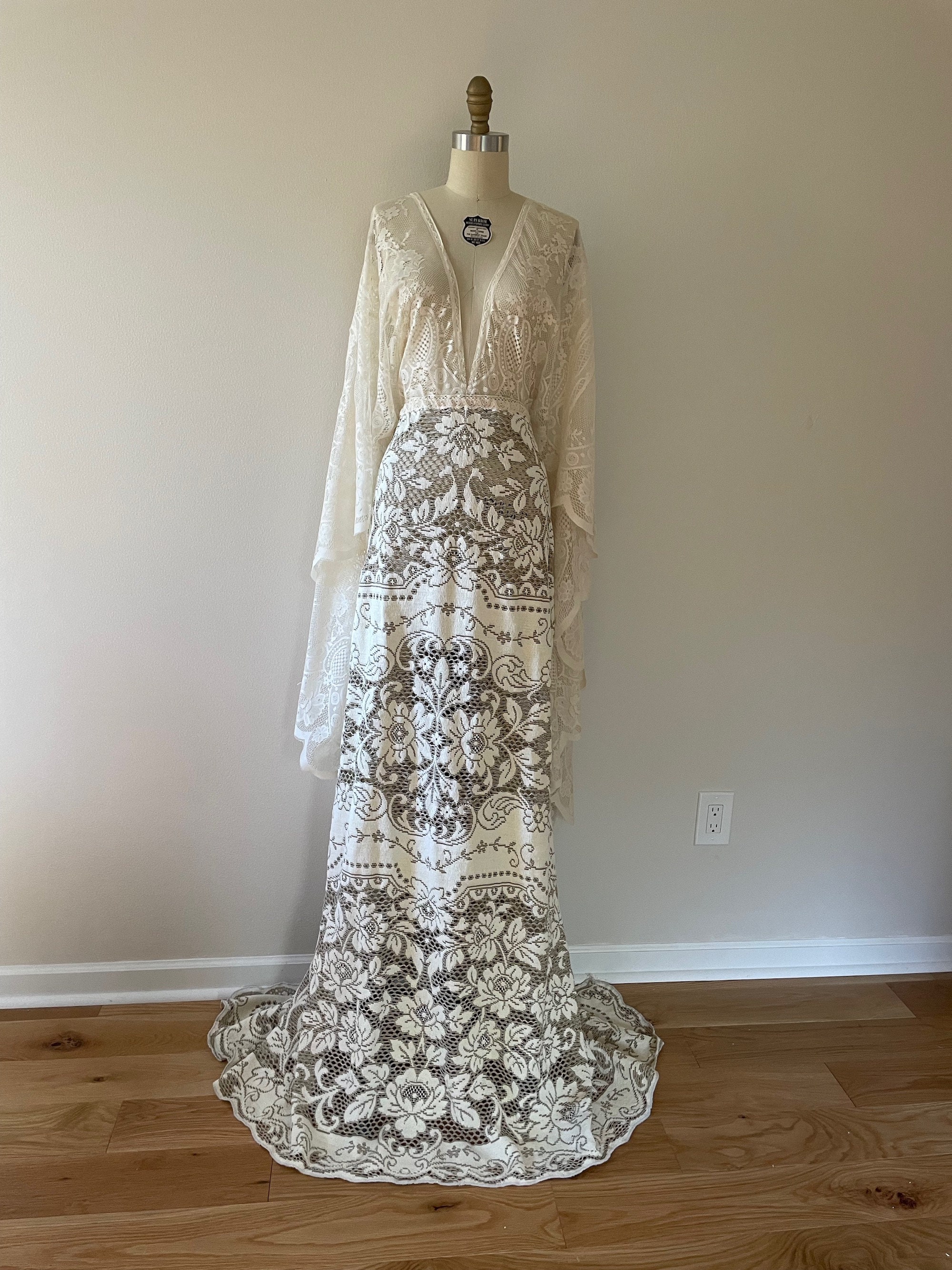 Personalized Tailoring for Your Best Fit To ensure this gown looks as beautiful as possible on your unique silhouette, I provide a personalized tailoring experience. While the dress features a versatile drawstring waist and a freestyle cape-style top that fits Small through 2X, I will personally assist you with home measurements after purchase. Once I have your details, I tailor the gown specifically to your height and size for a high-end, comfortable fit without loosing adjustability. Because of this custom process, this style works beautifully for various stages of maternity or as a standard bridal gown. Design Highlights • Cape-Style Top: Dramatic, flowing sleeves that offer incredible elegance and motion for professional photography. • Versatile & Adjustable: The internal drawstring waist and tie-back bodice allow the gown to adapt to your shape, making it a flexible choice for changing bodies. • Hand-Selected Vintage Lace: I source high-quality lace that perfectly matches the soft tones and delicate textures shown in our photos. • Sheer & Layerable: This unlined gown is perfect for creative layering over a slip or bodysuit, allowing your personal style to shine through. The Beauty of Vintage Each gown is handcrafted using delicate, authentic vintage lace. Because these materials have a history, you may find tiny character marks or minor time-honored flaws. I expertly position the lace to hide these features, ensuring they only add to the dress’s rare, artisan charm.
