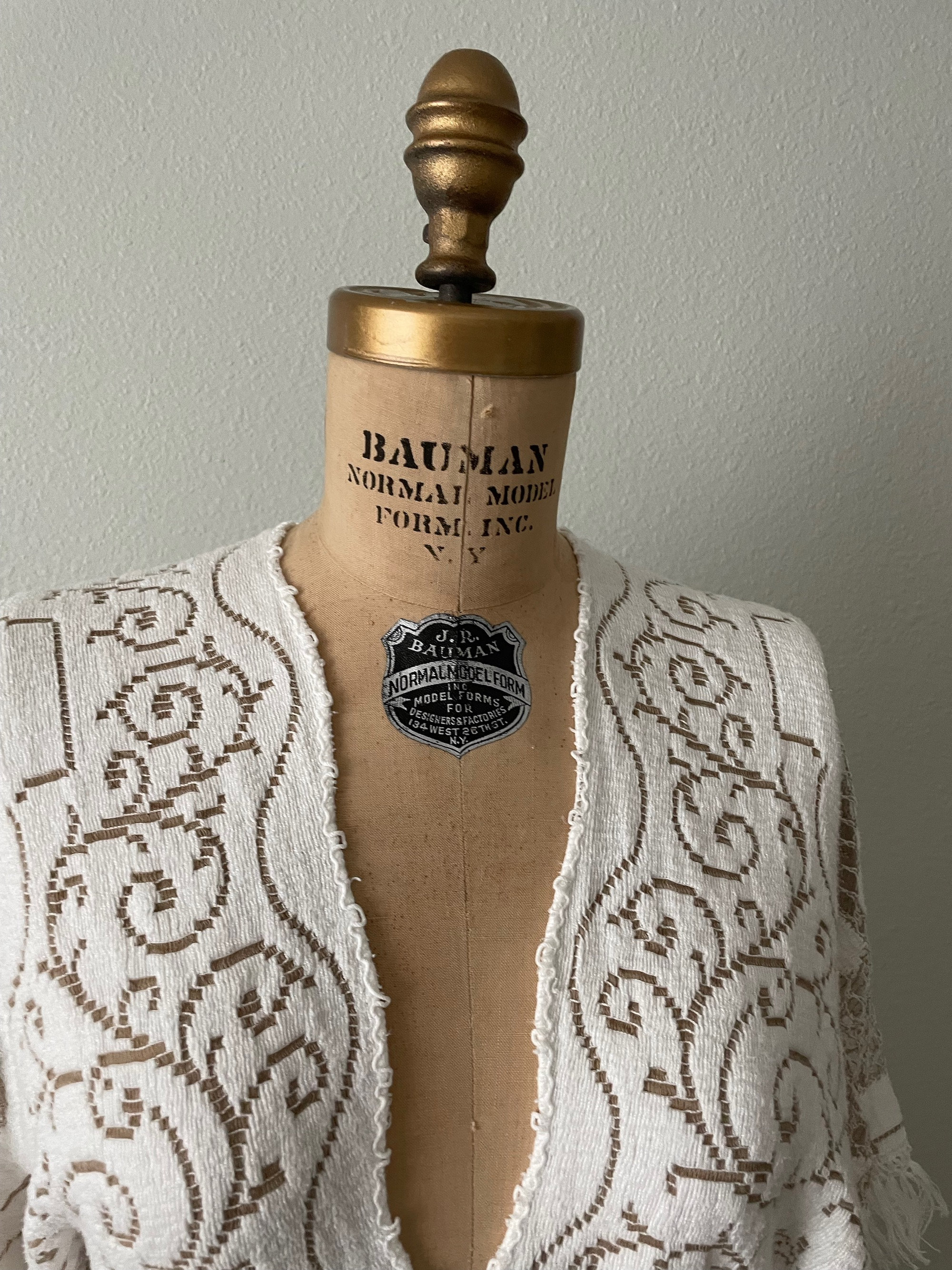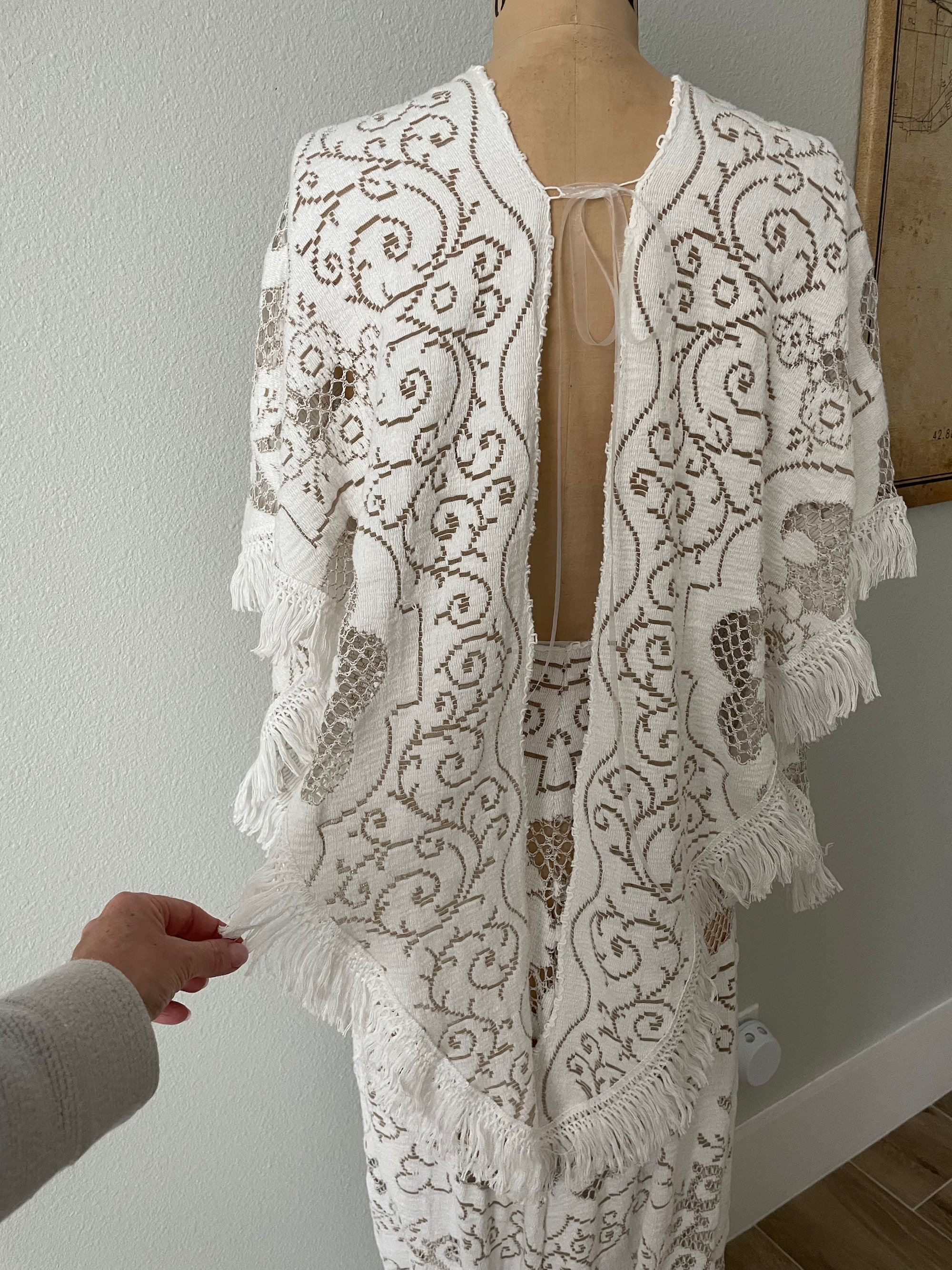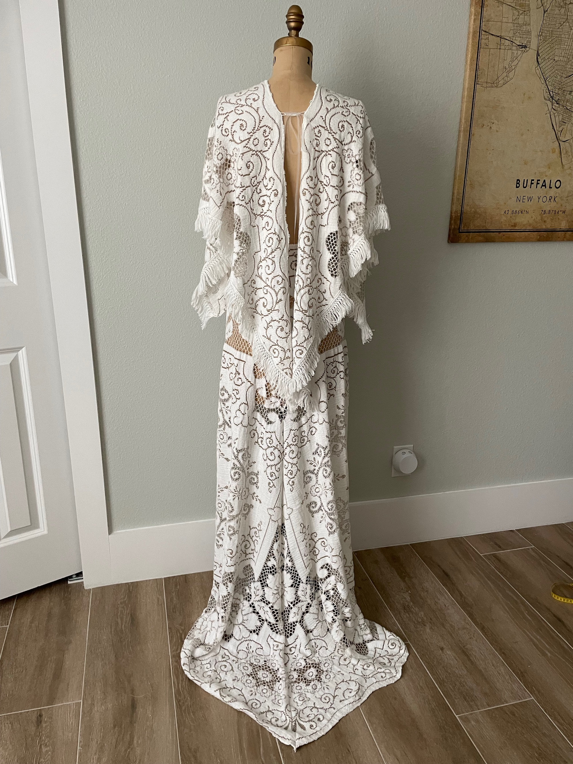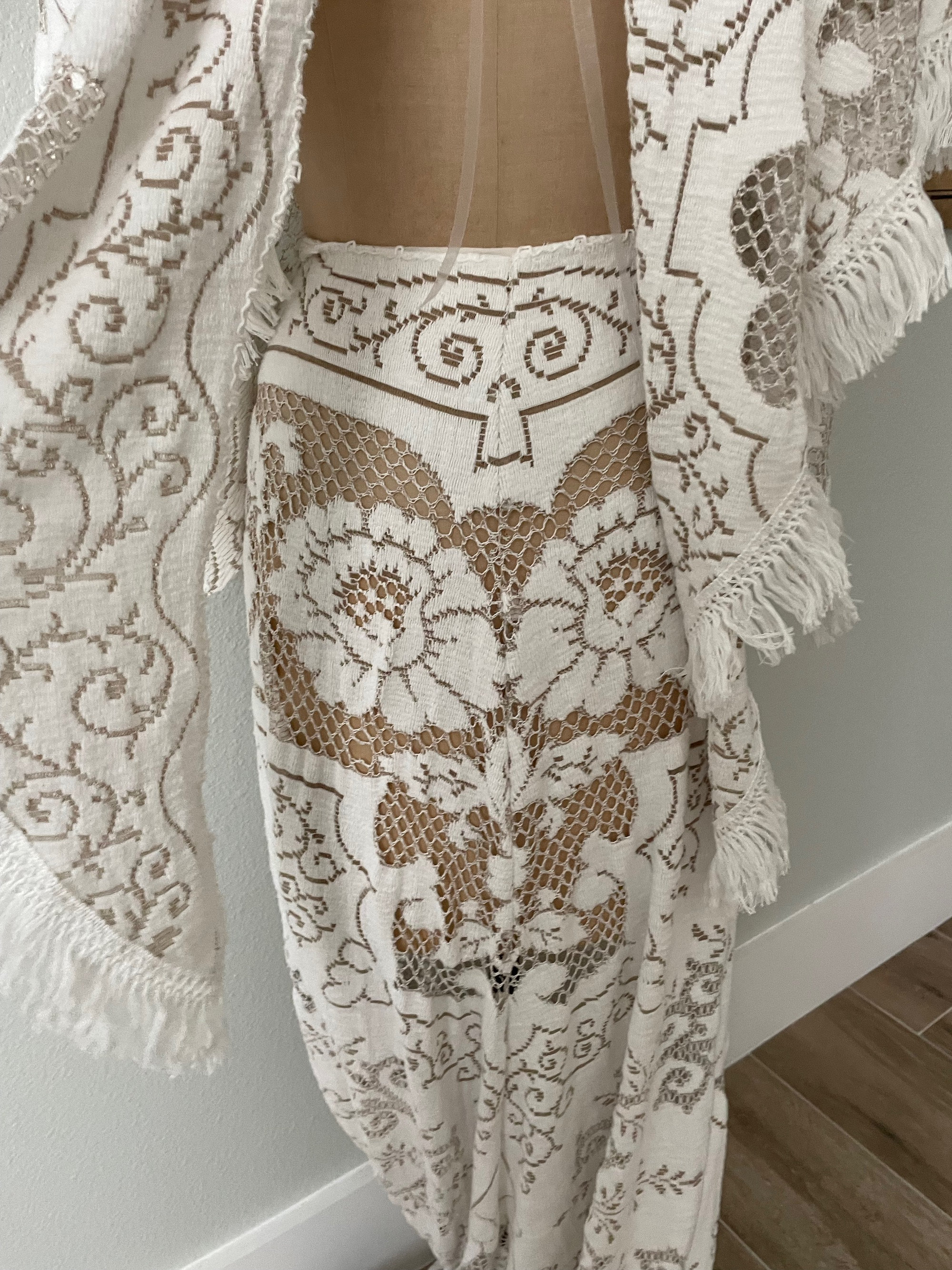 Perfect for a boho wedding or photoshoot. This bohemian maxi dress is made from two-tone white or off white & light brown vintage lace. This is a boho bell sleeve bridal or photography gown that is adjustable and will work for a few different sizes. This unique gown has a plunging deep-v neckline, a slight train in the back, and angelic cape-like sleeves with fringe. This style is popular for boho rustic weddings and maternity outdoor photoshoots. This bohemian draped gown will work for many different sizes and occasions. I made the waist adjustable and the top ties in the back.