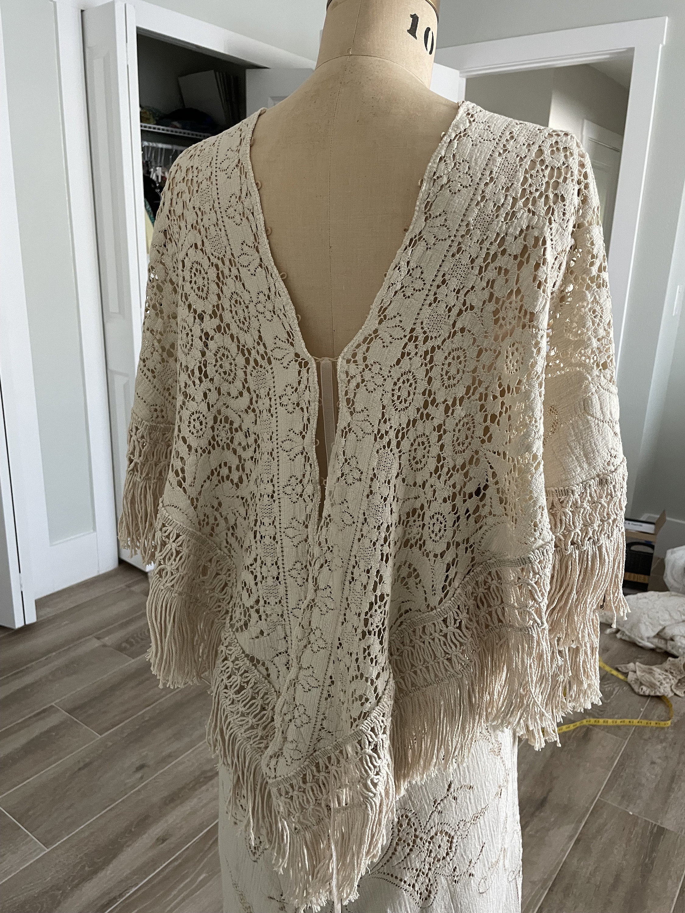 Flattering silhouette: Features a free-size, adjustable top and a flowing skirt with a hint of train. Versatile fit: Perfect for a range of body types, and may even accommodate early stages of pregnancy. Romantic details: Deep V-neckline, bell sleeves, fringe, and a draped skirt add a touch of romance. Customizable: Let me know your measurements for a perfect fit! (All sales final) Customization available: Want a different length or size? I offer custom orders and would love to make your wedding gown!