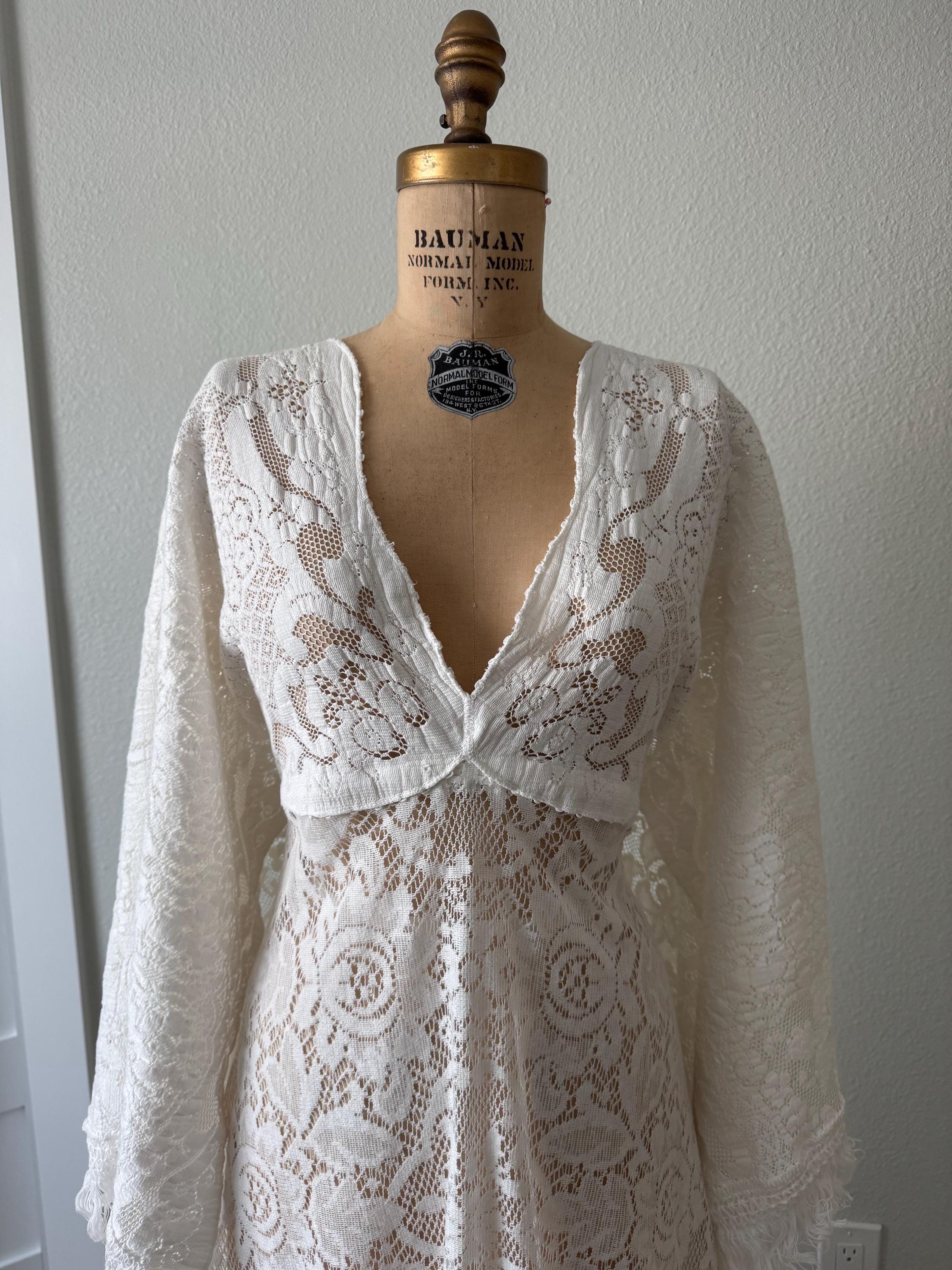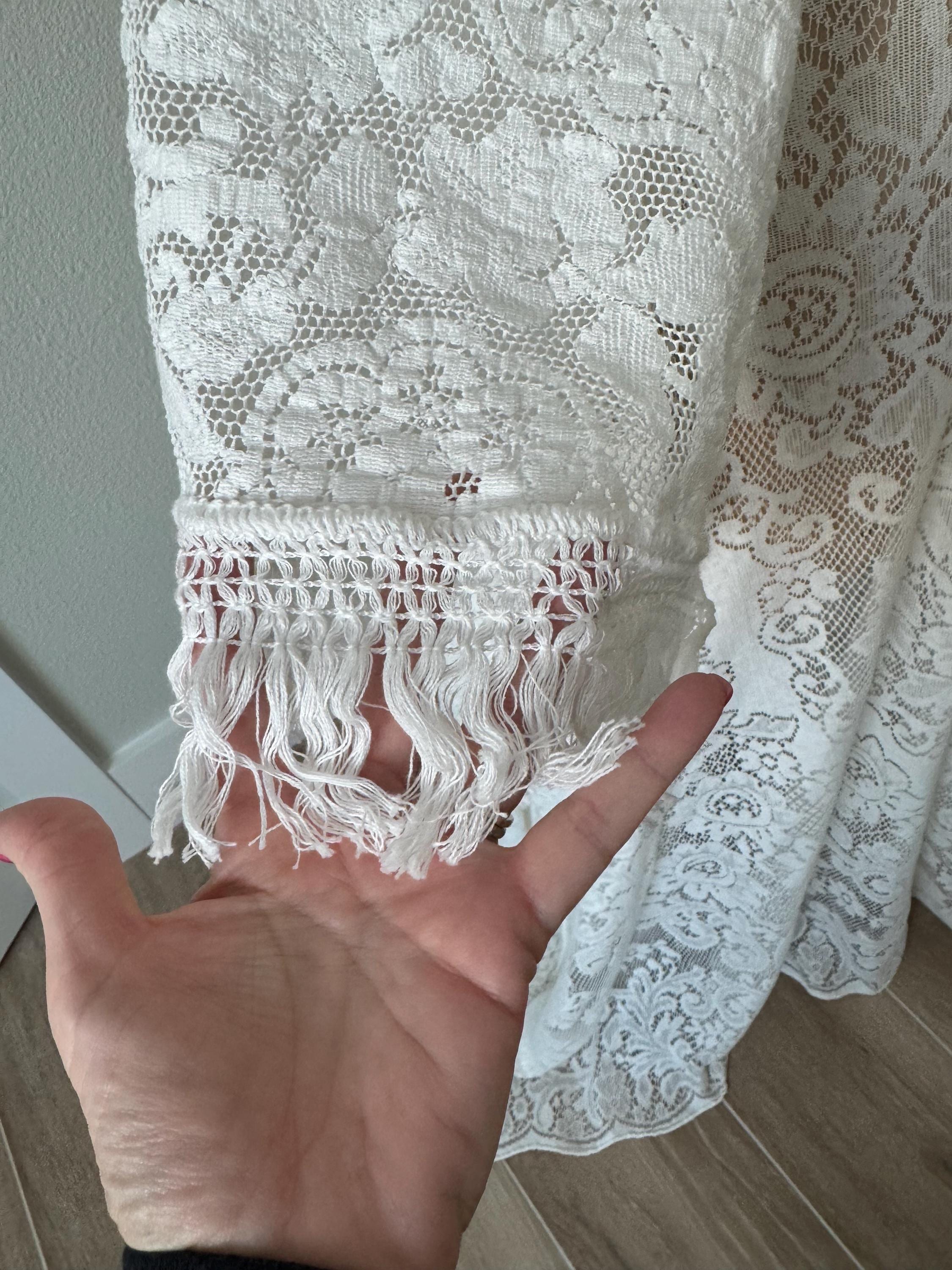 ✔️ Handmade from vintage lace (each piece is unique) ✔️ Sheer design with a plunging deep V neckline and back ✔️ Dramatic bell/angel sleeves with fringe detail ✔️ Asymmetrical draped skirt (flowy and romantic) ✔️ Adjustable fit – waist ties for a flattering look