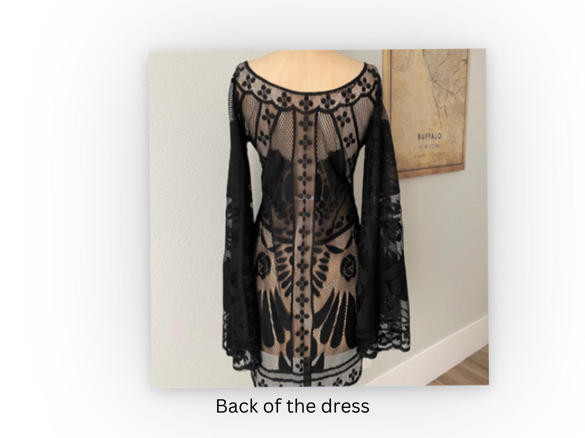 Turn heads in this handmade sheer black lace dress, perfect for music festivals, Stevie Nicks concerts, summer weddings, and elegant events. This unique bohemian-style dress features huge dramatic bell sleeves, an intricate lace pattern, and a flattering 36-inch length. Designed for comfort and style, it’s available in sizes XS to 3X, with custom sizing options for a perfect fit.
