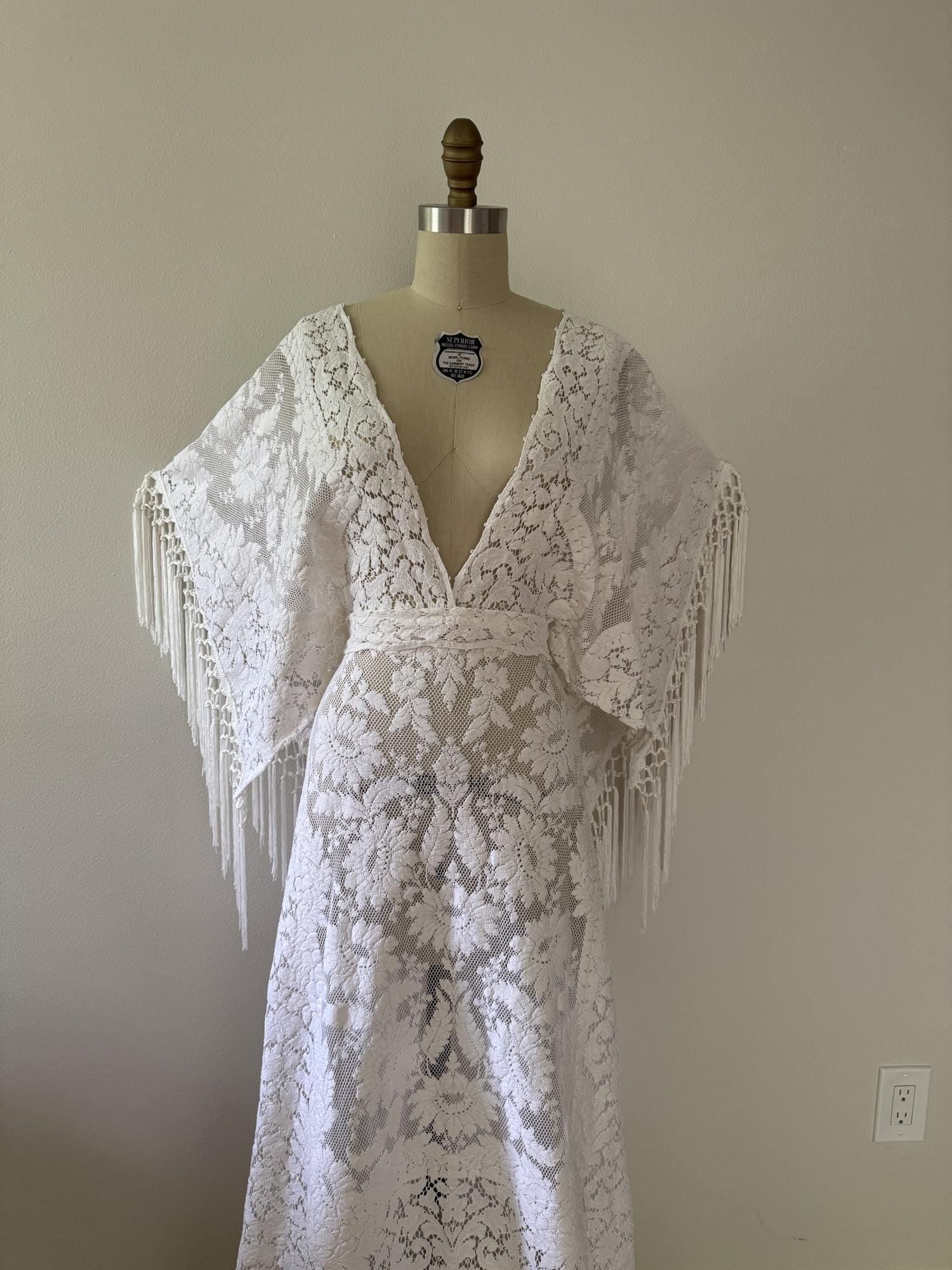 Details • Handmade from vintage cotton lace (antique white) • Angel sleeves trimmed with hand-tied fringe • Deep V neckline (can be raised upon request) • Open V back with optional top tie • Draped skirt with longer sides • Adjustable drawstring waist • Unlined for a light, flowy drape • Ideal for rustic, Western, or outdoor weddings • May work for early-to-mid maternity stages • One of a kind and handmade in the USA