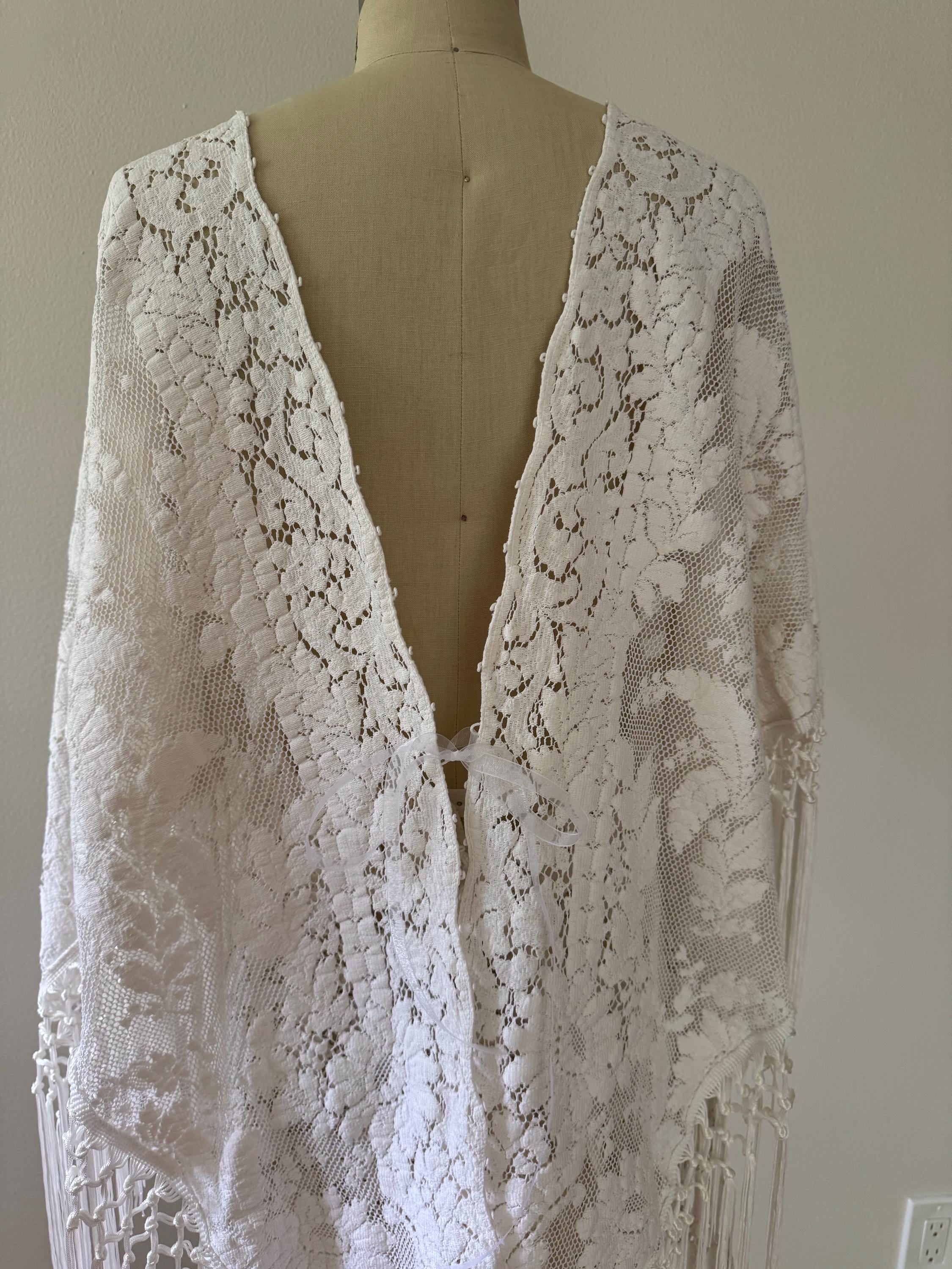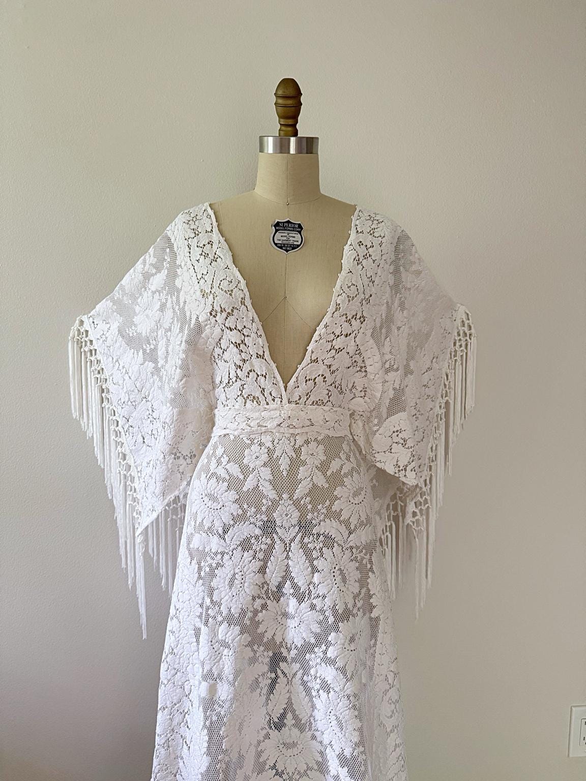 Details • Handmade from vintage cotton lace in antique white • Angel sleeves with hand-knotted fringe • Deep V neckline (can be closed up upon request) • Open V back with optional top tie • Draped skirt with subtly longer sides • Adjustable drawstring waist • Unlined for a light, breathable drape (you can layer as you wish) • Ideal for rustic weddings, Western elopements, or outdoor ceremonies • May work for some maternity stages • Made in the USA, sustainably crafted