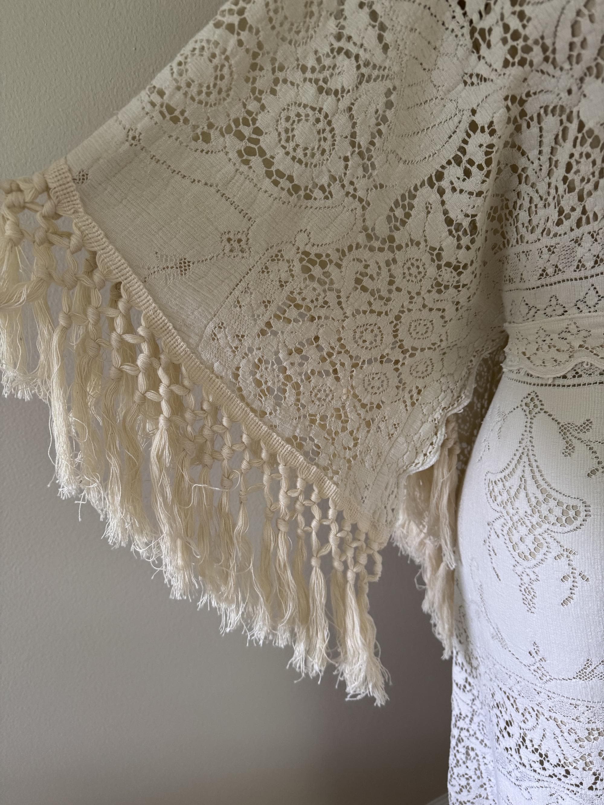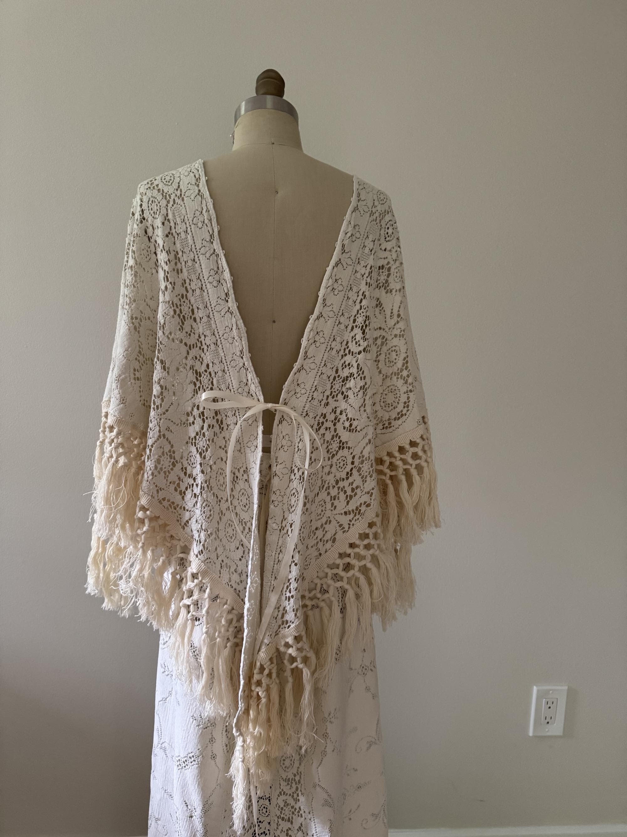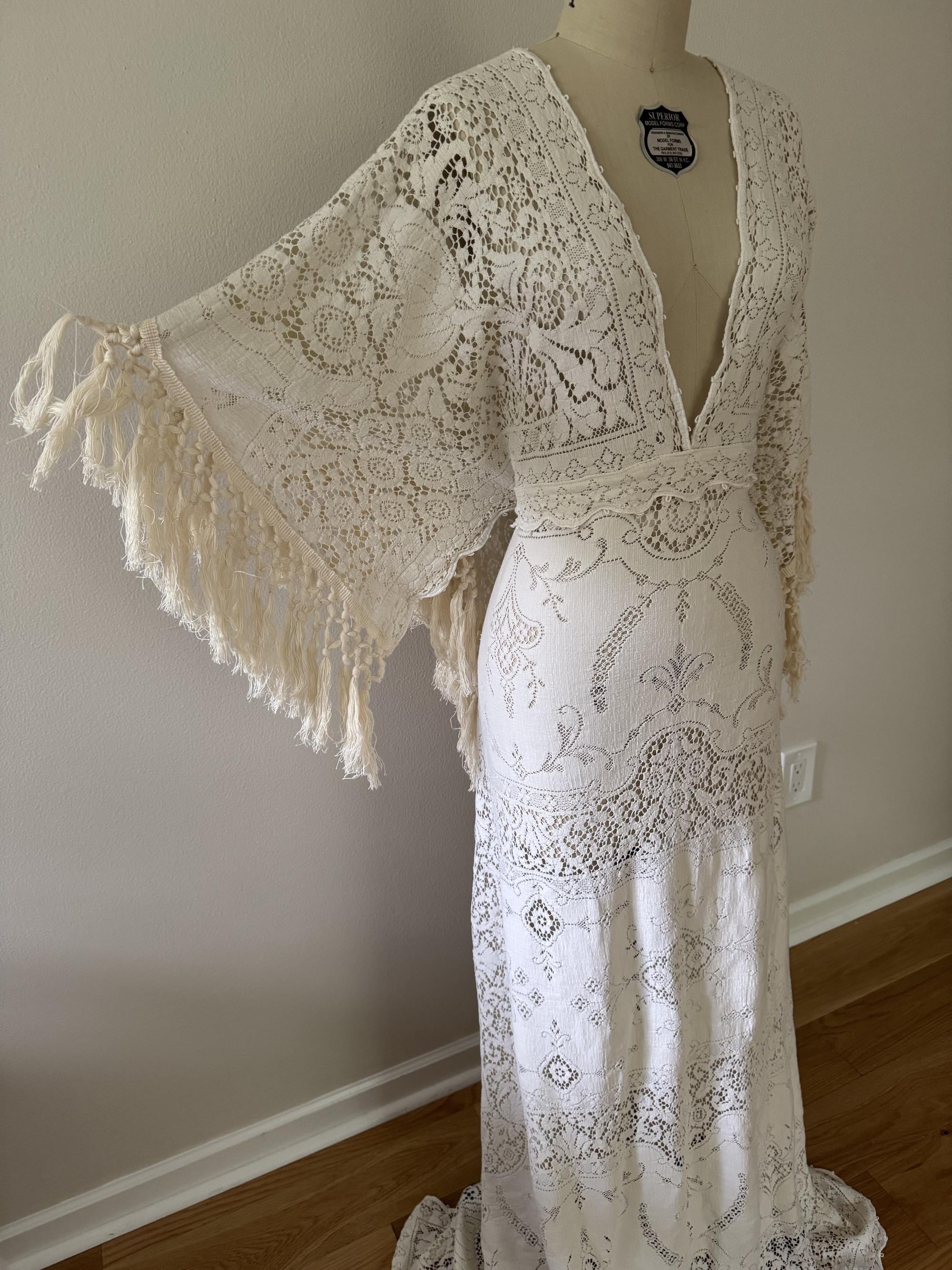 This dreamy bohemian Victorian wedding dress is handmade from rare cream-colored vintage lace and designed to flatter a wide range of body types—including plus size brides. With an adjustable, free-size fit and soft fringe-trimmed sleeves, it’s perfect for outdoor weddings, elopements, and rustic celebrations.