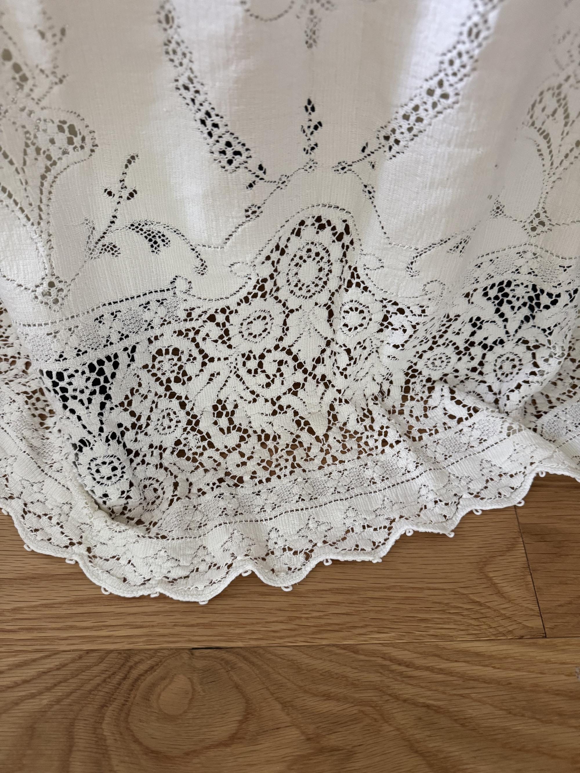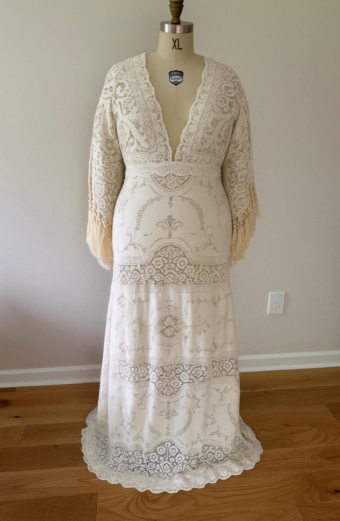 Why You’ll Love It: • Adjustable Fit: Drawstring waist and optional upper back tie allow it to flexibly fit multiple sizes—including curves and early pregnancy. • Plus Size Friendly: Can be made in your measurements for a truly flattering and comfortable fit. • Cream Vintage Lace: Not bright white —this warm toned cream gives the gown a romantic, heirloom feel. • Romantic Silhouette: Deep V neckline (front and back), flowing skirt with a soft train or slit (depending on the lace used), and bell sleeves with vintage fringe.