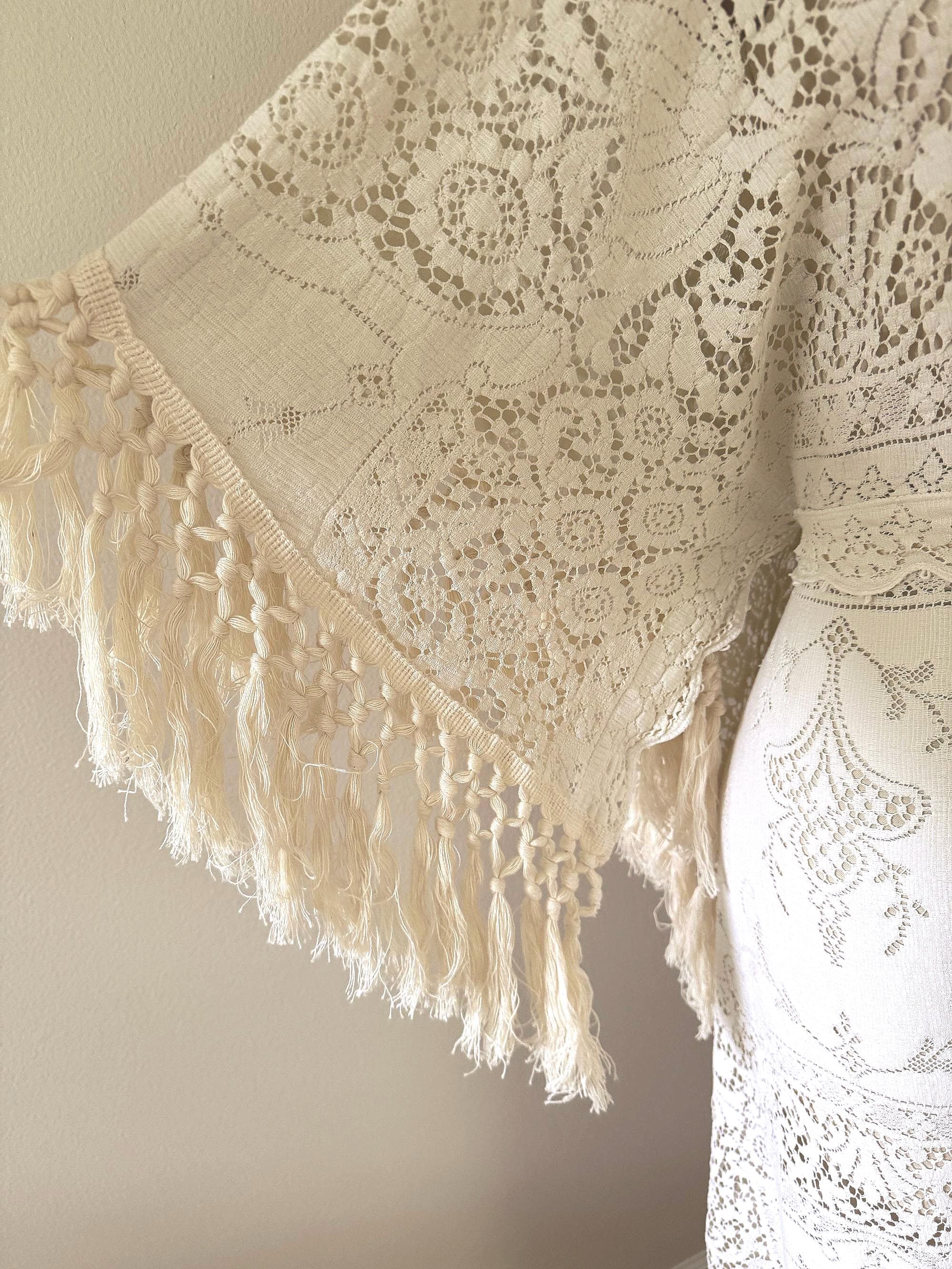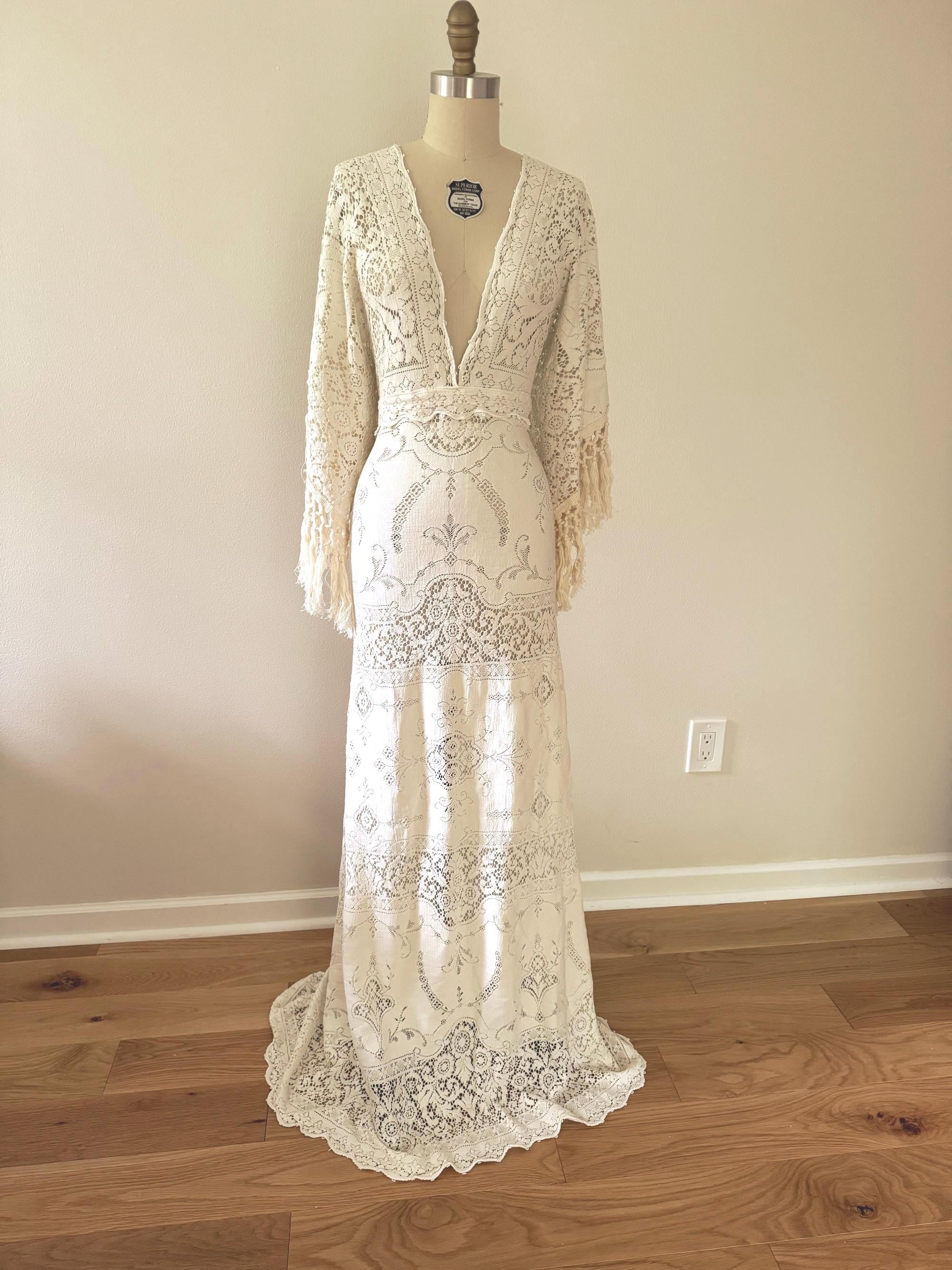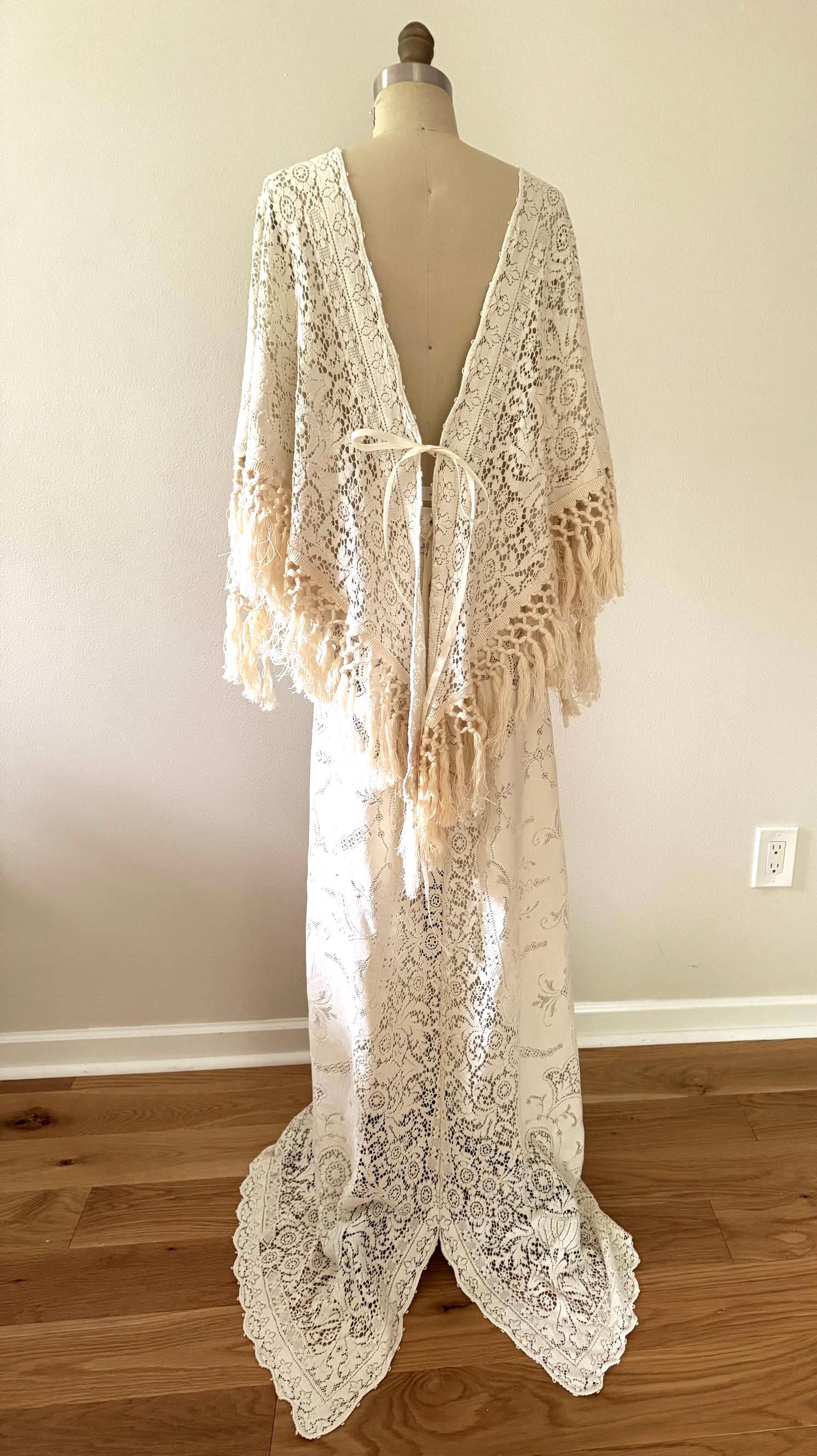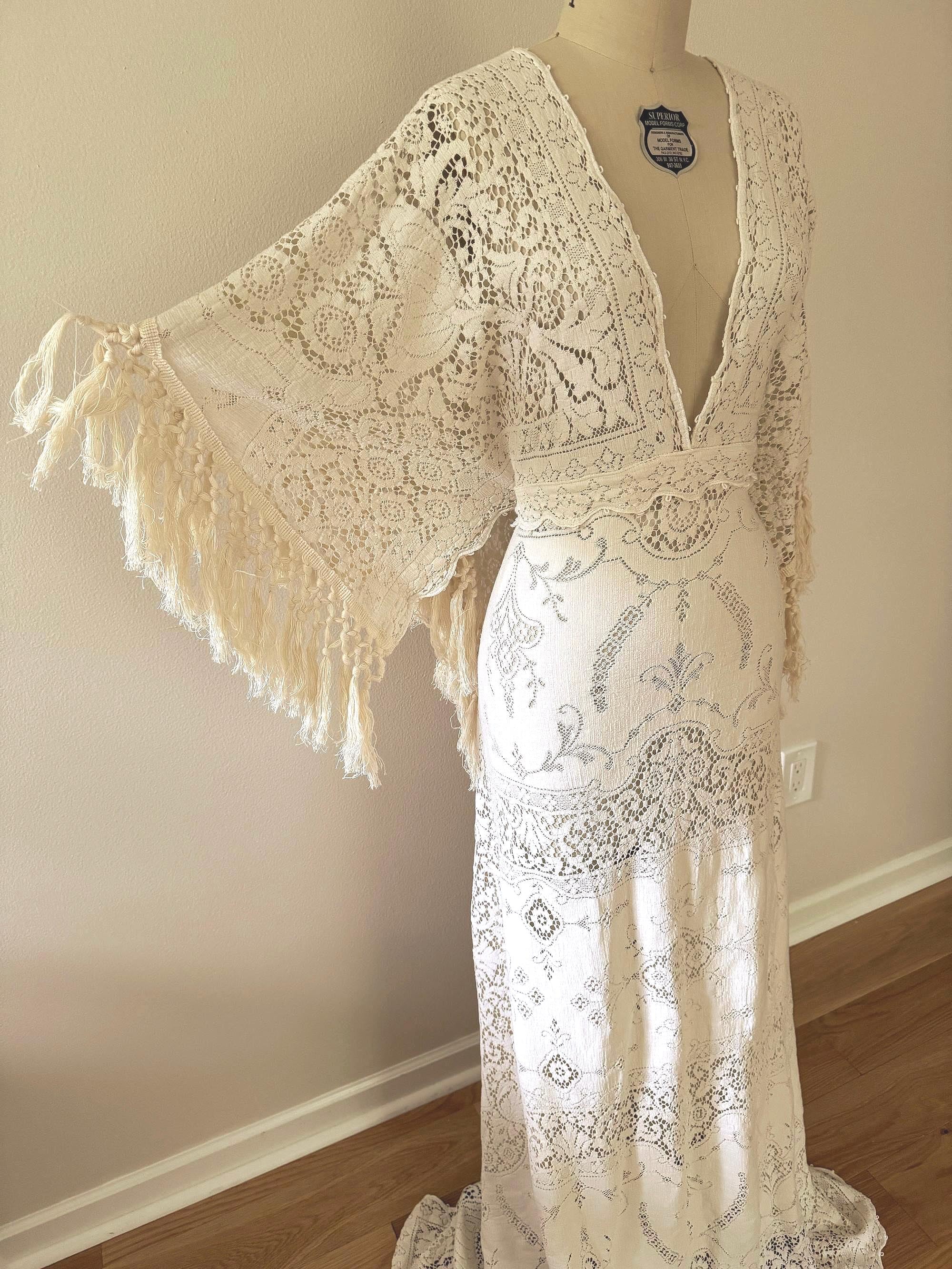 This A-line boho wedding dress is handmade from a stunning cream-colored vintage lace, combining the romance of a Victorian bridal gown with the rustic charm of a western-inspired wedding dress. With its deep V neckline, flowing draped skirt, bell sleeves, and fringe trim, this gown flatters a range of body types and can even work as a maternity wedding dress. Perfect for romantic outdoor weddings, rustic barn celebrations, or bohemian garden ceremonies, it offers a timeless yet free-spirited bridal look. An ivory version is also available (see photos).