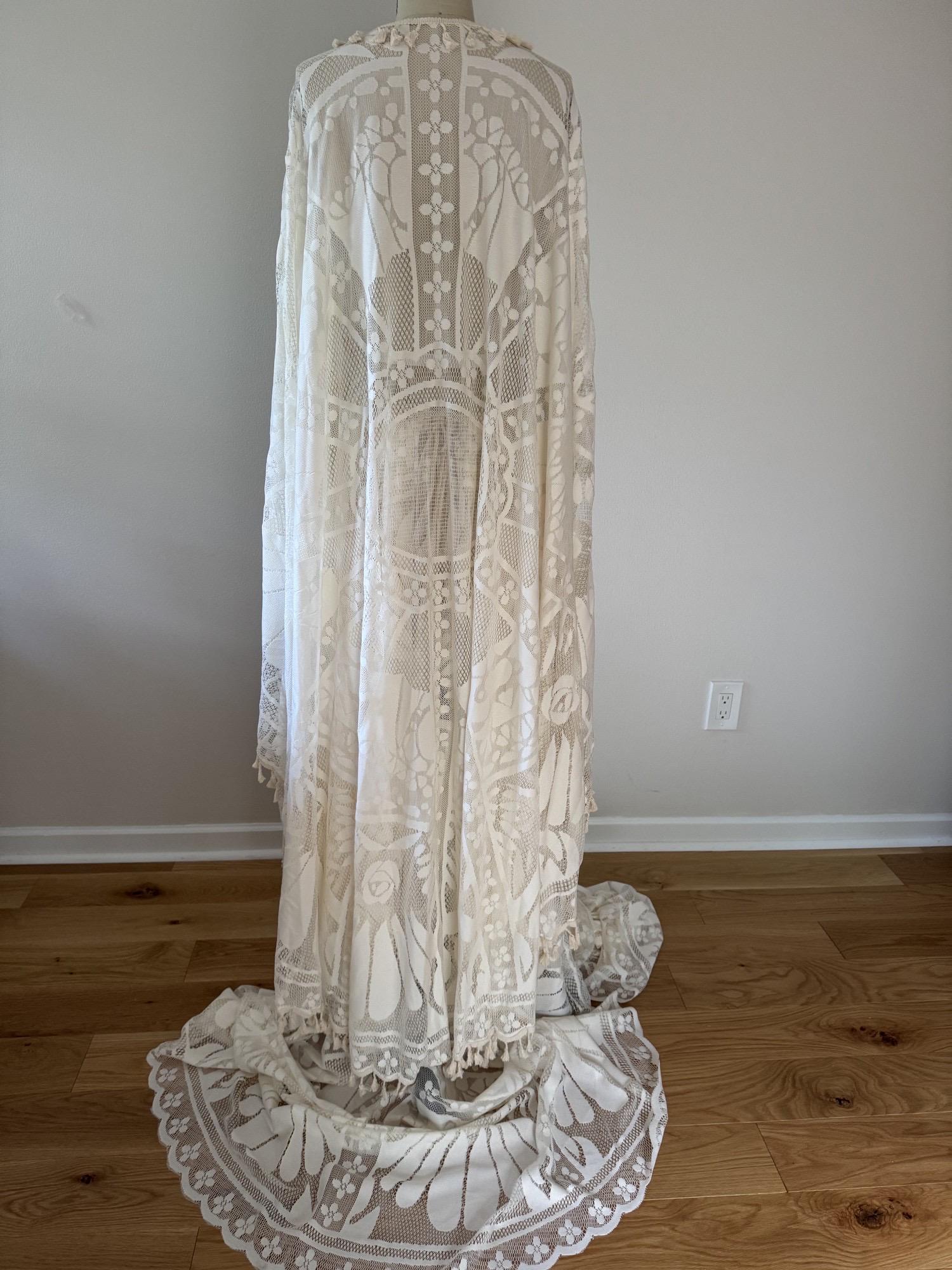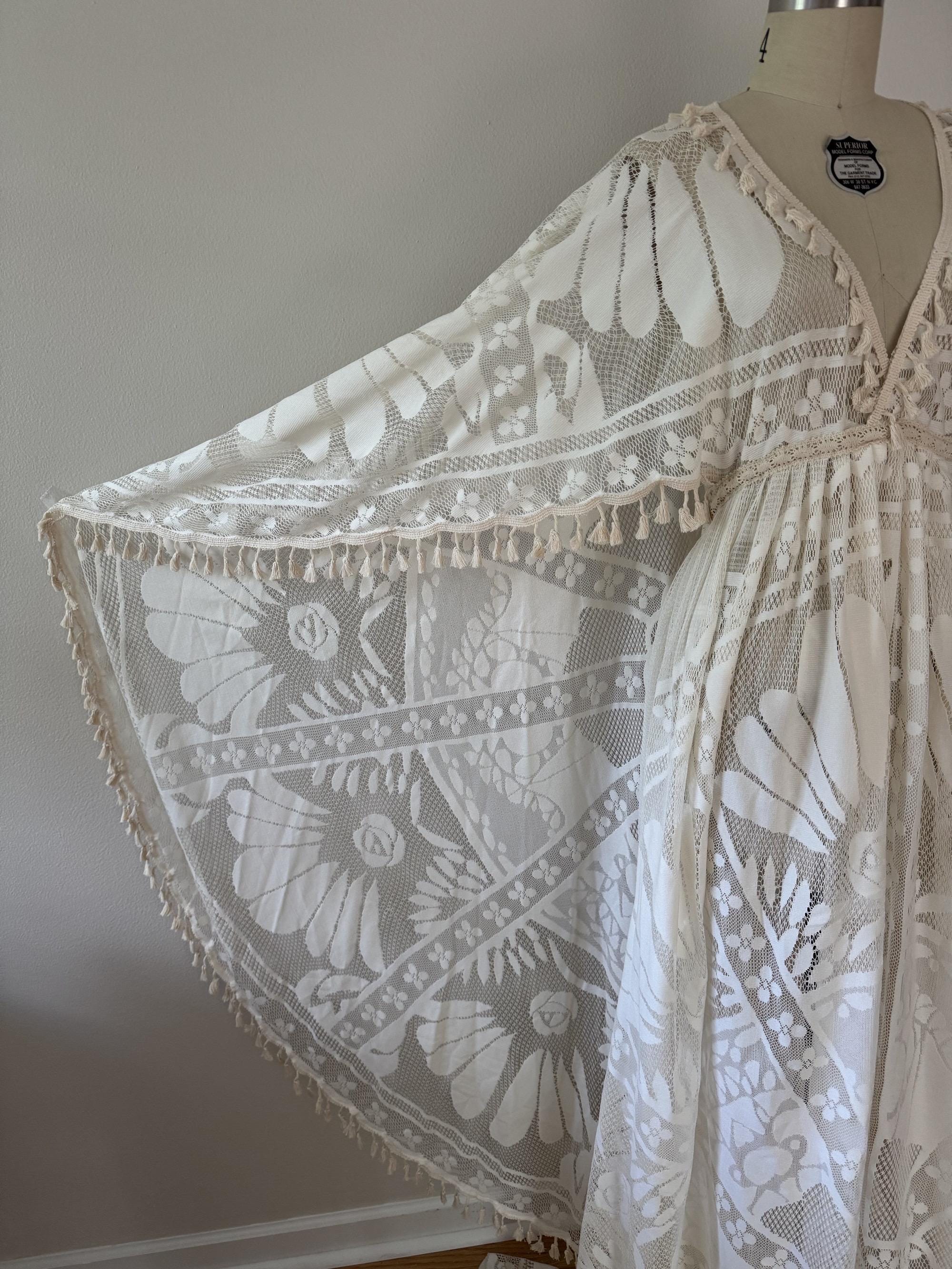 The gown is made from ivory and cream beige crochet lace with a soft draped silhouette that flows effortlessly. Instead of traditional sleeves, it features dramatic cape-style panels that extend from the shoulders and join across the back, creating a stunning angel-wing effect in photos. Other details include a deep plunging neckline, open back, adjustable drawstring waist, crochet fringe trim, and an asymmetrical hemline that adds movement and shape.