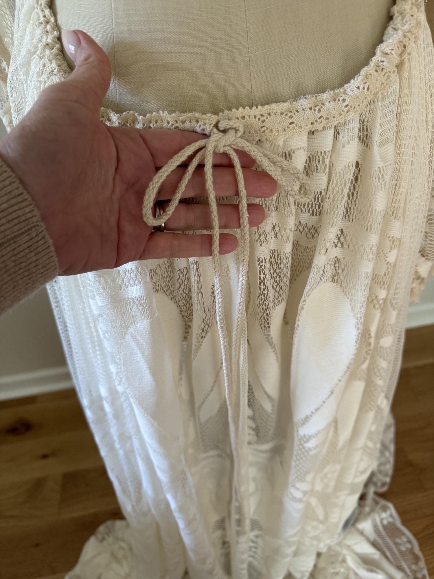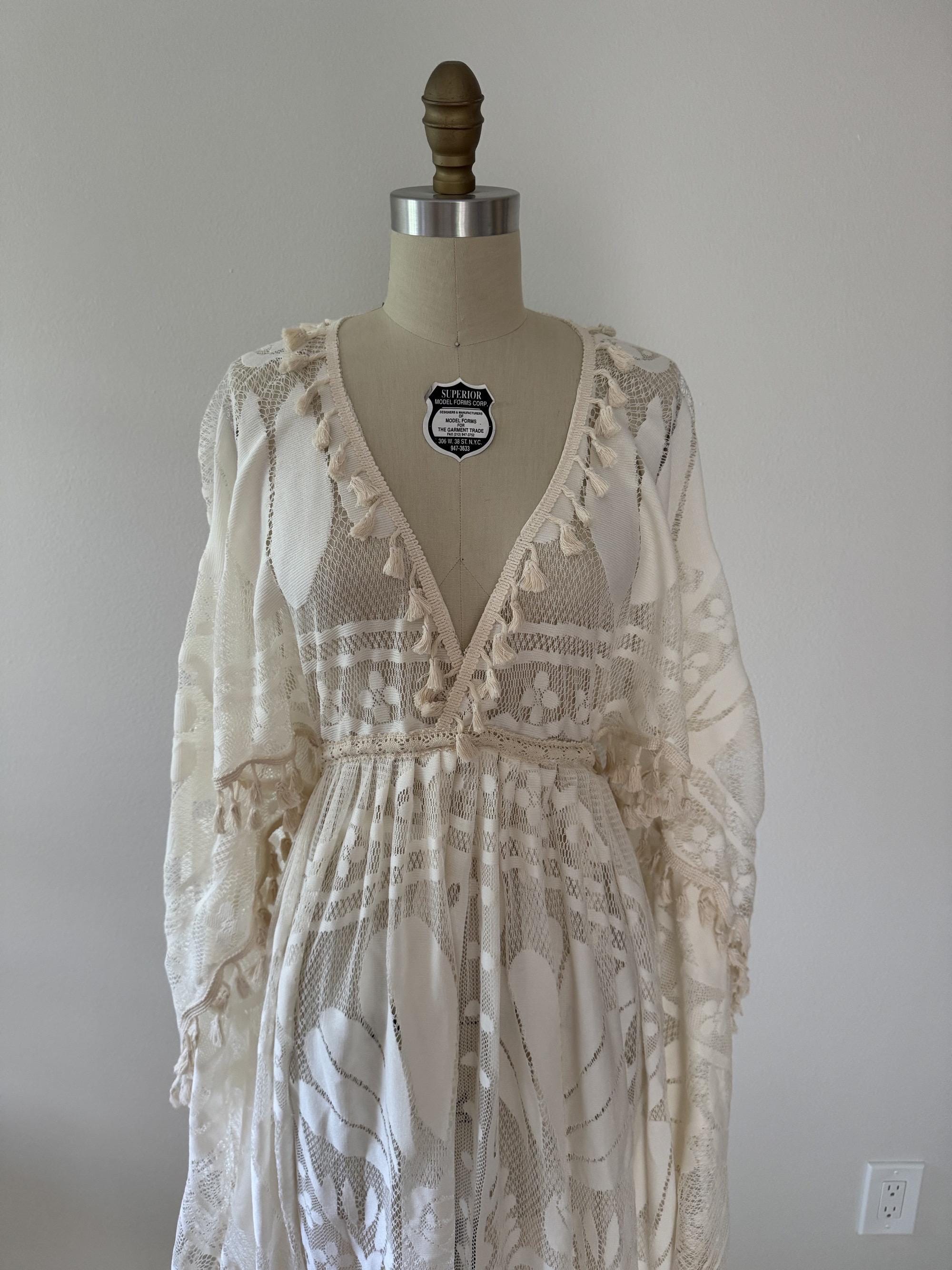 Features • Ready to ship boho bridal gown • Handmade in ivory / cream beige crochet lace • Plunging neckline and open back • Oversized bell sleeves with crochet fringe • Adjustable drawstring waist for flexible fit • Draped skirt with side slits for effortless movement • Sheer and unlined