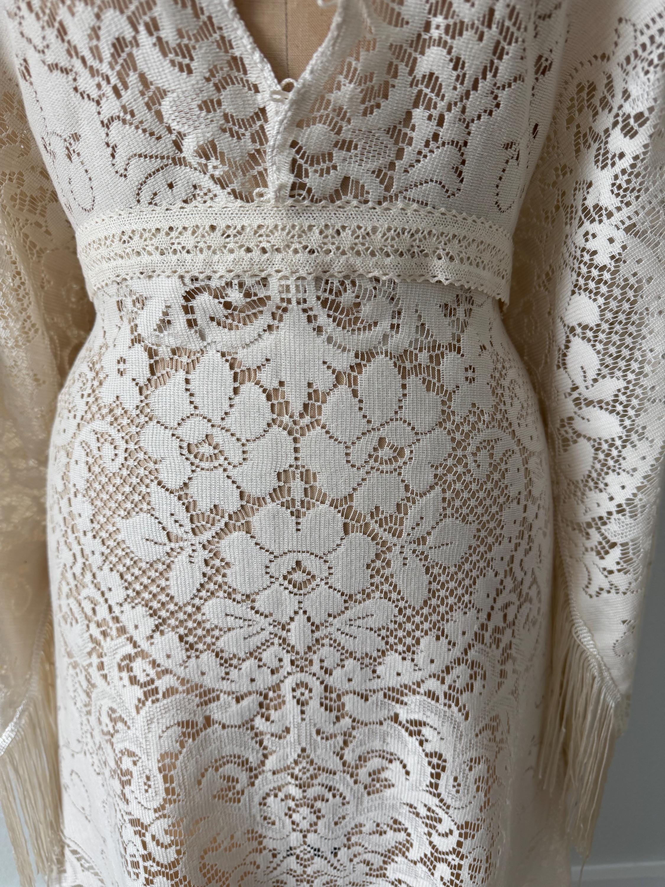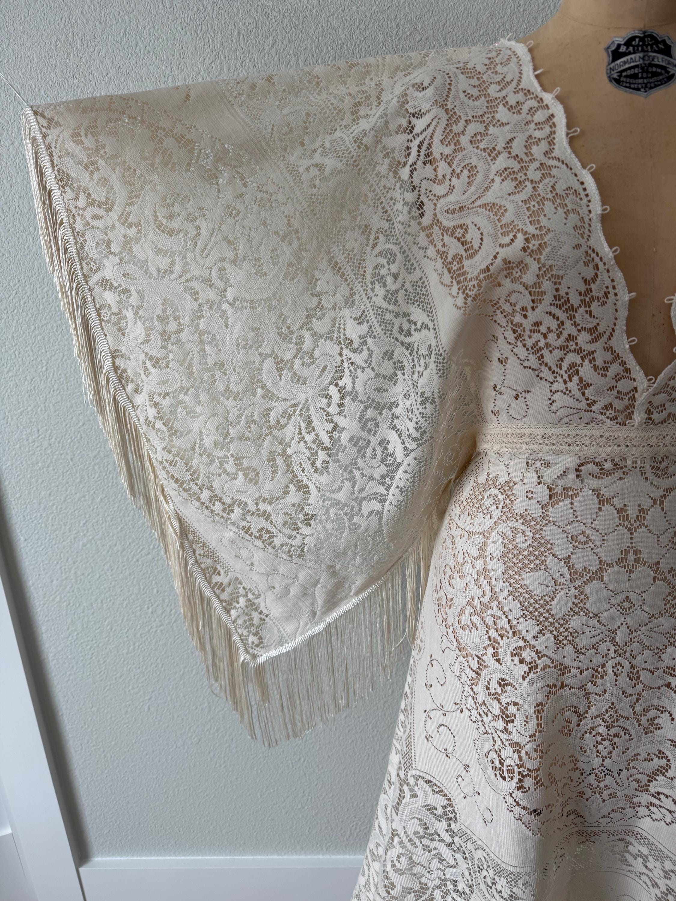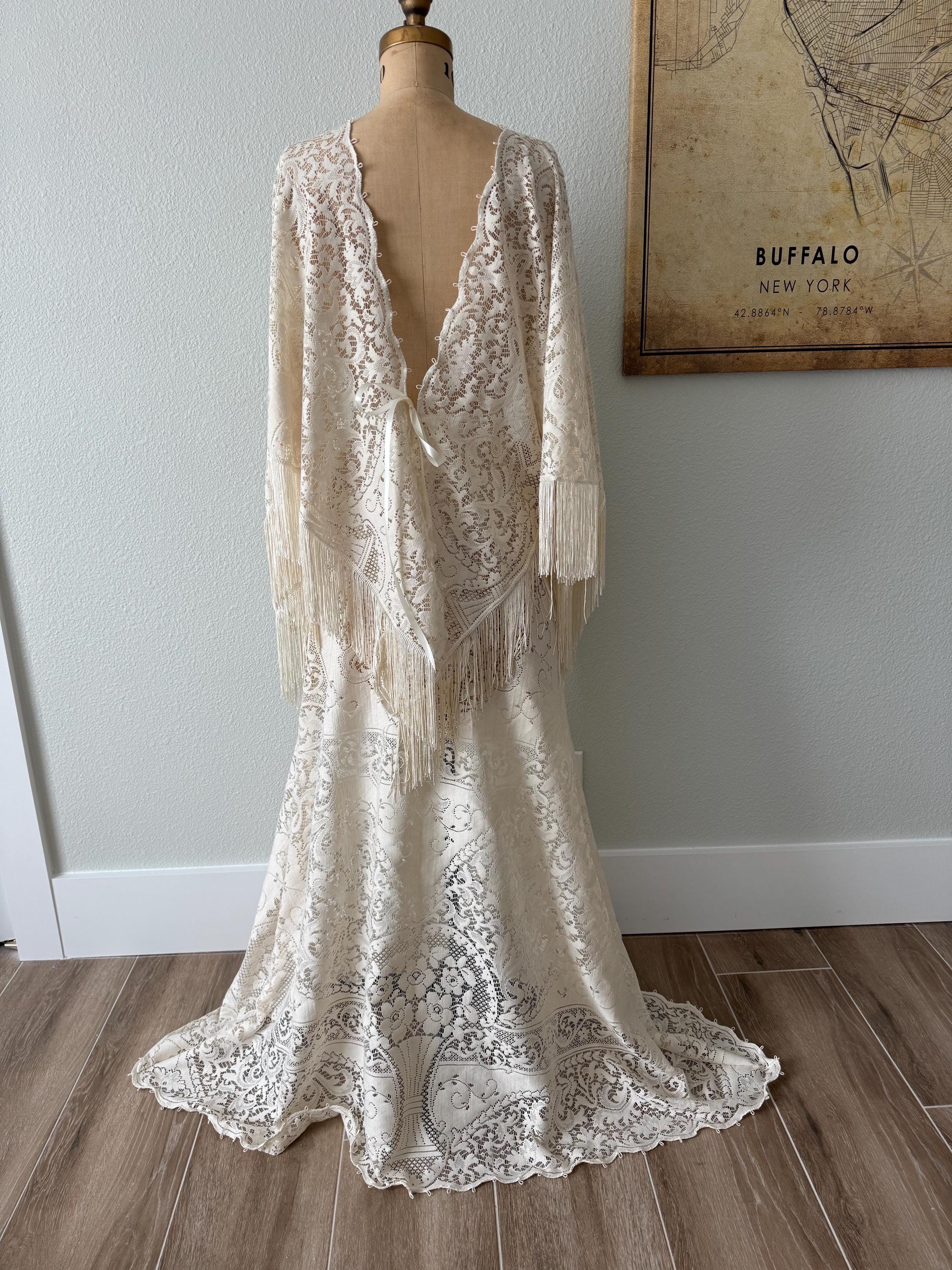 Step into a bohemian dream with this vintage lace wedding gown, featuring signature fringe bell sleeves and a flowing, draped skirt that captures the light with every movement. This ethereal dress is a versatile masterpiece designed for romantic elopements, western-style weddings, and bridal photography. Crafted from coordinated vintage lace, it offers a timeless, airy aesthetic. This design is available in your choice of classic white/off-white or the warm cream and tan tones shown in the photos. Choose Your Fit: Ready to Ship or Custom Tailored I offer two ways to purchase this gown to ensure you get the perfect fit for your timeline and body type: 1. Ready to Ship (As Shown) This specific gown is handmade and ready to ship today. It features a freestyle top and an adjustable tie-waist that offers a flexible, flattering fit. • Fits up to: 36" Waist. • Hips: Measures 42" (taken 9" below the waist). • Length: Approximately 45" long in the front. • Model Note: Displayed on a form set to approximately 5'6". 2. Custom Tailored (Made to Order) If the "Ready to Ship" measurements aren't a perfect match, choose the "Custom" option at checkout. I will personally assist you with home measurements to tailor a new gown specifically to your height and size for a professional, high-end fit. Design Highlights • Fringe Bell Sleeves: Dramatic, vintage-inspired sleeves that add incredible movement and a touch of western flair. • Adjustable Versatility: The internal drawstring waist and freestyle bodice allow the gown to adapt to your shape, making it a flexible choice for various body types. • Artisan Materials: Hand-selected vintage lace in excellent condition. To preserve its one-of-a-kind charm, any minor time-honored character marks are expertly hidden within the design. • Sheer & Layerable: This unlined gown is best paired with a deep-V slip, plunging bra, or bodysuit to complete your bridal look.