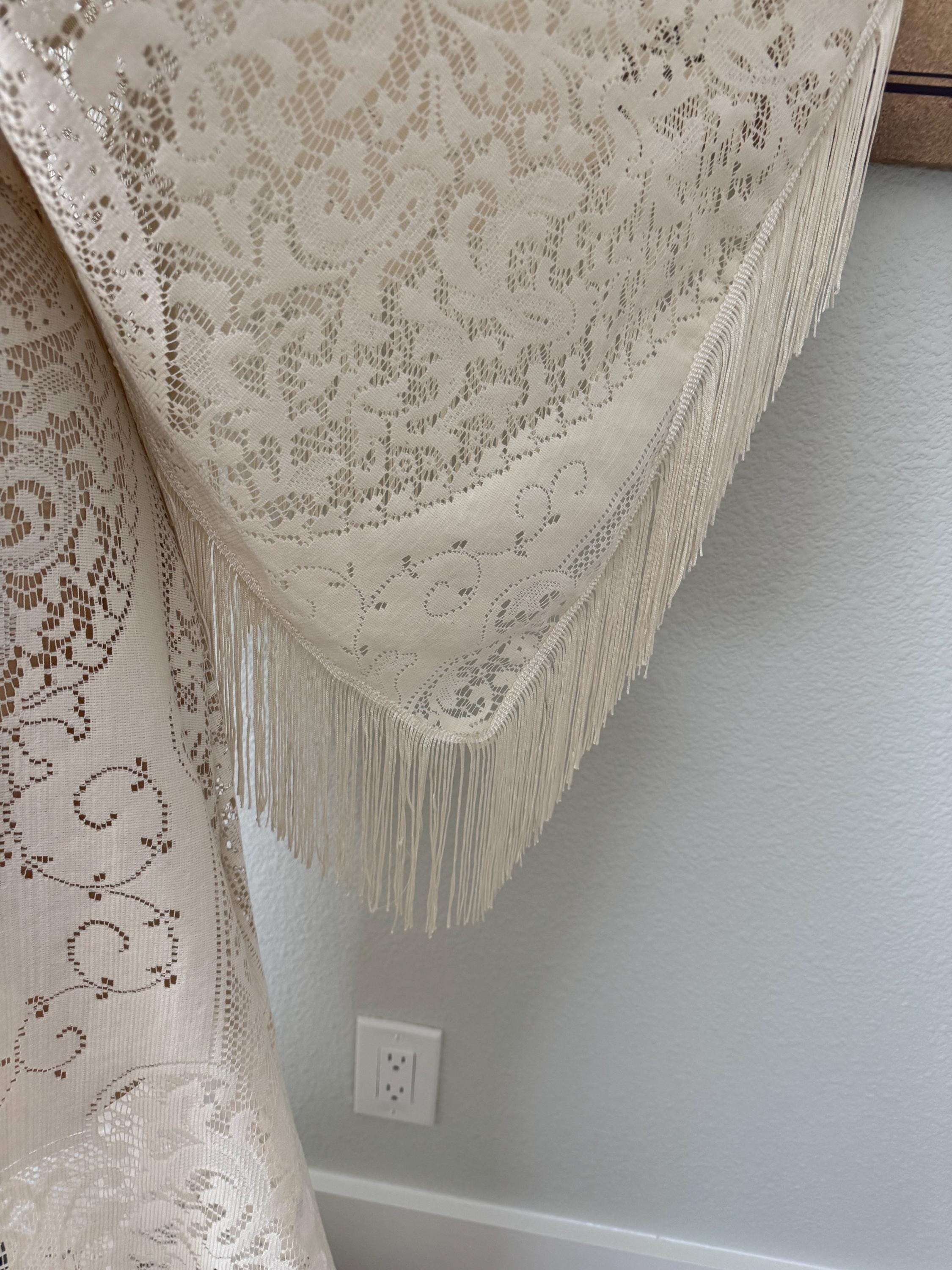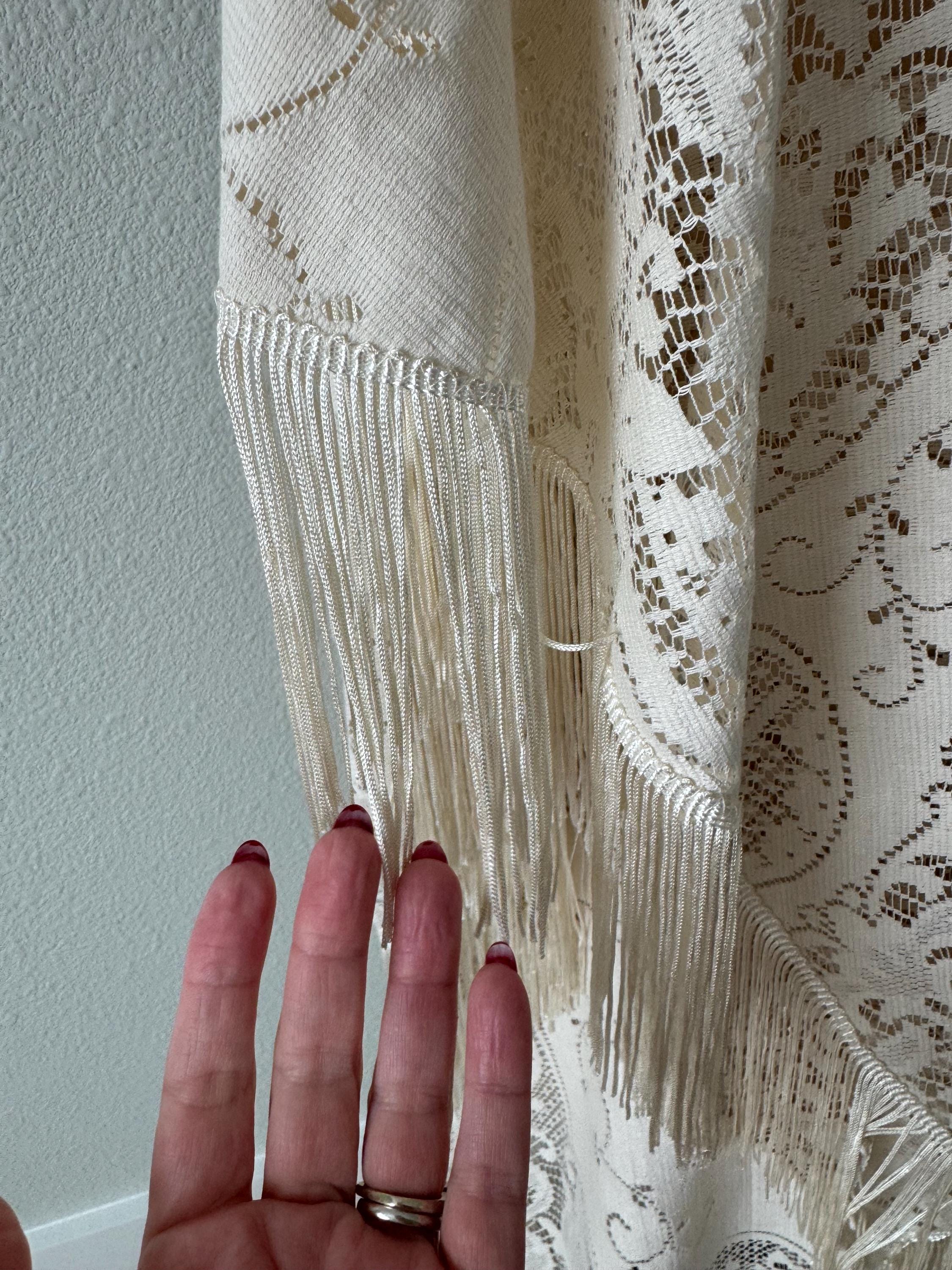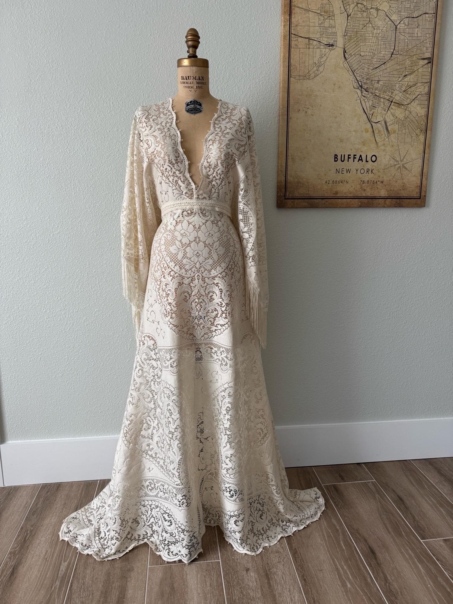 Step into a bohemian dream with this vintage lace wedding gown, featuring signature fringe bell sleeves and a flowing, draped skirt that captures the light with every movement. This ethereal dress is a versatile masterpiece designed for romantic elopements, western-style weddings, and bridal photography. Crafted from coordinated vintage lace, it offers a timeless, airy aesthetic. This design is available in your choice of classic white/off-white or the warm cream and tan tones shown in the photos. Choose Your Fit: Ready to Ship or Custom Tailored I offer two ways to purchase this gown to ensure you get the perfect fit for your timeline and body type: 1. Ready to Ship (As Shown) This specific gown is handmade and ready to ship today. It features a freestyle top and an adjustable tie-waist that offers a flexible, flattering fit. • Fits up to: 36" Waist. • Hips: Measures 42" (taken 9" below the waist). • Length: Approximately 45" long in the front. • Model Note: Displayed on a form set to approximately 5'6". 2. Custom Tailored (Made to Order) If the "Ready to Ship" measurements aren't a perfect match, choose the "Custom" option at checkout. I will personally assist you with home measurements to tailor a new gown specifically to your height and size for a professional, high-end fit. Design Highlights • Fringe Bell Sleeves: Dramatic, vintage-inspired sleeves that add incredible movement and a touch of western flair. • Adjustable Versatility: The internal drawstring waist and freestyle bodice allow the gown to adapt to your shape, making it a flexible choice for various body types. • Artisan Materials: Hand-selected vintage lace in excellent condition. To preserve its one-of-a-kind charm, any minor time-honored character marks are expertly hidden within the design. • Sheer & Layerable: This unlined gown is best paired with a deep-V slip, plunging bra, or bodysuit to complete your bridal look.
