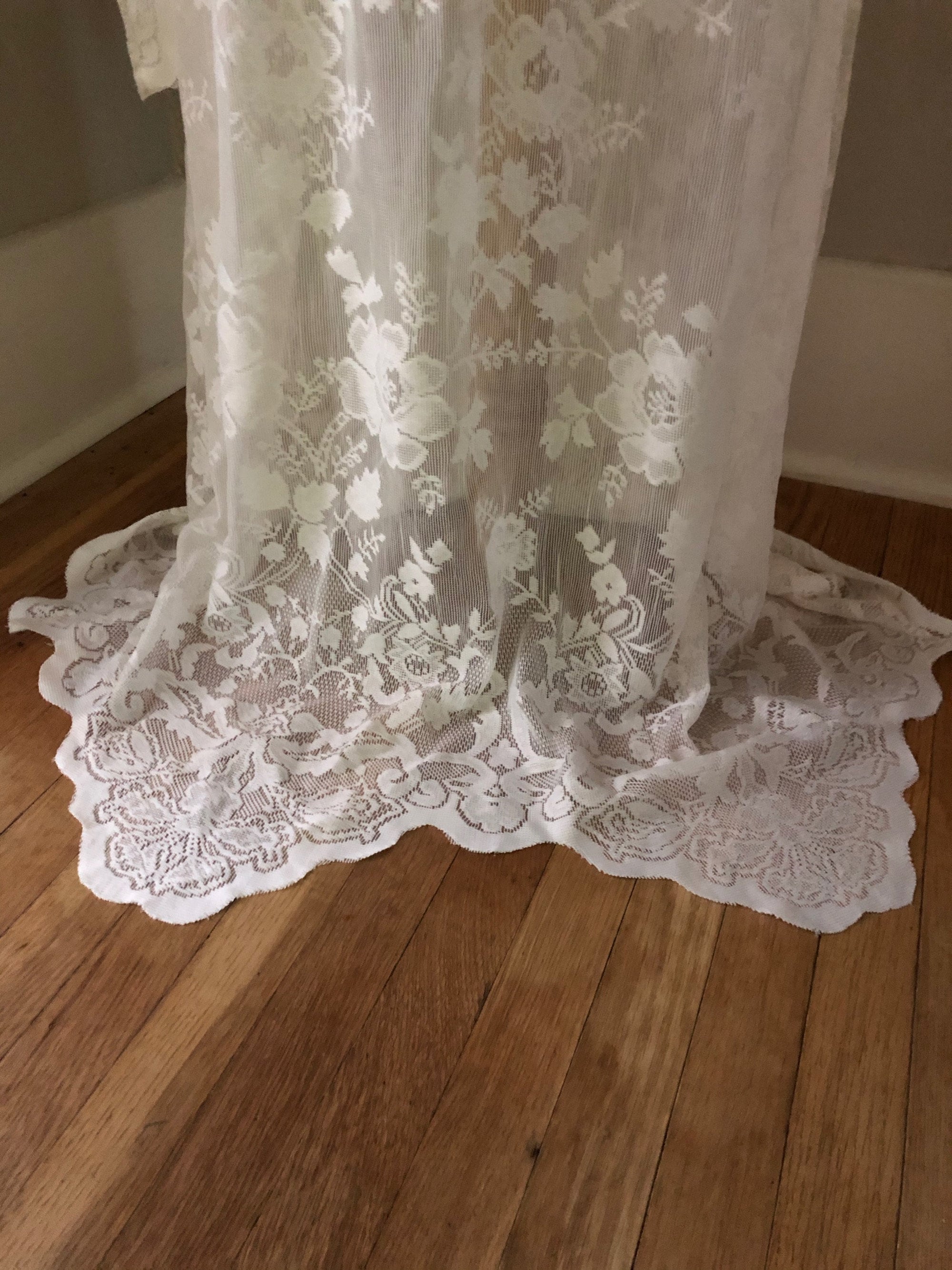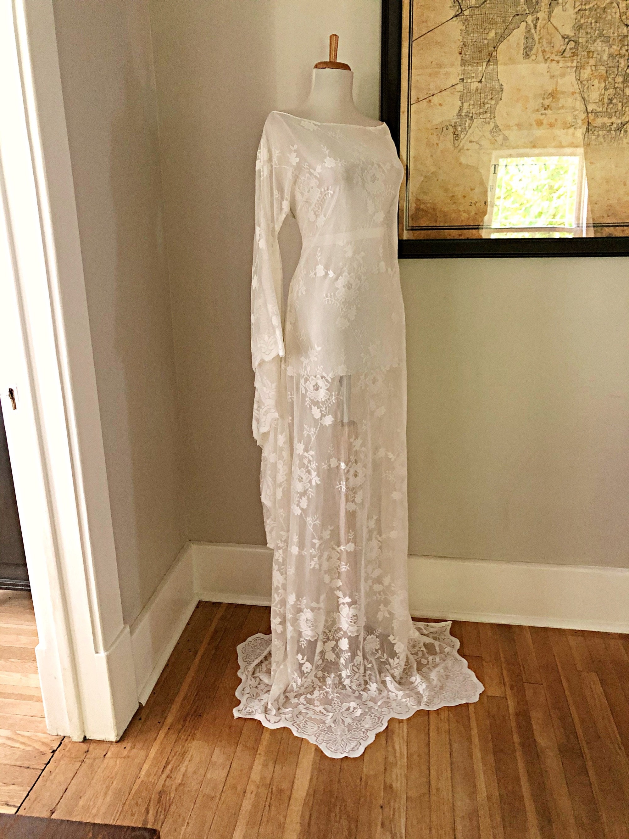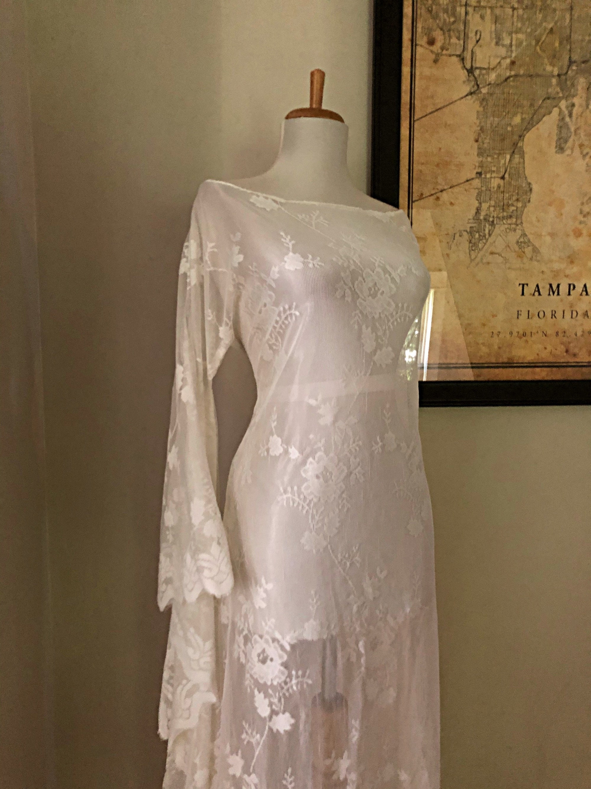 This dress is made with a cream / off-white cut out sheer crochet lace that is most likely a cotton blend, nylon or polyester/poly-blend. This would be perfect for a boho bride, Art Deco wedding or a beach or desert wedding. Also a great look at the summer music festivals.