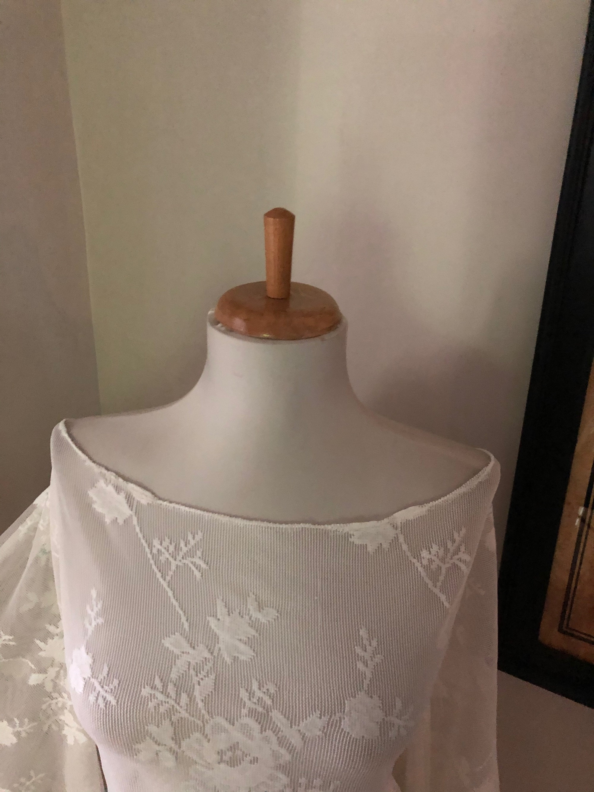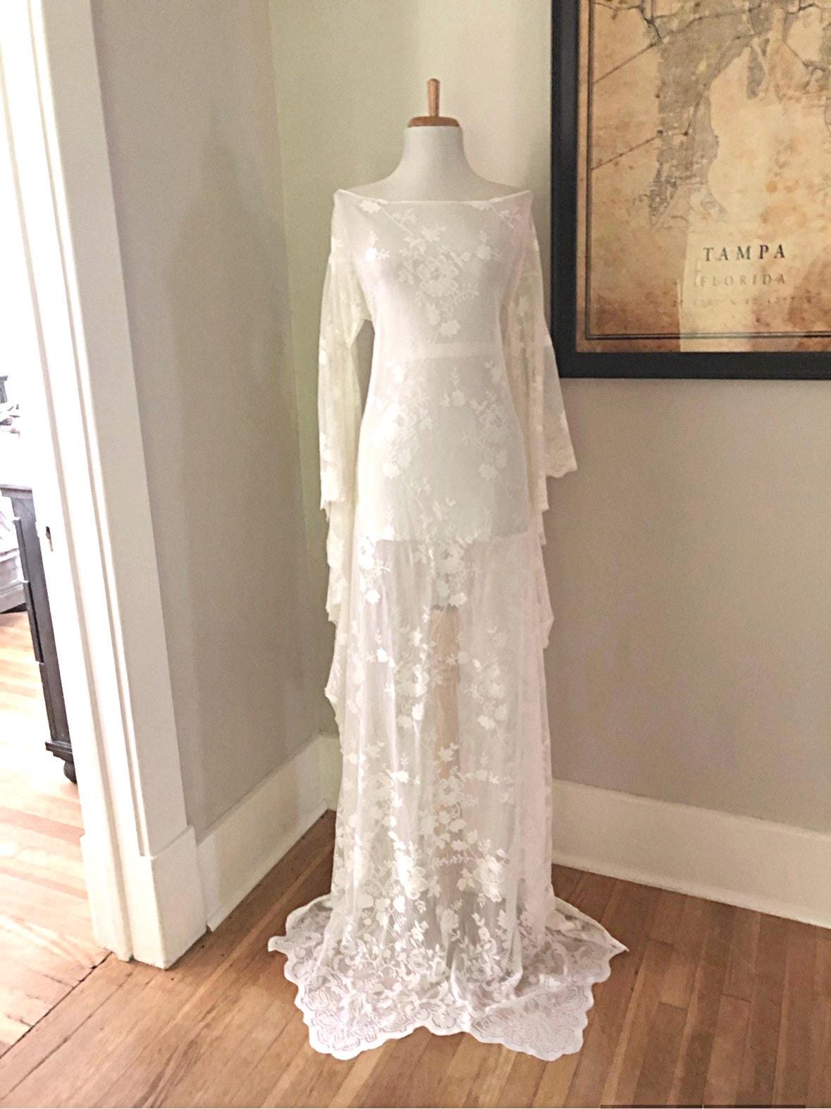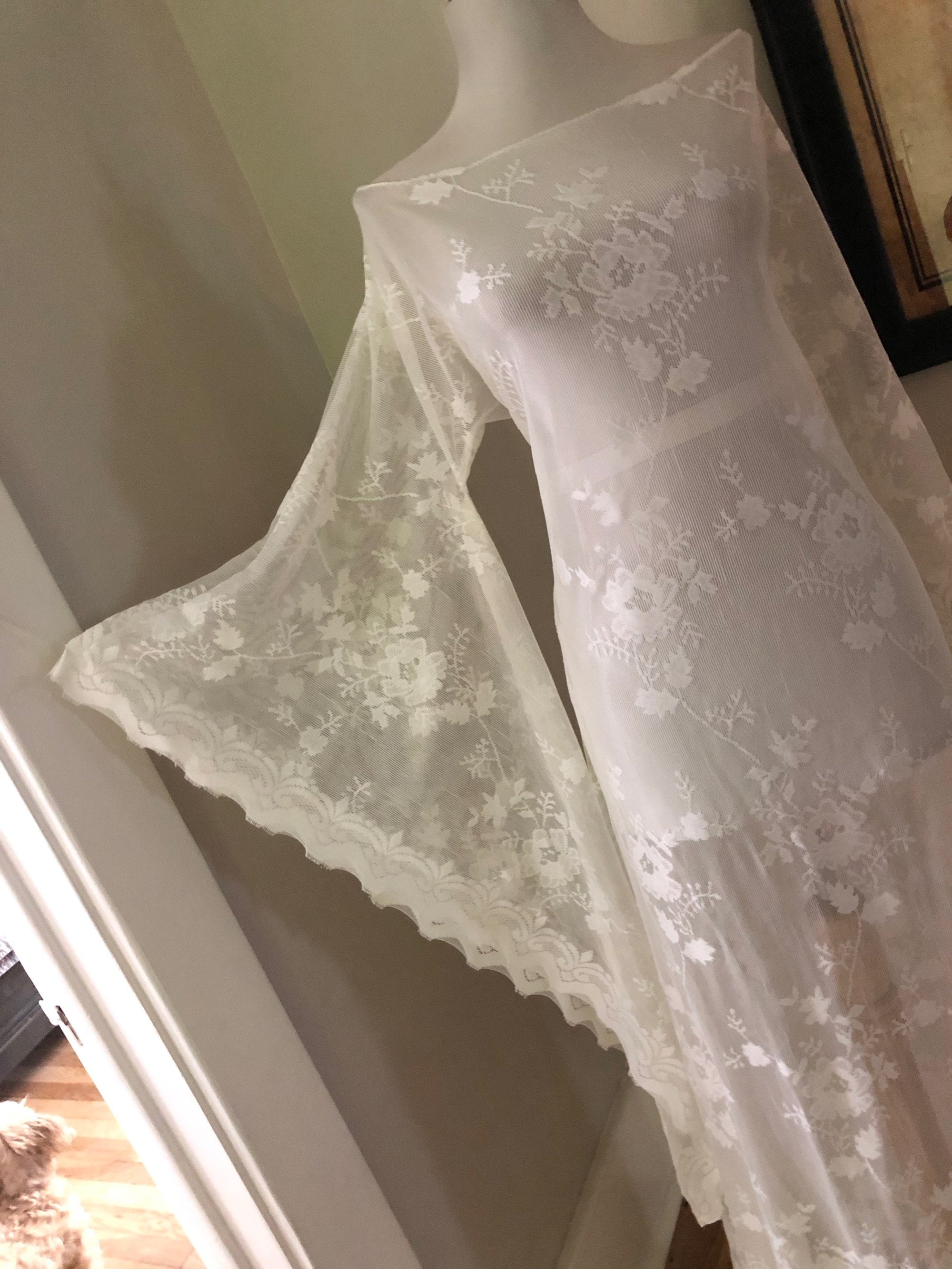 This dress is unlined with huge bell /angel wing sleeves, a feminine neckline (off the shoulder on some), sheer peek-a-boo crochet lace, a scalloped hem, and a sexy feminine cut. This goes over the head (no zipper). This has uncomplicated side seams that could easily be taken in if this is too big