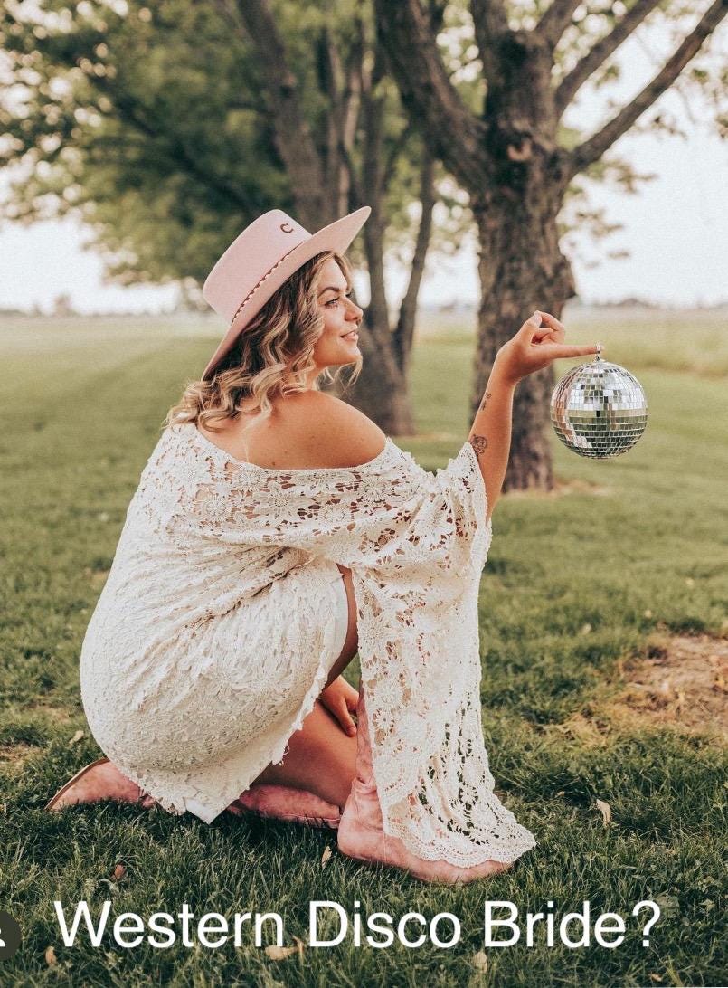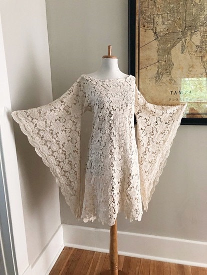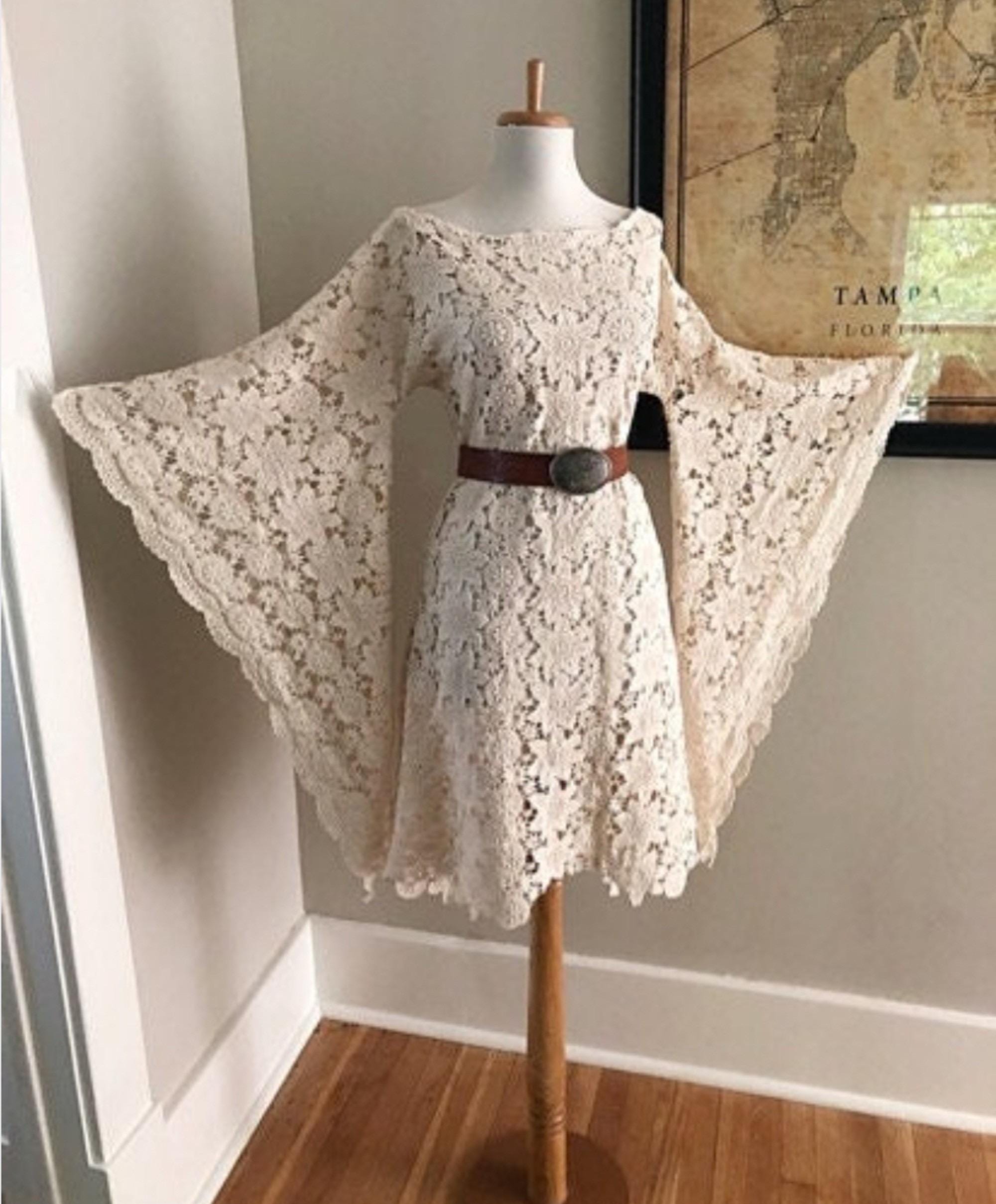 BoHo Sheer Cream Crochet CUT OUT LACE Angel Bell Sleeve Mini Hippie Wedding Dress Custom Handmade