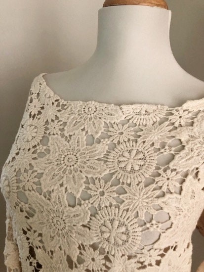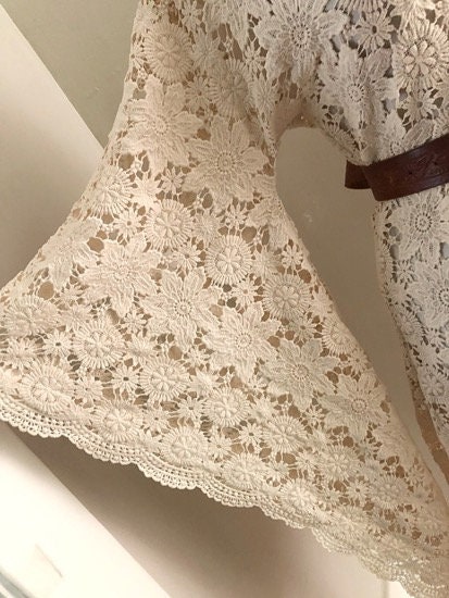 This women's bohemian hippie dress is made with a cream sheer cut out vintage crochet guipure lace that is most likely 100% cotton or a cotton blend. This would be perfect for a bohemian bride or a boho desert wedding. Also a great look at the summer music festivals. The is unlined, the front and back are the same and it goes over the head (no zipper). This has uncomplicated side seams that could easily be taken in if this is too big.