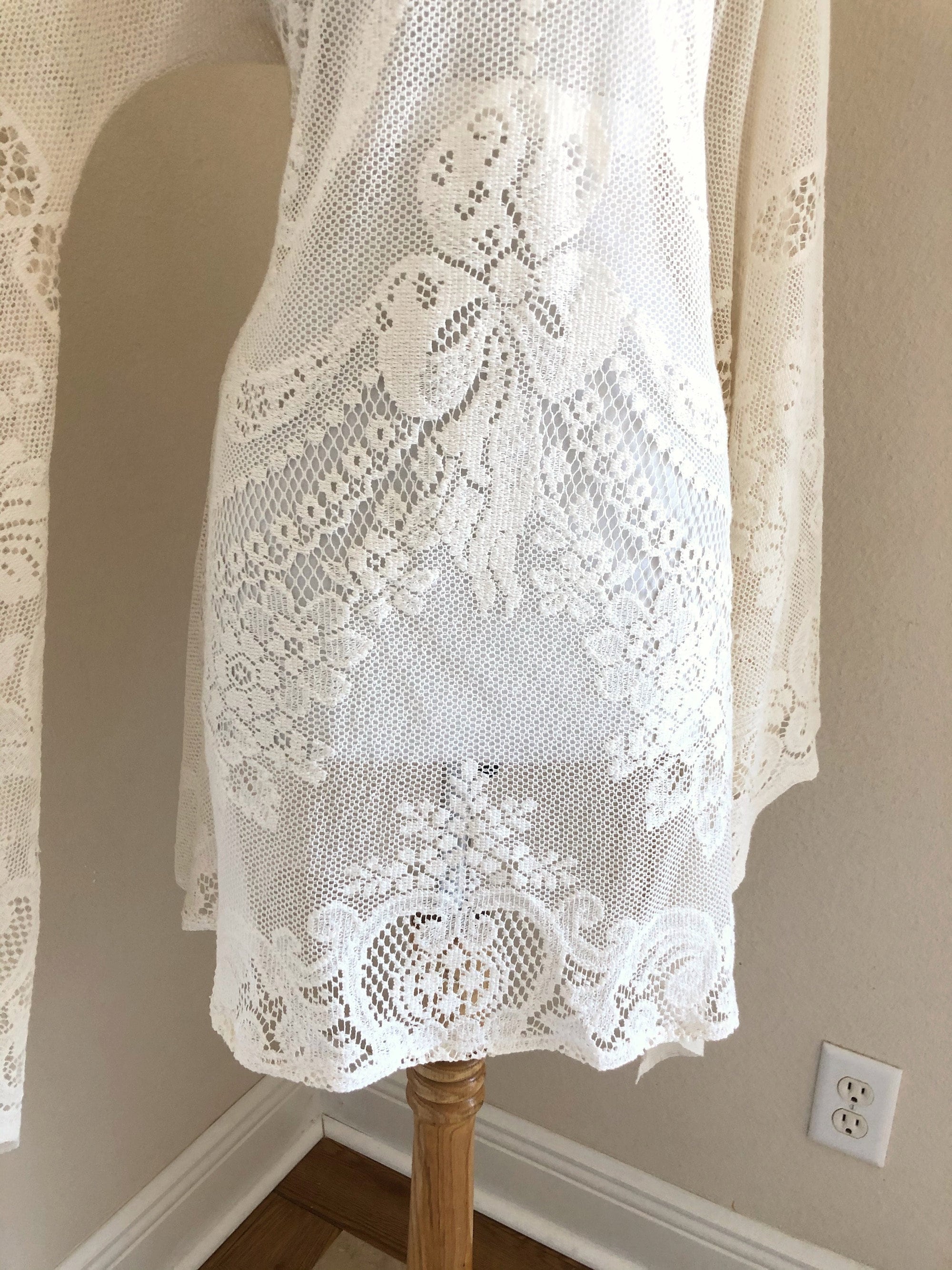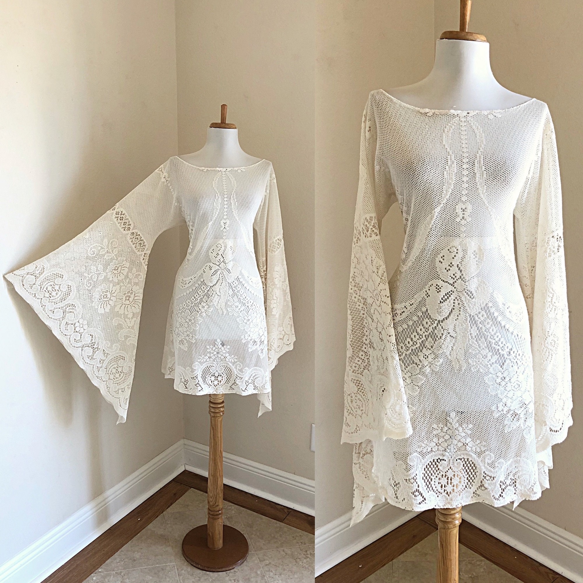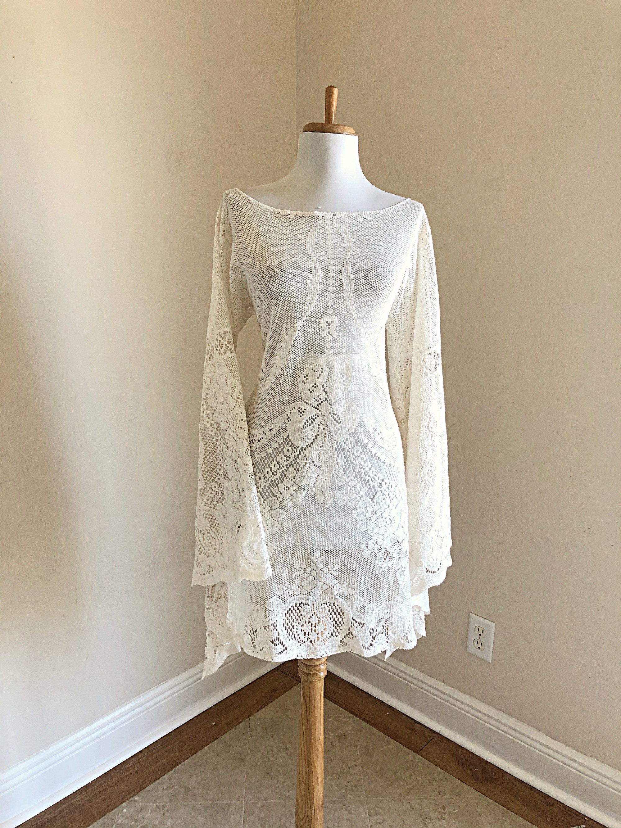 This bohemian short lace dress was made with cream cut-out crochet lace that is most likely 100% cotton or a cotton blend. This would be perfect for a boho bride or a desert wedding. Also a great look at the summer music festivals. This dress is unlined with huge bell /angel wing sleeves, a shorter cut, a feminine neckline that may be off the shoulder, sheer peek-a-boo crochet lace, and a sexy feminine cut. The front and back are the same and it goes over the head (no zipper). This has uncomplicated side seams that could easily be taken in if this is too big.