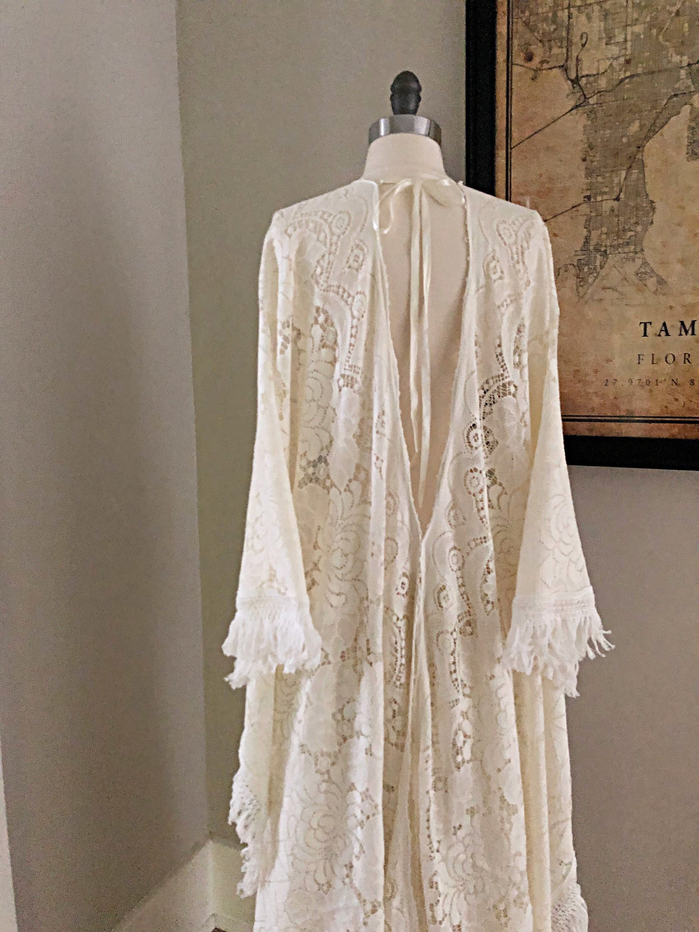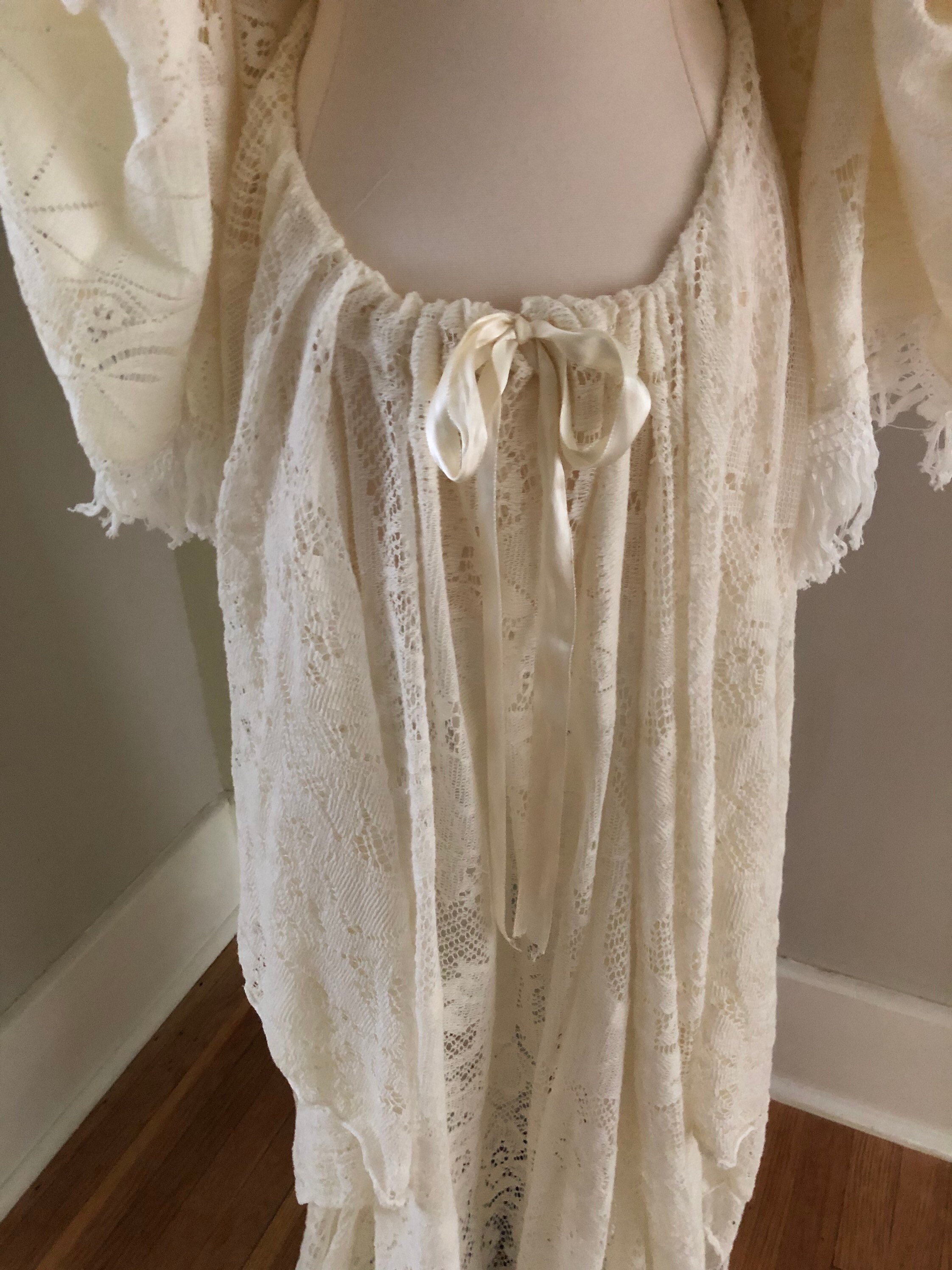 This boho deep v draped wedding photoshoot dress is made with cream / off-white cut out sheer crochet lace that is made with vintage cotton / cotton-blend lace. This style will work for a bunch of different sizes and occasions. I made the back and waist adjustable so that it could even work for maternity photos. This is a custom made dress. Each piece of lace is unique. I can make this in white, ivory, black or beige but I can't make the same dress twice.