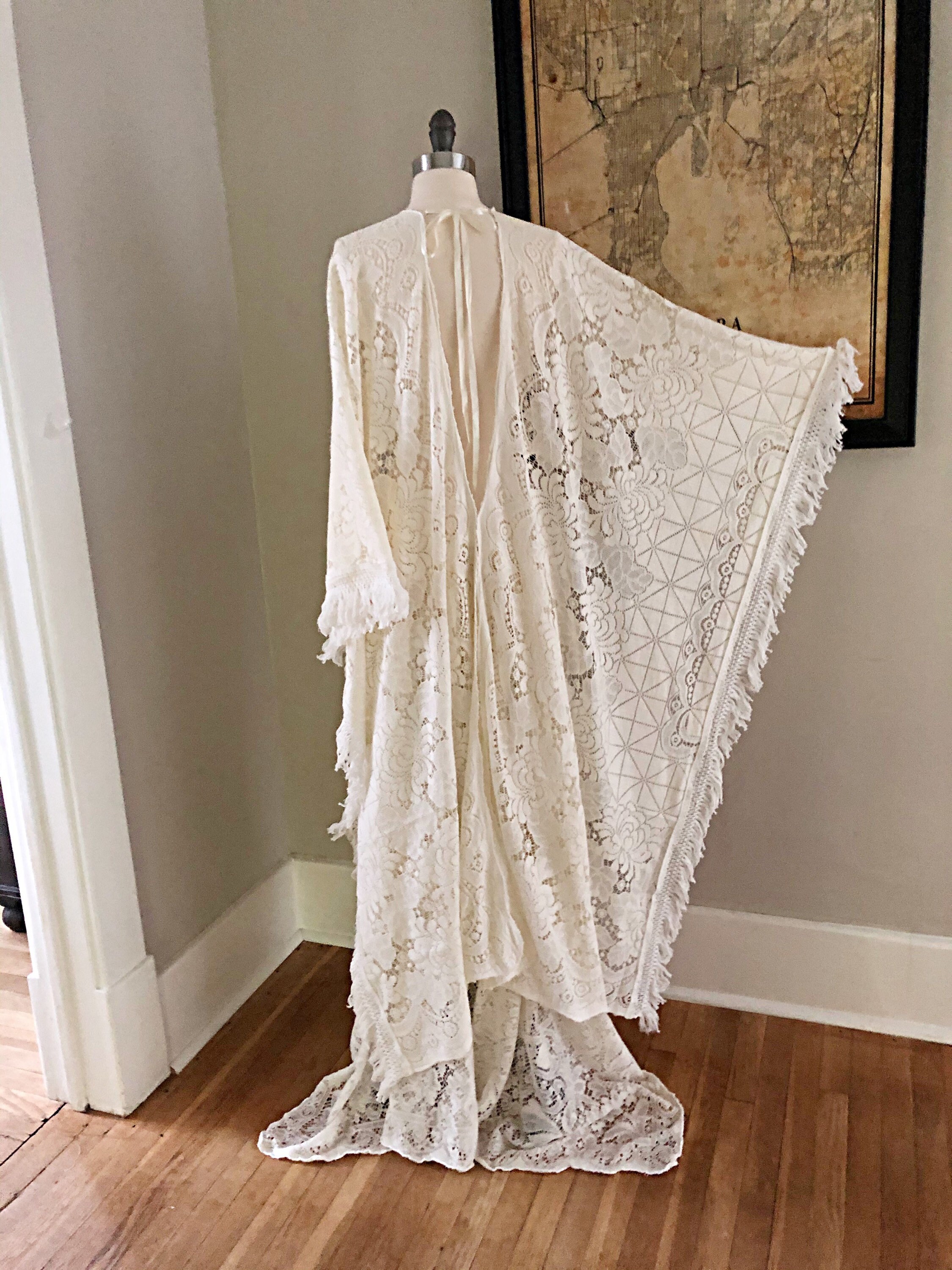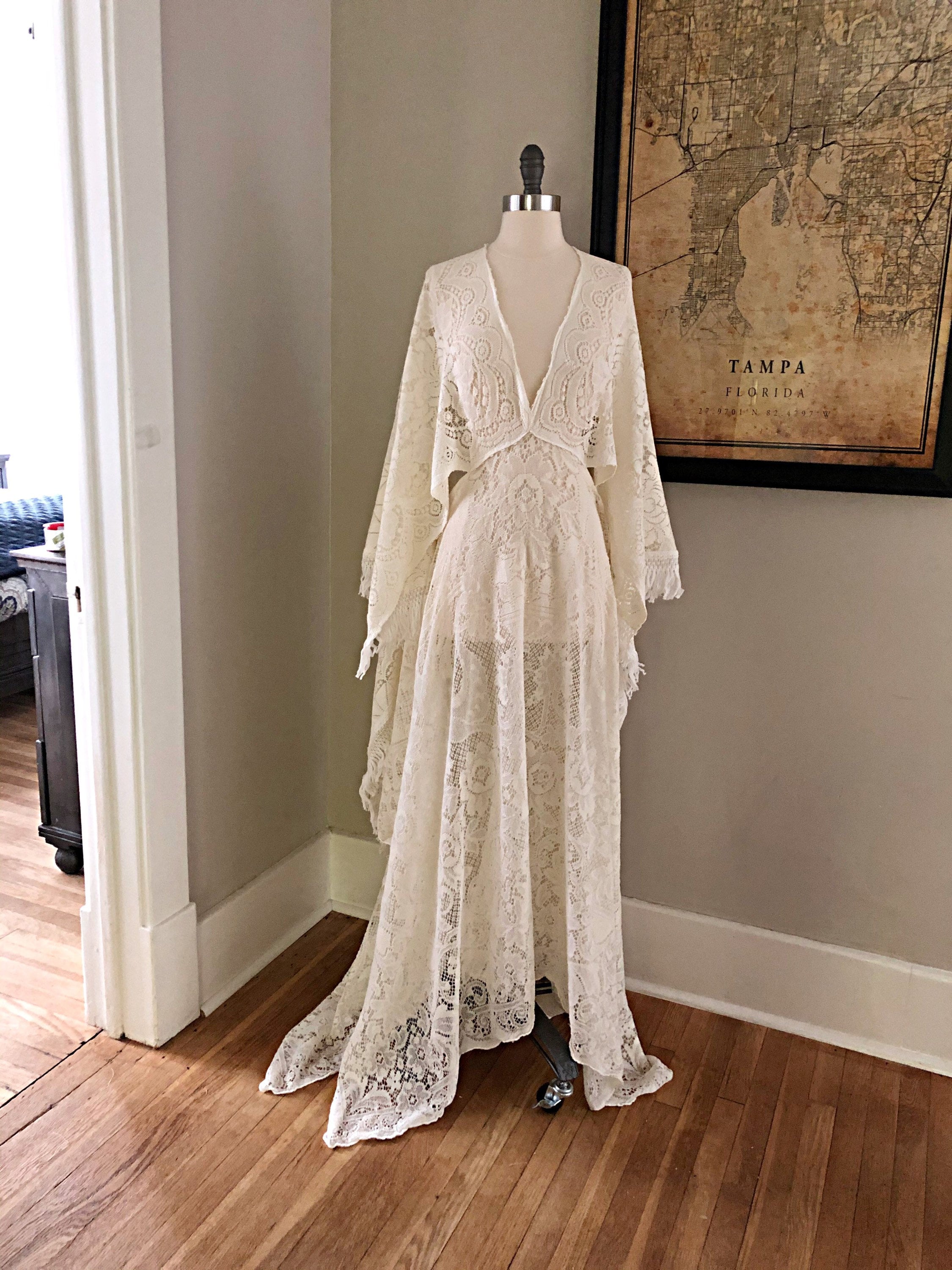 The lace for each dress will be in good condition but some randoms light spots here and there, thread breaks, may be found if you search for them. I do my best to find lace with the least amount of flaws and try to hide any imperfections I find.The lace is very old and the dress has been made by hand so do not expect perfect symmetry. Vintage lace is delicate, make sure it will fit prior to purchase. I do not offer cancellations or returns. All sales are final. Please email me if you have any questions or need more measurements.