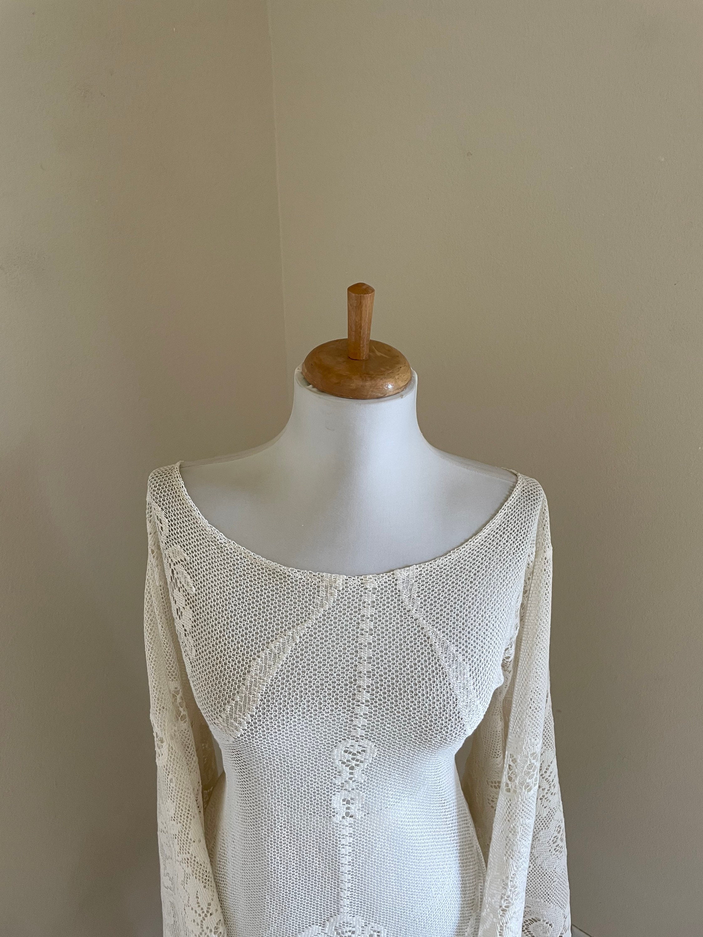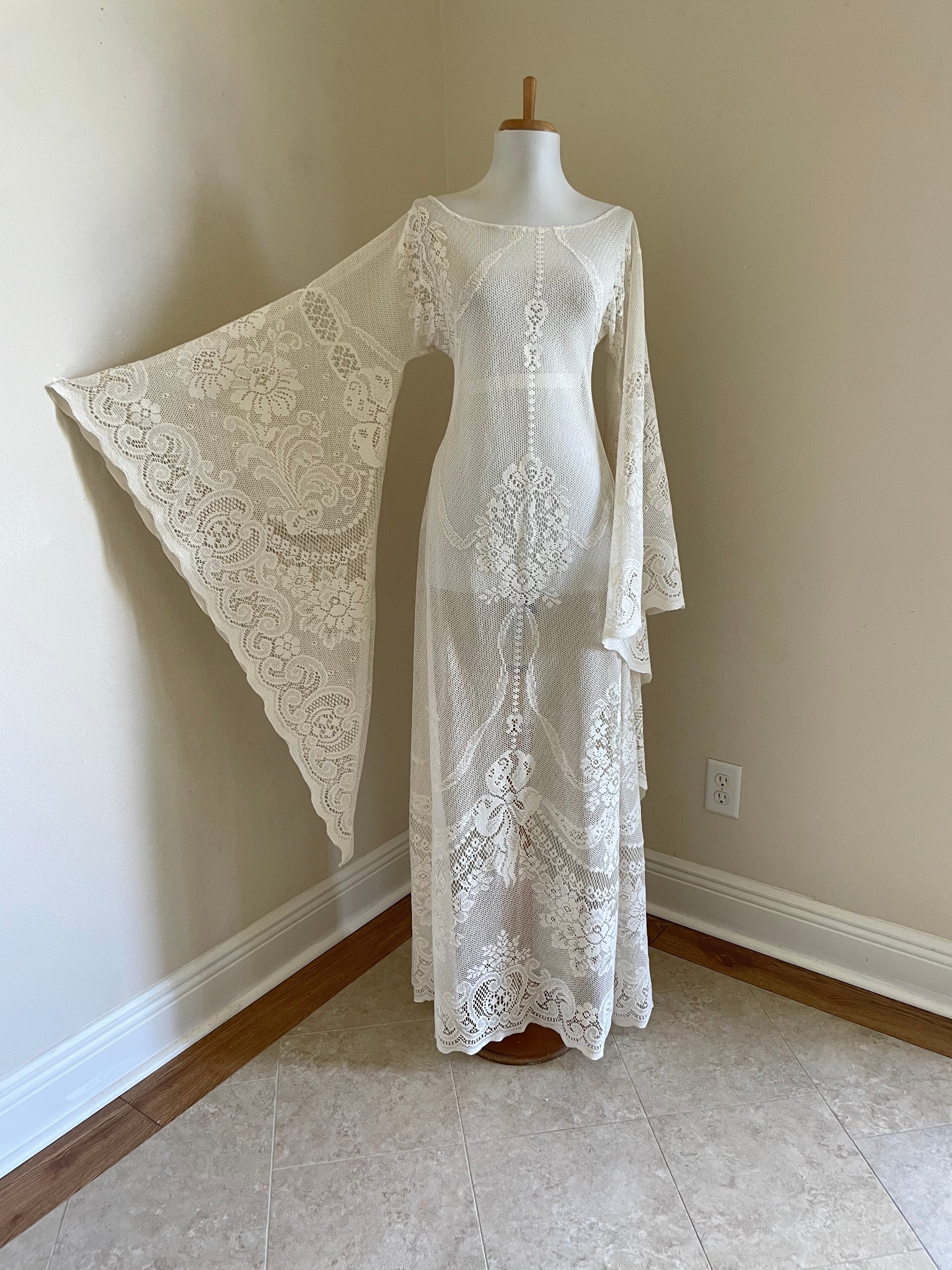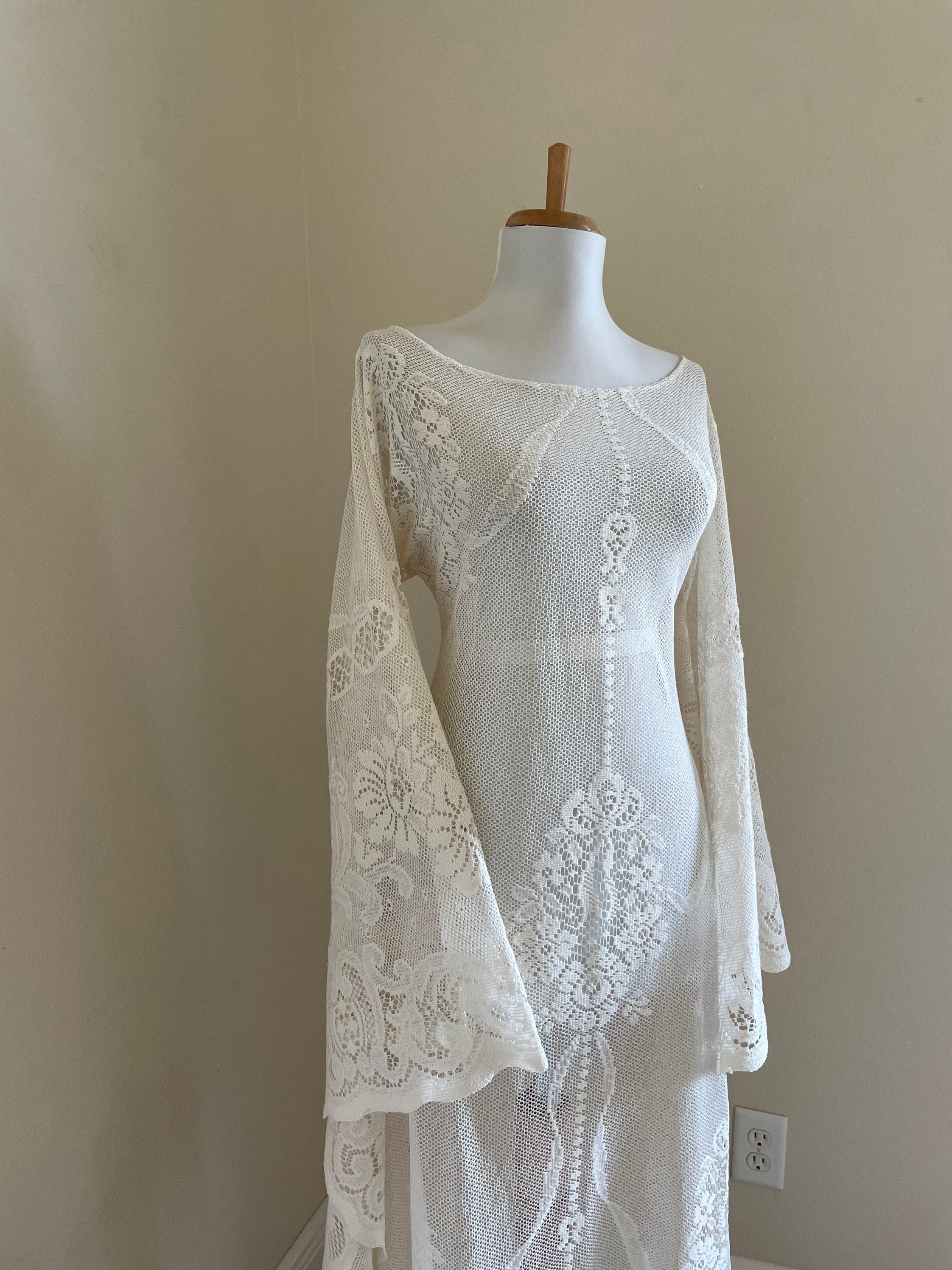 This long sleeve boho lace dress is made with cream or ivory cut-out sheer crochet lace that is most likely a cotton blend. This would be perfect for a boho bride or a beach desert wedding. Also a great look at the summer music festivals. This dress is unlined with huge bell /angel wing sleeves, a feminine neckline that may be off the shoulder on some, sheer peek-a-boo crochet lace (shown with a strapless slip not included), and a sexy feminine cut. This goes over the head (no zipper). This has uncomplicated side seams that could easily be taken in if this is too big.